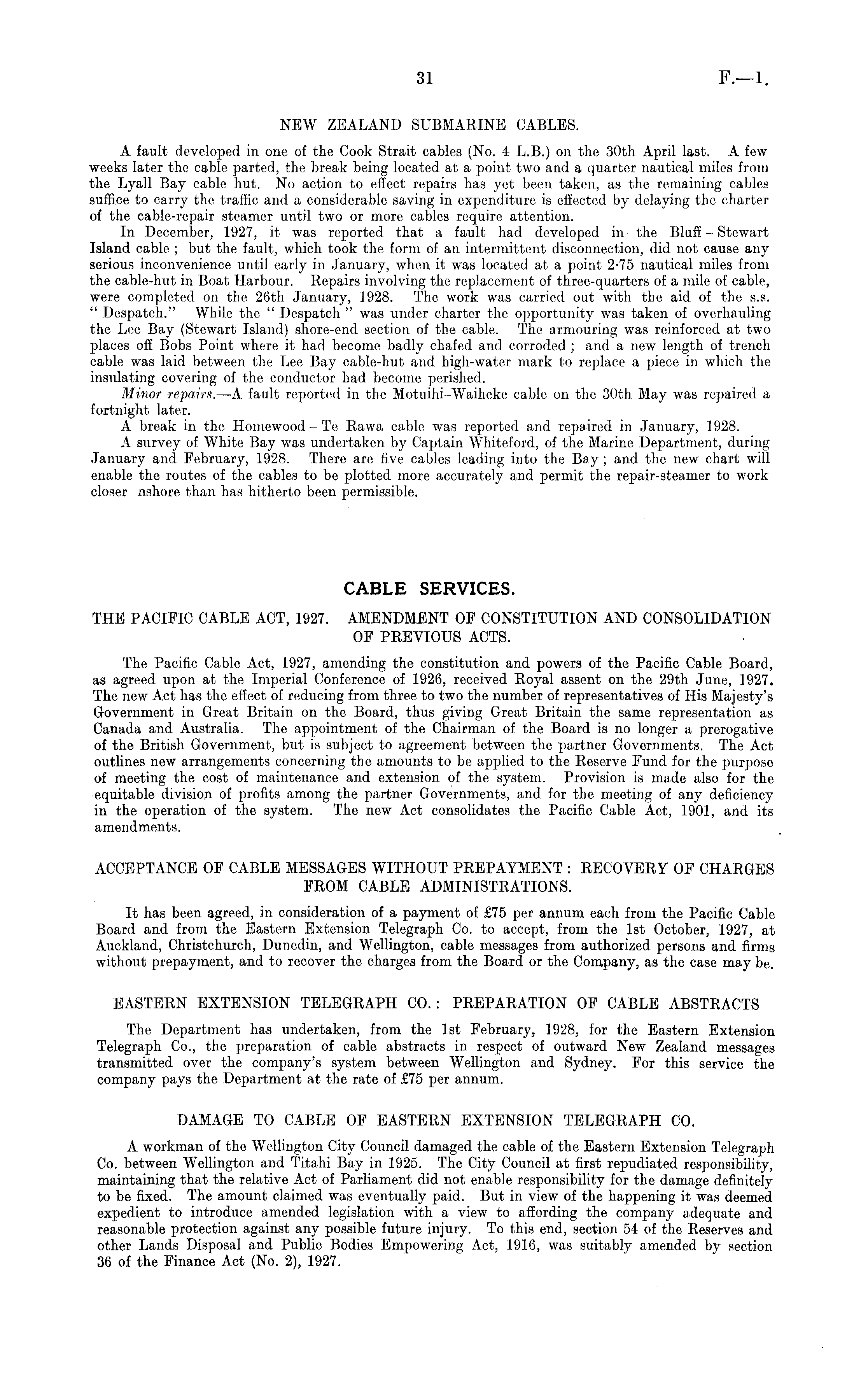 NEW ZEALAND SUBMARINE CABLES. A fault developed in one of the Cook Strait cables (No. 4 L.8.) on the 30th April last. A fewweeks later the cable parted, the break being located at a point two and a quarter nautical miles from the Lyall Bay cable hut. No action to effect repairs has yet been taken, as the remaining cables suffice to carry the traffic and. a considerable saving in expenditure is effected by delaying the charter of the cable-repair steamer until two or more cables require attention. In December, 1927, it was reported that a fault had developed in-the Bluff - Stewart Island cable ; but the fault, which took the form of an intermittent disconnection, did not cause any serious inconvenience until early in January, when it was located at a point 2-75 nautical miles from the cable-hut in Boat Harbour. Repairs involving the replacement of three-quarters of a mile of cable, were completed on the 26th January, 1928. The work was carried out with the aid of the 8.8. " Despatch." While the " Despatch " was under charter the opportunity was taken of overhauling the Lee Bay (Stewart Island) shore-end section of the cable. The armouring was reinforced at two places off Bobs Point where it had. become badly chafed and corroded ; and a new length of trench cable was laid between the Lee Bay cable-hut and high-water mark to replace a piece in which the insulating covering of the conductor had become perished. Minor repairs. —A fault reported in the Motuihi-Waiheke cable on the 30th May was repaired a fortnight later. A break in the Homewood - Te Rawa cable was reported and repaired in January, 1928. A survey of White Bay was undertaken by Captain Whiteford, of the Marine Department, during January and February, 1928. There are five cables leading into the Bay ; and the new chart will enable the routes of the cables to be plotted more accurately and permit the repair-steamer to work closer nshore than has hitherto been permissible. CABLE SERVICES. THE PACIFIC CABLE ACT, 1927. AMENDMENT OF CONSTITUTION AND CONSOLIDATION OF PREVIOUS ACTS. The Pacific Cable Act, 1927, amending the constitution and powers of the Pacific Cable Board, as agreed upon at the Imperial Conference of 1926, received Royal assent on the 29th June, 1927. The new Act has the effect of reducing from three to two the number of representatives of His Majesty's Government in Great Britain on the Board, thus giving Great Britain the same representation as Canada and Australia. The appointment of the Chairman of the Board is no longer a prerogative of the British Government, but is subject to agreement between the partner Governments. The Act outlines new arrangements concerning the amounts to be applied to the Reserve Fund for the purpose of meeting the cost of maintenance and extension of the system. Provision is made also for the equitable division of profits among the partner Governments, and for the meeting of any deficiency in the operation of the system. The new Act consolidates the Pacific Cable Act, 1901, and its amendments. ACCEPTANCE OF CABLE MESSAGES WITHOUT PREPAYMENT : RECOVERY OF CHARGES FROM CABLE ADMINISTRATIONS. It has been agreed, in consideration of a payment of £75 per annum each from the Pacific Cable Board and from the Eastern Extension Telegraph Co. to accept, from the Ist October, 1927, at Auckland, Christchurch, Dunedin, and Wellington, cable messages from authorized persons and firms without prepayment, and to recover the charges from the Board or the Company, as the case may be. EASTERN EXTENSION TELEGRAPH CO.: PREPARATION OF CABLE ABSTRACTS The Department has undertaken, from the Ist February, 1928, for the Eastern Extension Telegraph Co., the preparation of cable abstracts in respect of outward New Zealand messages transmitted over the company's system between Wellington and Sydney. For this service the company pays the Department at the rate of £75 per annum. DAMAGE TO CABLE OF EASTERN EXTENSION TELEGRAPH CO. A workman of the Wellington City Council damaged the cable of the Eastern Extension Telegraph Co. between Wellington and Titahi Bay in 1925. The City Council at first repudiated responsibility, maintaining that the relative Act of Parliament did not enable responsibility for the damage definitely to be fixed. The amount claimed was eventually paid. But in view of the happening it was deemed expedient to introduce amended legislation with a view to affording the company adequate and reasonable protection against any possible future injury. To this end, section 54 of the Reserves and other Lands Disposal and Public Bodies Empowering Act, 1916, was suitably amended by section 36 of the Finance Act (No. 2), 1927.