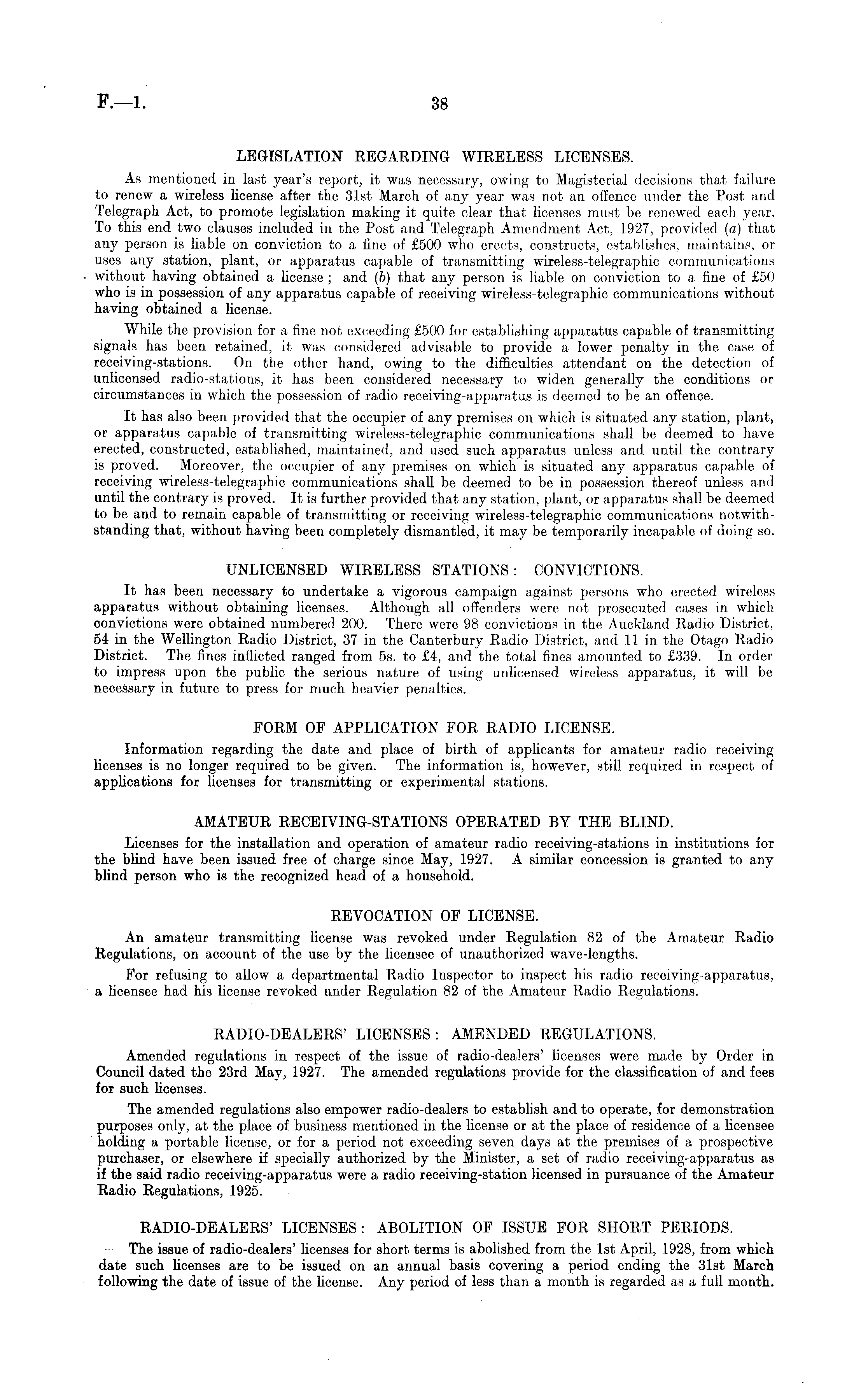 LEGISLATION REGARDING WIRELESS LICENSES. As mentioned in last year's report, it was necessary, owing to Magisterial decisions that failure to renew a wireless license after the 31st March of any year was not an offence under the Post and Telegraph Act, to promote legislation making it quite clear that licenses must be renewed each year. To this end two clauses included in the Post and Telegraph Amendment Act, 1.927, provided (a) that any person is liable on conviction to a fine of £500 who erects, constructs, establishes, maintains, or uses any station, plant, or apparatus capable of transmitting wireless-telegraphic communications without having obtained a license ; and (b) that any person is liable on conviction to a fine of £50 who is in possession of any apparatus capable of receiving wireless-telegraphic communications without having obtained a license. While the provision for a fine not exceeding £500 for establishing apparatus capable of transmitting signals has been retained, it was considered advisable to provide a lower penalty in the case of receiving-stations. On the other hand, owing to the difficulties attendant on the detection of unlicensed radio-stations, it has been considered necessary to widen generally the conditions or circumstances in which the possession of radio receiving-apparatus is deemed to be an offenceIt has also been provided that the occupier of any premises on which is situated any station, plant, or apparatus capable of transmitting wireless-telegraphic communications shall be deemed to have erected, constructed, established, maintained, and used such apparatus unless and until the contrary is proved. Moreover, the occupier of any premises on which is situated any apparatus capable of receiving wireless-telegraphic communications shall be. deemed to be in possession thereof unless and until the contrary is proved. It is further provided that any station, plant, or apparatus shall be deemed to be and to remain capable of transmitting or receiving wireless-telegraphic communications notwithstanding that, without having been completely dismantled, it may be temporarily incapable of doing so. UNLICENSED WIRELESS STATIONS: CONVICTIONS. It has been necessary to undertake a vigorous campaign against persons who erected wireless apparatus without obtaining licenses. Although all offenders were not prosecuted cases in which convictions were obtained numbered 200. There were 98 convictions in the Auckland Radio District, 54 in the Wellington Radio District, 37 in the Canterbury Radio District, and 11 in the Otago Radio District. The fines inflicted ranged from ss. to £4, and the total fines amounted to £339. In order to impress upon the public the serious nature of using unlicensed wireless apparatus, it will be necessary in future to press for much heavier penalties. FORM OF APPLICATION FOR RADIO LICENSE. Information regarding the date and place of birth of applicants for amateur radio receiving licenses is no longer required to be given. The information is, however, still required in respect of applications for licenses for transmitting or experimental stations. AMATEUR RECEIVING-STATIONS OPERATED BY THE BLIND. Licenses for the installation and operation of amateur radio receiving-stations in institutions for the blind have been issued free of charge since May, 1927. A similar concession is granted to any blind person who is the recognized head of a household. REVOCATION OF LICENSE. An amateur transmitting license was revoked under Regulation 82 of the Amateur Radio Regulations, on account of the use by the licensee of unauthorized wave-lengths. For refusing to allow a departmental Radio Inspector to inspect his radio receiving-apparatus, a licensee had his license revoked under Regulation 82 of the Amateur Radio Regulations. RADIO-DEALERS' LICENSES: AMENDED REGULATIONS. Amended regulations in respect of the issue of radio-dealers' licenses were made by Order in Council dated the 23rd May, 1927. The amended regulations provide for the classification of and fees for such licenses. The amended regulations also empower radio-dealers to establish and to operate, for demonstration purposes only, at the place of business mentioned in the license or at the place of residence of a licensee holding a portable license, or for a period not exceeding seven days at the premises of a prospective purchaser, or elsewhere if specially authorized by the Minister, a set of radio receiving-apparatus as if the said radio receiving-apparatus were a radio receiving-station licensed in pursuance of the Amateur Radio Regulations, 1925. RADIO-DEALERS' LICENSES: ABOLITION OF ISSUE FOR SHORT PERIODS. - The issue of radio-dealers' licenses for short, terms is abolished from the Ist April, 1928, from which date such licenses are to be issued on an annual basis covering a period ending the 31st March following the date of issue of the license. Any period of less than a month is regarded as a full month.