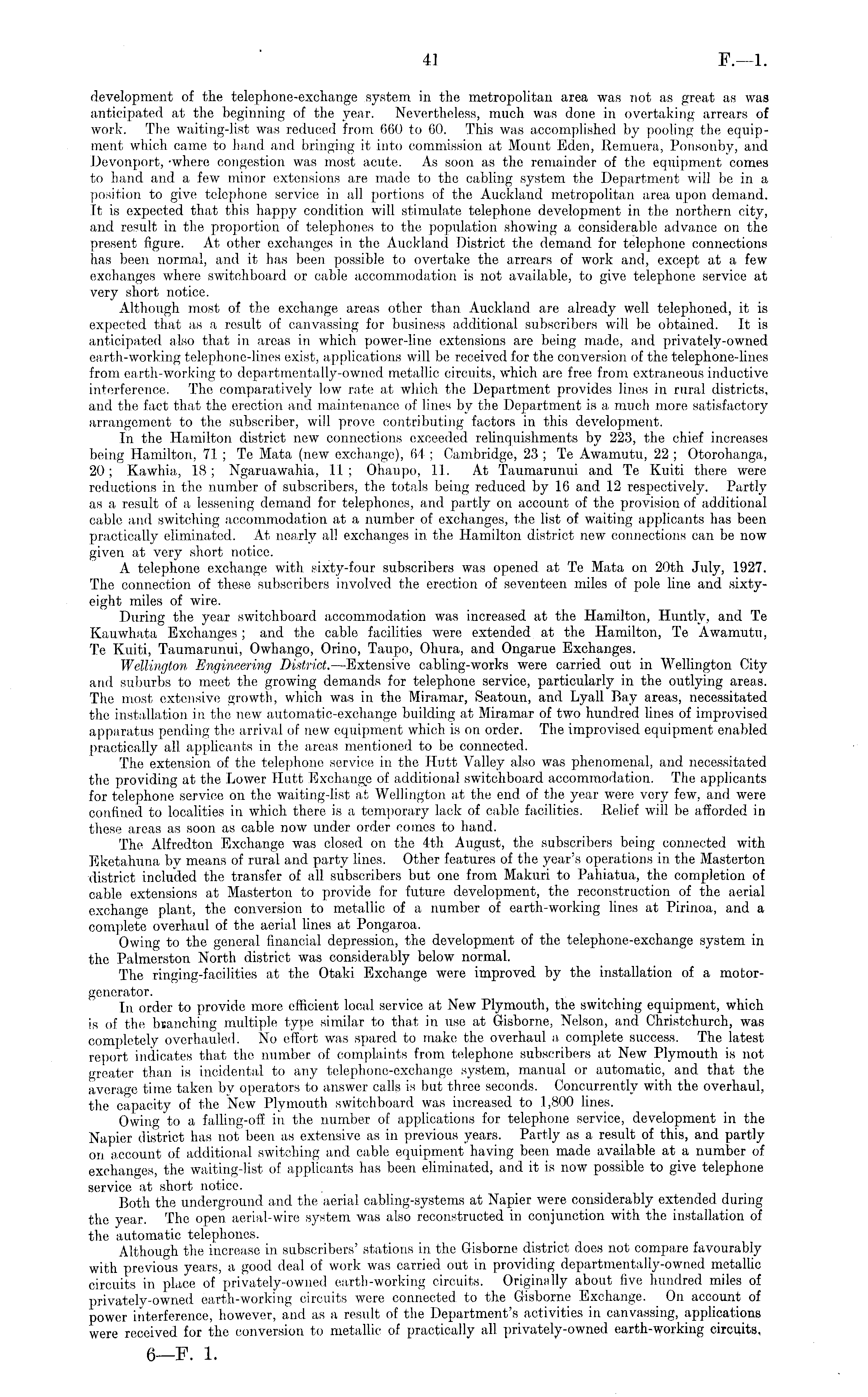 development of the telephone-exchange system in the metropolitan area was not as great as was anticipated at the beginning of the year. Nevertheless, much was done in overtaking arrears of work. The waiting-list was reduced from 660 to 60. This was accomplished by pooling the equipment which came to hand and bringing it into commission at Mount Eden, Remuera, Ponsonby, and Devonport, -where congestion was most acute. As soon as the remainder of the equipment comes to hand and a few minor extensions are made to the cabling system the Department will be in a position to give telephone service in all portions of the Auckland metropolitan area upon demand. It is expected that this happy condition will stimulate telephone development in the northern city, and result in the proportion of telephones to the population showing a considerable adva.nce on the present figure. At other exchanges in the Auckland District the demand for telephone connections has been normal, and it has been possible to overtake the arrears of work and, except at a few exchanges where switchboard or cable accommodation is not available, to give telephone service at very short notice. Although most of the exchange areas other than Auckland are already well telephoned, it is expected that as a result of canvassing for business additional subscribers will be obtained. It is anticipated also that in areas in which power-line extensions are being made, and privately-owned earth-working telephone-lines exist, applications will be received for the conversion of the telephone-lines from earth-working to departmentally-owned metallic circuits, which are free from extraneous inductive interference. The comparatively low rate at which the Department provides lines in rural districts, and the fact that the erection and maintenance of lines by the Department is a much more satisfactory arrangement to the subscriber, will prove contributing factors in this development. In the Hamilton district new connections exceeded relinquishments by 223, the chief increases being Hamilton, 71 ; Te Mata (new exchange), 64 ; Cambridge, 23 ; Te Awamutu, 22 ; Otorohanga, 20; Kawhia, 18; Ngaruawahia, 11; Ohaupo, 11. At Taumarunui and Te Kuiti there were reductions in the number of subscribers, the totals being reduced by 16 and 12 respectively. Partly as a result of a lessening demand for telephones, and partly on account of the provision of additional cable and switching accommodation at a number of exchanges, the list of waiting applicants has been practically eliminated. At nearly all exchanges in. the Hamilton district new connections can be now given at very short notice. A telephone exchange with sixty-four subscribers was opened at Te Mata on 20th July, 1927. The connection of these subscribers involved the erection of seventeen miles of pole line and sixtyeight miles of wire. During the year switchboard accommodation was increased at the Hamilton, Huntly, and Te Kauwhata Exchanges; and the cable facilities were extended at the Hamilton, Te Awamutu, Te Kuiti, Taumarunui, Owhango, Orino, Taupo, Ohura, and Ongarue Exchanges. Wellington Engineering District. —Extensive cabling-works were carried out in Wellington City and suburbs to meet the growing demands for telephone service, particularly in the outlying areas. The most extensive growth, which was in the Miramar, Seatoun, and Lyall Bay areas, necessitated the installation in the new automatic-exchange building at Miramar of two hundred lines of improvised apparatus pending the arrival of new equipment which is on order. The improvised equipment enabled practically all. applicants in the areas mentioned to be connected. The extension of the telephone service in the Hutt Valley also was phenomenal, and necessitated the providing at the Lower Hutt Exchange of additional switchboard accommodation. The applicants for telephone service on the waiting-list at Wellington at the end of the year were very few, and. were confined to localities in which there is a temporary lack of cable facilities. Relief will be afforded in these areas as soon as cable now under order comes to hand. The Alfredton Exchange was closed on the 4th August, the subscribers being connected with Eketahuna by means of rural and party lines. Other features of the year's operations in the Masterton district included the transfer of all subscribers but one from Makuri to Pahiatua, the completion of cable extensions at Masterton to provide for future development, the reconstruction of the aerial exchange plant, the conversion to metallic of a number of earth-working lines at Pirinoa, and a complete overhaul of the aerial lines at Pongaroa. Owing to the general financial depression, the development of the telephone-exchange system in the Palmerston North district was considerably below normal. The ringing-facilities at the Otaki Exchange were improved by the installation of a motorgenerator. In order to provide more efficient local service at New Plymouth, the switching equipment, which is of the blanching multiple type similar to that in use at Gisborne, Nelson, and Christchurch, was completely overhauled. No effort was spared to make the overhaul a complete success. The latest report indicates that the number of complaints from telephone subscribers at New Plymouth is not greater than is incidental to any telephone-exchange system, manual or automatic, and that the average time taken by operators to answer calls is but three seconds. Concurrently with the overhaul, the capacity of the New Plymouth, switchboard was increased to 1,800 lines. Owing to a falling-off in the number of applications for telephone service, development in the Napier district has not been as extensive as in previous years. Partly as a result of this, and partly on account of additional switching and cable equipment having been made available at a number of exchanges, the waiting-list of applicants has been eliminated, and it is now possible to give telephon