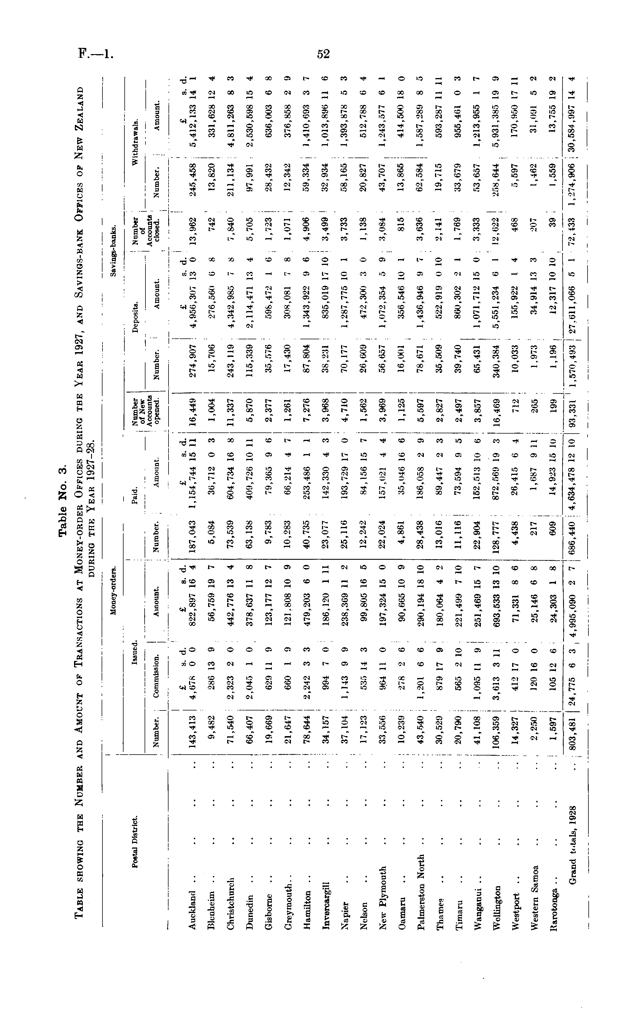 Table No. 3. Table showing the Number and Amount of Transactions at Money-order Offices during the Year 1927, and Savings-bank Offices of New Zealand during the Year 1927-28.