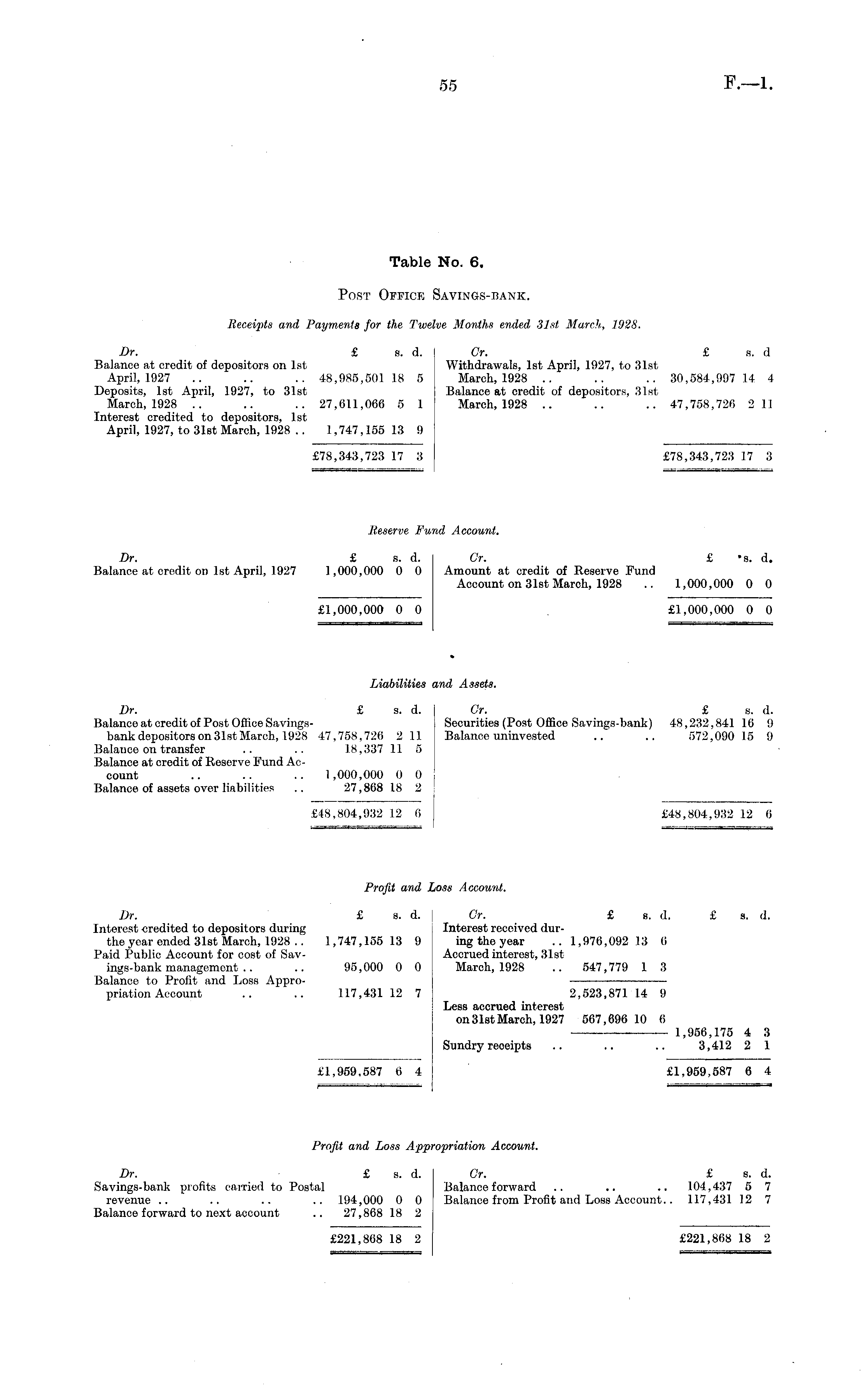 Table No. 6. Port Office Savings-bank. Receipts and Payments for the Twelve Months ended 31st March, 1928. Dr. £ s. d. Cr. £ s. d Balance at crodit of depositors on Ist Withdrawals, Ist April, 1927, to 31st April, 1927 .. .. .. 48,985,501 18 5 March, 1.928 .. .. .. 30,584,997 14 4 Deposits, Ist April, 1927, to 31st Balance at credit of depositors, 31st March, 1928 .. .. .. 27,611,066 5 1 March, 1928 .. .. .. 47,758,726 2 11 Interest credited to depositors, Ist April, 1927, to 31st March, 1928 .. 1,747,155 13 9 £78,343,723 17 3 £78,343,723 17 3 Reserve Fund Account. Dr. £ s. d. Cr. £ -s. d. Balance at credit on Ist April, 1927 1,000,000 0 0 Amount at credit of Reserve Fund Account on 31st March, 1928 .. 1,000,000 0 0 £1,000,000 0 0 £1,000,000 0 0 Liabilities and Assets. Dr. £ s. d. Cr. £ s. d. Balance at credit of Post Office Savings- Securities (Post Office Savings-bank) 48,232,841 16 9 bank depositors on3l st March, 1928 47,758,726 211 Balance uninvested .. .. 572,090 15 9 Balance on transfer .. .. 18,337 11 5 Balance at credit of Koserve Fund Account .. .. .. 1,000,000 0 0 Balance of assets over liabilities .. 27,868 18 2 £48,804,932 12 6 £48,804,932 12 6 Profit and Loss Account. Dr. £ s. d. | Or. £ s. d. £ s. d. Interest credited to depositors during i Interest received durthe year ended 31st March, 1928 .. 1,747,155 13 9 ing the year .. 1,976,092 13 6 Paid Public Account for cost of Say- Accrued interest, 31 st ings-bank management .. .. 95,000 0 0 March, 1928 .. 547,779 1 3 Balance to Profit and Loss Appropriation Account .. .. 117,431 12 7 \ 2,523,871 14 9 Less accrued interest on 31st March, 1927 567,696 10 (i — — 1,956,175 4 3 Sundry reoeipts .. .. .. 3,412 2 1 £1,959,587 6 4 £1,959,587 6 4 Profit and Loss Appropriation Account. Dr. £ s. d. Cr. £ s. d. Savings-bank profits carried to Postal Balance forward .. .. .. 104,437 5 7 revenue .. .. .. .. 194,000 0 0 Balance from Profit and Loss Account.. 117,431 12 7 Balance forward to next account .. 27,868 18 2 £221,868 18 2 £221,868 18 2
