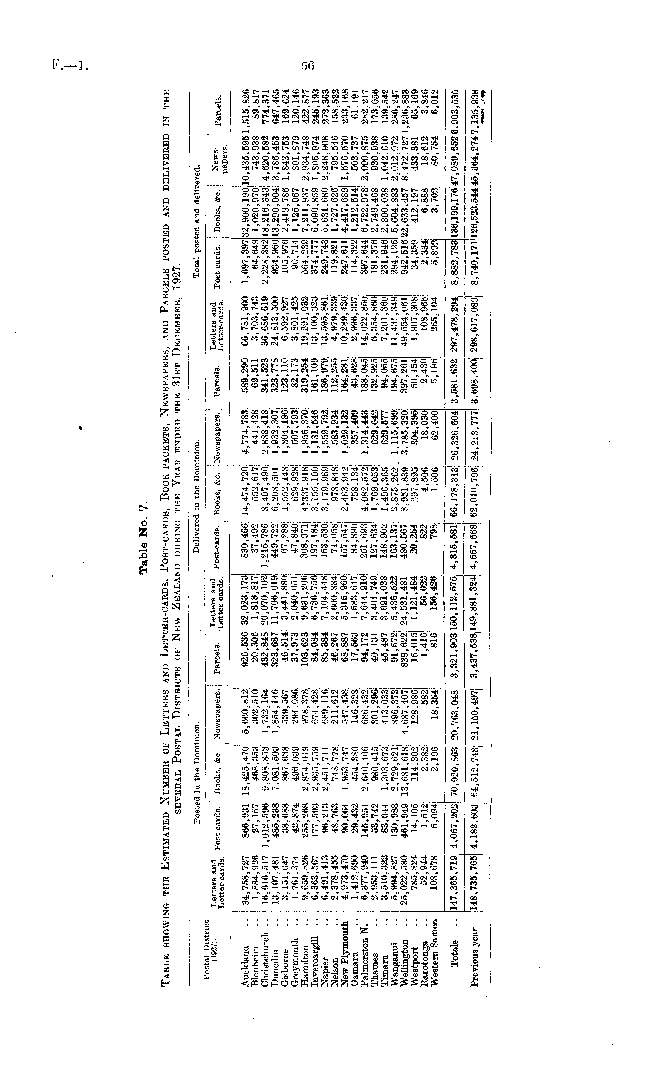 Table No. 7. Table showing the Estimated Number of Letters and Letter-cards, Post-cards, Book-packets, Newspapers, and Parcels posted and delivered in the several Postal Districts of New Zealand during the Year ended the 31at December, 1927.