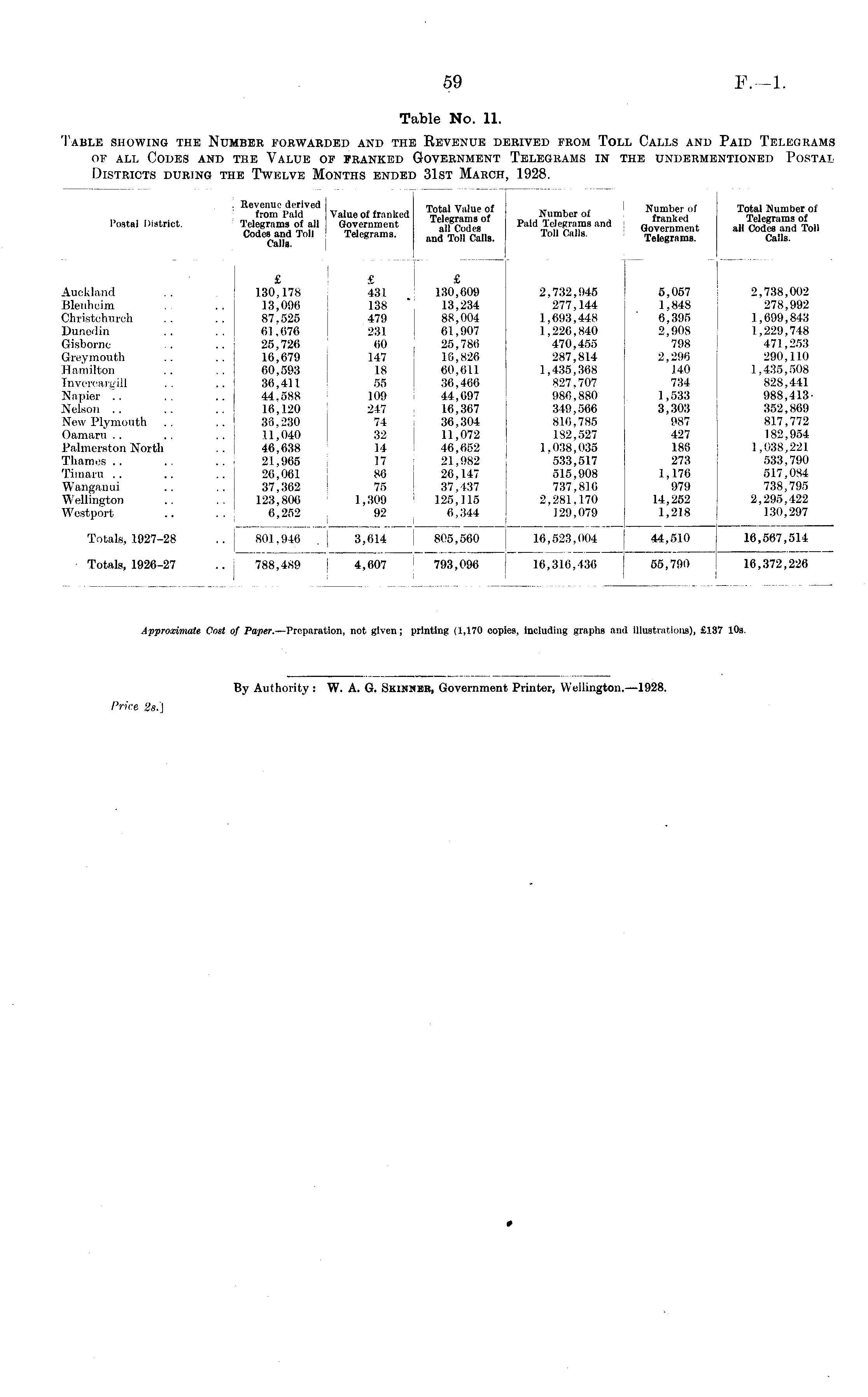 Table No. 11. Table showing the Number forwarded and the Revenue derived from Toll Calls and Paid Telegrams of all Codes and the Value of franked Government Telegrams in the undermentioned Postal Districts during the Twelve Months ended 31st March, 1928.