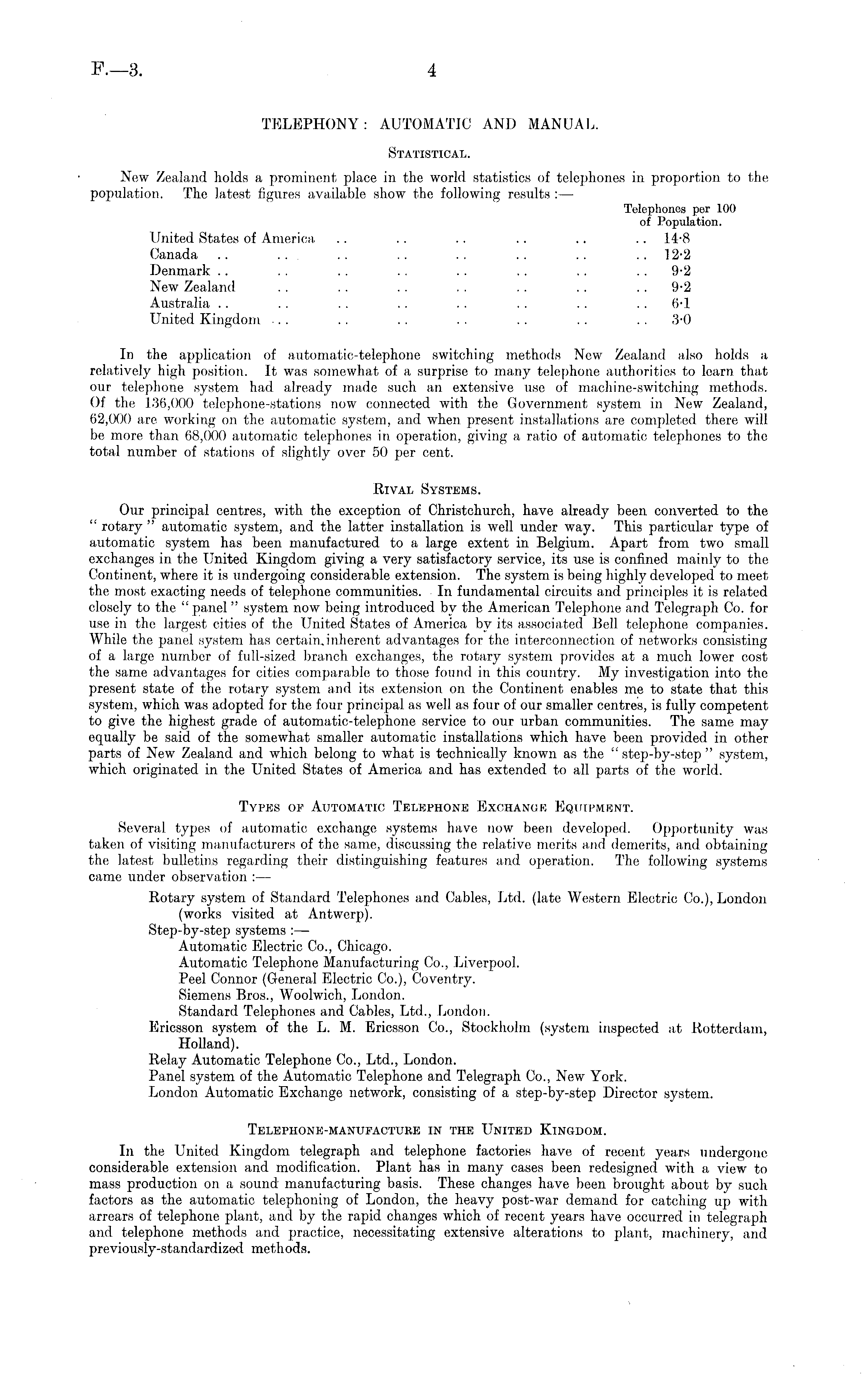 TELEPHONY: AUTOMATIC AND MANUAL. Statistical. New Zealand holds a prominent place in the world statistics of telephones in proportion to the population. The latest figures available show the following results : — Telephones per 100 of Population. United States of America .. .. .. .. .. .. 14-8 Canada .. . . . . .. . . . . . . .. 12-2 Denmark .. . . . . .. . . .. .. . . 9-2 New Zealand . . . . . . . . . . . . . . 9-2 Australia .. . . . . .. . . . . . . . . 6-1 United Kingdom ... . . . . . . . . .. . . 3-0 In the application of automatic-telephone switching methods New Zealand also holds a relatively high position. It was somewhat of a surprise to many telephone authorities to learn that our telephone system had already made such an extensive use of machine-switching methods. Of the 136,000 telephone-stations now connected with the Government system in New Zealand, 02,(XX) are working on the automatic system, and when present installations are completed there will be more than 68,(XX) automatic telephones in operation, giving a ratio of automatic telephones to the total number of stations of slightly over 50 per cent. Rival Systems. Our principal centres, with the exception of Christchurch, have already been converted to the " rotary " automatic system, and the latter installation is well under way. This particular type of automatic system has been manufactured to a large extent in Belgium. Apart from two small exchanges in the United Kingdom giving a very satisfactory service, its use is confined mainly to the Continent, where it is undergoing considerable extension. The system is being highly developed to meet the most exacting needs of telephone communities. In fundamental circuits and principles it is related closely to the " panel" system now being introduced by the American Telephone and Telegraph Co. for use in the largest cities of the United States of America by its associated Bell telephone companies. While the panel system has certain.inherent advantages for the interconnection of networks consisting of a large number of full-sized branch exchanges, the rotary system provides at a much lower cost the same advantages for cities comparable to those found in this country. My investigation into the present state of the rotary system and its extension on the Continent enables me to state that this system, which was adopted for the four principal as well as four of our smaller centres, is fully competent to give the highest grade of automatic-telephone service to our urban communities. The same may equally be said of the somewhat smaller automatic installations which have been provided in other parts of New Zealand and which belong to what is technically known as the " step-by-step " system, which originated in the United States of America and has extended to all parts of the world. Types of Automatic Telephone Exohanuk, Equipment. Several types of automatic exchange systems have now been developed. Opportunity was taken of visiting manufacturers of the same, discussing the relative merits arid demerits, and obtaining the latest bulletins regarding their distinguishing features and operation. The following systems came under observation :— Rotary system of Standard Telephones and Cables, Ltd. (late Western Electric Co.), London (works visited at Antwerp). Step-by-step systems : — Automatic Electric Co., Chicago. Automatic Telephone Manufacturing Co., Liverpool. Peel Connor (General Electric Co.), Coventry. Siemens Bros., Woolwich, London. Standard Telephones and Cables, Ltd., London. Ericsson system of the L. M. Ericsson Co., Stockholm (system inspected at Rotterdam, Holland). Relay Automatic Telephone Co., Ltd., London. Panel system of the Automatic Telephone and Telegraph Co., New York. London Automatic Exchange network, consisting of a step-by-step Director system. Telephone-manufacture in the United Kingdom. In the United Kingdom telegraph and telephone factories have of recent years undergone considerable extension and modification. Plant has in many cases been redesigned with a view to mass production on a sound manufacturing basis. These changes have been brought about by such factors as the automatic telephoning of London, the heavy post-war demand for catching up with arrears of telephone plant, and by the rapid changes which of recent years have occurred in telegraph and telephone methods and practice, necessitating extensive alterations to plant, machinery, and previously-standardized methods.