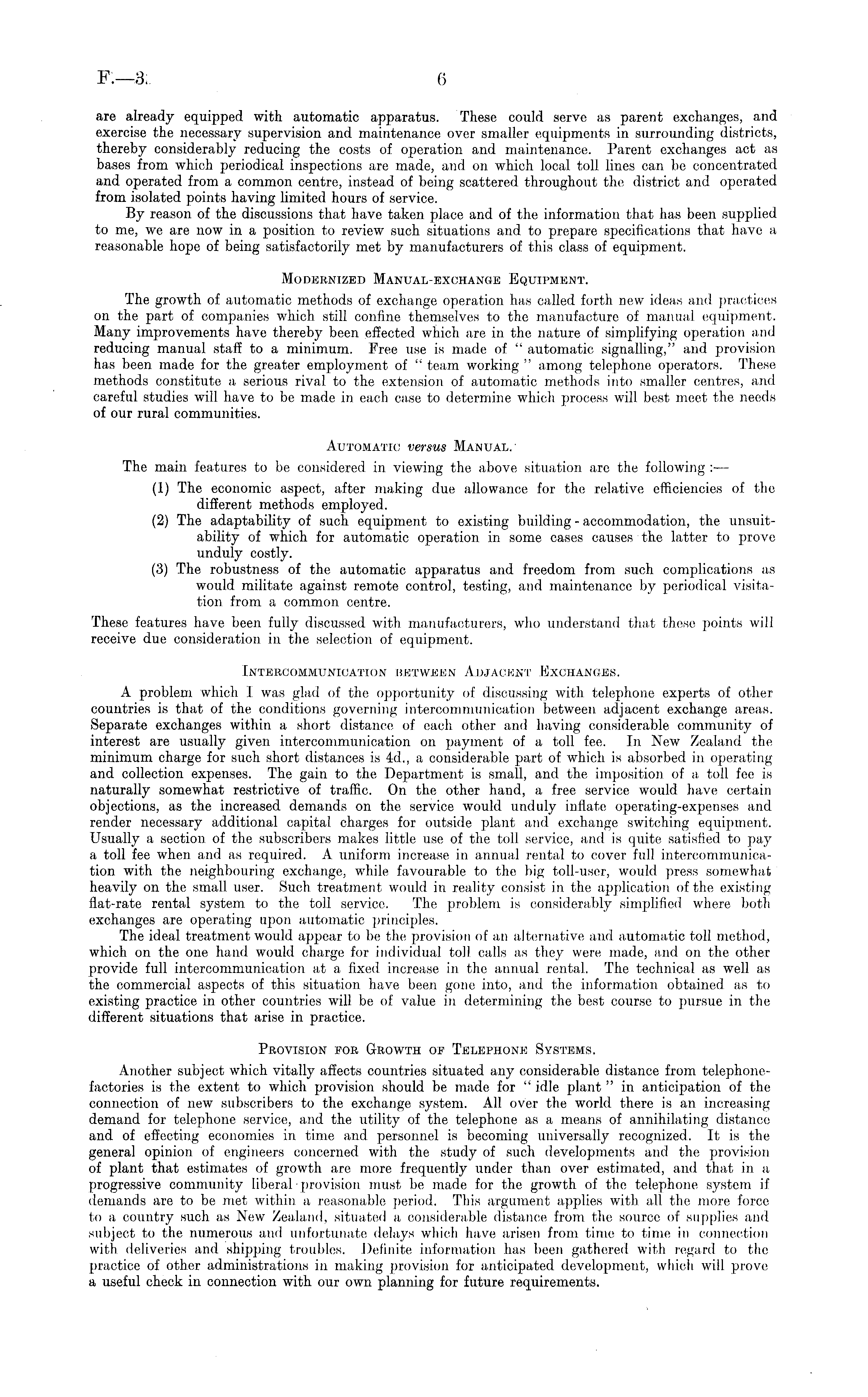 are already equipped with automatic apparatus. These could serve as parent exchanges, and exercise the necessary supervision and maintenance over smaller equipments in surrounding districts, thereby considerably reducing the costs of operation and maintenance. Parent exchanges act as bases from which periodical inspections are made, and on which local toll lines can be concentrated and operated from a common centre, instead of being scattered throughout the district and operated from isolated points having limited hours of service. By reason of the discussions that have taken place and of the information that has been supplied to me, we are now in a position to review such situations and to prepare specifications that have a reasonable hope of being satisfactorily met by manufacturers of this class of equipment. Modernized Manual-exchange Equipment. The growth of automatic methods of exchange operation has called forth new ideas and practices on the part of companies which still confine themselves to the manufacture of manual equipment. Many improvements have thereby been effected which are in the nature of simplifying operation and reducing manual staff to a minimum. Free use is made of " automatic signalling," and provision has been made for the greater employment of " team working " among telephone operators. These methods constitute a, serious rival to the extension of automatic methods into smaller centres, and careful studies will have to be made in each case to determine which process will best meet the needs of our rural communities. Automatic versus Manual.' The main features to be considered in viewing the above situation arc the following : — (1) The economic aspect, after making due allowance for the relative efficiencies of the different methods employed. (2) The adaptability of such equipment to existing building - accommodation, the unsu itability of which for automatic operation in some cases causes the latter to prove unduly costly. (3) The robustness of the automatic apparatus and freedom from such complications as would militate against remote control, testing, and maintenance by periodical visitation from a common centre. These features have been fully discussed with manufacturers, who understand that these points will receive due consideration in the selection of equipment. Intercommunication detween Adjacent Exchanges. A problem which I was glad of the opportunity of discussing with telephone experts of other countries is that of the conditions governing intercommunication between adjacent exchange areas. Separate exchanges within a short distance of each, other and having considerable community of interest are usually given intercommunication on payment of a toll fee. In New Zealand the minimum charge for such short distances is 4-d., a considerable part of which is absorbed in operating and collection expenses. The gain to the Department is small, and the imposition of a, toll fee is naturally somewhat restrictive of traffic. On the other hand, a. free service would have certain objections, as the increased demands on the service would unduly inflate operating-expenses and render necessary additional capital charges for outside plant and exchange switching equipment. Usually a section of the subscribers makes little use of the toll service, and is quite satisfied to pay a toll fee when and as required. A. uniform increase in annual rental to cover full intercommunication with the neighbouring exchange, while favourable to the big toll-user, would press somewhat, heavily on the small user. Such treatment would in reality consist in the application of the existing flat-rate rental system to the toll service. The problem, is considerably simplified where both exchanges are operating upon automatic principles. The ideal treatment would appear to be the provision of an alternative and automatic toll method, which on the one hand would charge for individual toll calls as they were made, and on the other provide full intercommunication at a. fixed increase in the annual rental. The technical as well as the commercial aspects of this situation have been gone into, and the information obtained as to existing practice in other countries will be of value in determining the best course to pursue in the different situations that arise in practice. Provision for Growth of Telephone Systems. Another subject which vitally affects countries situated any considerable distance from telephonefactories is the extent to which provision should, be made for " idle plant " in anticipation of the connection of new subscribers to the exchange system. All over the world there is an increasing demand for telephone service, and the utility of the telephone as a means of annihilating distance and of effecting economies in time and personnel is becoming universally recognized. It is the general opinion of engineers concerned with the study of such developments and the provision of plant that estimates of growth are more frequently under than over estimated, and that in a progressive community liberal provision must be made for the growth of the telephone system if demands are to be met within a reasonable period. This argument applies with all the more force to a. country such as New Zealand, situated a considerable distance from the source of supplies and subject to the numerous and unfortunate delays which have arisen from time to time in connection with deliveries and shipping troubles. Definite information has been gathered with regard to the practice of other administrations in. making provision for anticipated, development, which will prove a useful check in connection with our own planning for future requirements.