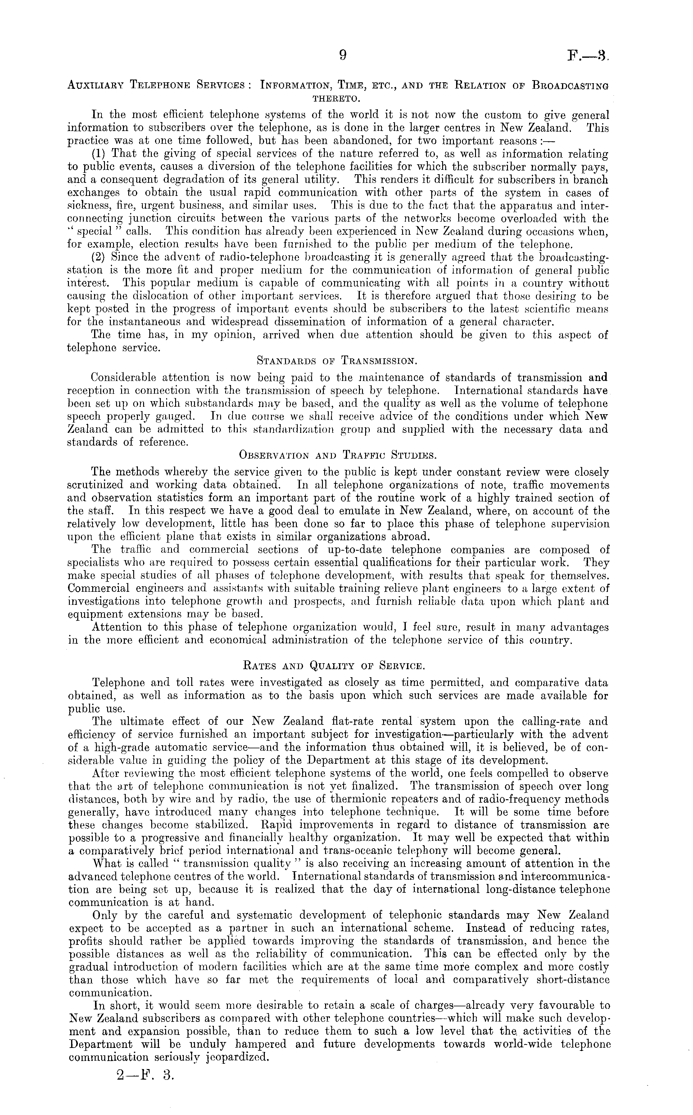 Auxiliary Telephone Services : Information, Time, etc., and the Relation of Broadcasting THERETO. In the most efficient telephone systems of the world it is not now the custom to give general information to subscribers over the telephone, as is done in the larger centres in New Zealand. This practice was at one time followed, but has been abandoned, for two important reasons :— (1) That the giving of special services of the nature referred to, as well as information relating to public events, causes a diversion of the telephone facilities for which the subscriber normally pays, and a consequent degradation of its general utility. This renders it difficult for subscribers in branch exchanges to obtain the usual rapid communication with other parts of the system in cases of sickness, fire, urgent business, and similar uses. This is due to the fact that the apparatus and interconnecting junction circuits between the various parts of the networks become overloaded with the " special " calls. This condition has already been experienced in Now Zealand during occasions when, for example, election results have been furnished to the public per medium of the telephone. (2) Since the advent of radio-telephone broadcasting it is generally agreed that the broadcastingstation is the more fit and proper medium for the communication of information of general public interest. This popular medium is capable of communicating with all points in a country without causing the dislocation of other important services, ft is therefore argued that those desiring to be kept posted in the progress of important events should be subscribers to the latest scientific means for the instantaneous and widespread dissemination of information of a general character. The time has, in my opinion, arrived when due attention should be given to this aspect of telephone service. Standards of Transmission. Considerable attention is now being paid to the maintenance of standards of transmission and reception in connection with the transmission of speech by telephone. International standards have been set up on which substandards may be based, and the quality as well as the volume of telephone speech properly gauged. In due course we shall receive advice of the conditions under which New Zealand, can be admitted to this standardization group and supplied with the necessary data and standards of reference. Observation and Traffic Studies. The methods whereby the service given to the public is kept under constant review were closely scrutinized and working data obtained. In all telephone organizations of note, traffic movements and observation statistics form an important part of the routine work of a highly trained section of the staff. In this respect we have a good deal to emulate in New Zealand, where, on account of the relatively low development, little has been done so far to place this phase of telephone supervision upon the efficient plane that exists in similar organizations abroad. The traffic and commercial sections of up-to-date telephone companies are composed of specialists who are required to possess certain essential qualifications for their particular work. They make special studies of all phases of telephone development, with results that speak for themselves. Commercial engineers and assistants with suitable training relieve plant engineers to a large extent of investigations into telephone growth and prospects, and furnish reliable data upon which plant and equipment extensions may be based. Attention to this phase of telephone organization would, I feel sure, result in many advantages in the more efficient and economical administration of the telephone service of this country. Rates and Quality of Service. Telephone and toll rates were investigated as closely as time permitted, and comparative data obtained, as well as information as to the basis upon which such services are made available for public use. The ultimate effect of our New Zealand flat-rate rental system upon the calling-rate and efficiency of service furnished an important subject for investigation—particularly with the advent of a high-grade automatic service—and the information thus obtained will, it is believed, be of considerable value in guiding the policy of the Department at this stage of its development. After reviewing the most efficient telephone systems of the world, one feels compelled to observe that the art of telephone communication is not yet finalized. The transmission of speech over long distances, both by wire and by radio, the use of thermionic repeaters and of radio-frequency methods generally, have introduced many changes into telephone technique. It will be some time before these changes become stabilized. Rapid improvements in regard to distance of transmission are possible to a progressive and financially healthy organization. It may well be expected that within a comparatively brief period international and trans-oceanic telephony will become general. What is called " transmission quality " is also receiving an increasing amount of attention in the advanced telephone centres of the world. International standards of transmission and intercommunication are being set up, because it is realized that the day of international long-distance telephone communication is at hand. Only by the careful and systematic development of telephonic standards may New Zealand expect to be accepted as a partner in such an international scheme. Instead of reducing rates, profits should rather be applied towards improving the standards of transmission, and hence the possible distances as well as the reliability of communication. This can be effected only by the gradual introduction of modern facilities which are at the same time more complex and more costly than those which have so far met the requirements of local and comparatively short-distance communication. In short, it would seem more desirable to retain a scale of charges—already very