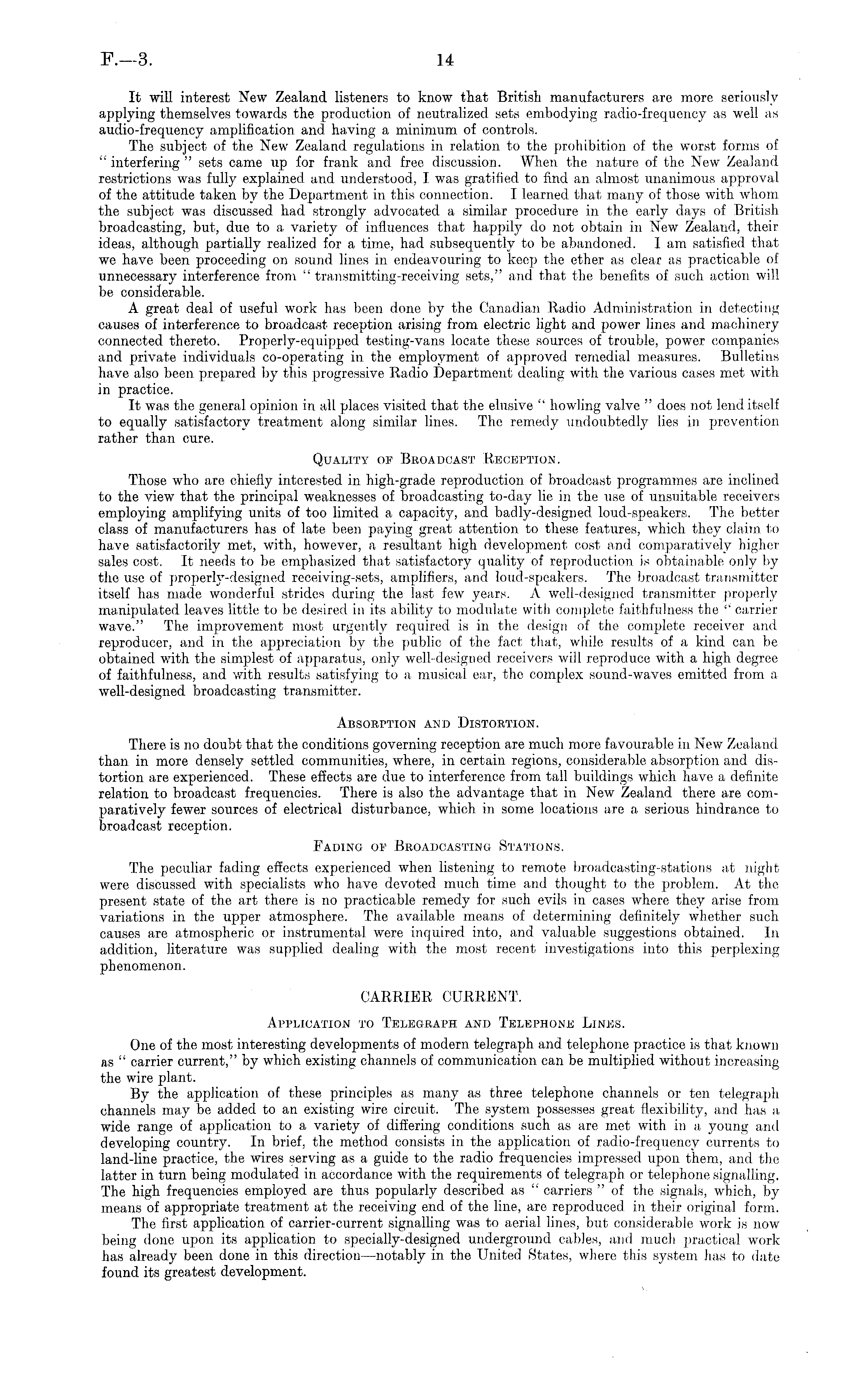 It will interest New Zealand listeners to know that British manufacturers are more seriously applying themselves towards the production of neutralized sets embodying radio-frequency as well as audio-frequency amplification and having a minimum of controls. The subject of the New Zealand regulations in relation to the prohibition of the worst forms of " interfering " sets came up for frank and free discussion. When the nature of the New Zealand restrictions was fully explained and understood, I was gratified to find an almost unanimous approval of the attitude taken by the Department in this connection. I learned, that many of those with, whom the subject was discussed, had strongly advocated a similar procedure in the early days of British broadcasting, but, due to a variety of influences that happily do not obtain in New Zealand, their ideas, although partially realized for a time, had subsequently to be abandoned. lam satisfied that we have been proceeding on. sound lines in endeavouring to keep the ether as clear as practicable of unnecessary interference from " transmitting-reeeiving sets," and that the benefits of such action will be considerable. A great deal of useful work has been done by the Canadian Radio Administration in detecting causes of interference to broadcast reception arising from electric light and power lines and machinery connected thereto. Properly-equipped testing-vans locate these sources of trouble, power companies and private individuals co-operating in the employment of approved remedial measures. Bulletins have also been prepared by this progressive Radio Department dealing with the various cases met with in practice. It was the general opinion in all places visited that the elusive " howling valve " does not lend itself to equally satisfactory treatment along similar lines. The remedy undoubtedly lies in prevention rather than cure. Quality of Broadcast Reception. Those who are chiefly interested in high-grade reproduction of broadcast programmes are inclined to the view that the principal weaknesses of broadcasting to-day lie in the use of unsuitable receivers employing amplifying units of too limited a capacity, and. badly-designed loud-speakers. The better class of manufacturers has of late been paying great attention to these features, which they claim to have satisfactorily met, with, however, a resultant high development cost and comparatively higher sales cost. It needs to be emphasized that satisfactory quality of reproduction is obtainable only by the use of properly-designed receiving-sets, amplifiers, and loud-speakers. The broadcast transmitter itself has made wonderful strides during the last few years. A well-designed transmitter properly manipulated leaves little to be desired in its ability to modulate with complete faithfulness the '' carrier wave." The improvement most urgently required is in the design of the complete receiver and reproducer, and in the appreciation by the public of the fact that, while results of a kind can be obtained with the simplest of apparatus, only well-designed receivers will reproduce with a high degree of faithfulness, and with results satisfying to a musical ear, the complex sound-waves emitted from a well-designed broadcasting transmitter. Absorption and Distortion. There is no doubt that the conditions governing reception are much more favourable in New Zealand than in more densely settled, communities, where, in certain regions, considerable absorption and distortion are experienced. These effects are due to interference from tall buildings which have a definite relation to broadcast frequencies. There is also the advantage that in New Zealand there are comparatively fewer sources of electrical disturbance, which in some locations are a serious hindrance to broadcast reception. Fading op Broadcasting Stations. The peculiar fading effects experienced when listening to remote broadcasting-stations at night were discussed with specialists who have devoted much time and thought to the problem. At the present state of the art there is no practicable remedy for such evils in cases where they arise from variations in the upper atmosphere. The available means of determining definitely whether such causes are atmospheric or instrumental were inquired into, and valuable suggestions obtained. In addition, literature was supplied dealing with the most recent investigations into this perplexing phenomenon. CARRIER CURRENT. Application to Telegraph and Telephone Lines. One of the most interesting developments of modern telegraph and telephone practice is that known as " carrier current," by which existing channels of communication can be multiplied without increasing the wire plant. By the application of these principles as many as three telephone channels or ten telegraph channels may be added to an existing wire circuit. The system possesses great flexibility, and has a wide range of application to a variety of differing conditions such as are met with in a young and developing country. In brief, the method consists in the application of radio-frequency currents to land-line practice, the wires serving as a guide to the radio frequencies impressed upon them, and the latter in turn being modulated in accordance with the requirements of telegraph or telephone signalling. The high frequencies employed are thus popularly described as " carriers " of the signals, which, by means of appropriate treatment at the receiving end of the line, are reproduced in their original form. The first application of carrier-current signalling was to aerial lines, but considerable work is now being done upon its application to specially-designed underground cables, and much practical work has already been done in this direction —notably in the United States, whore this system has to date found its greatest development.