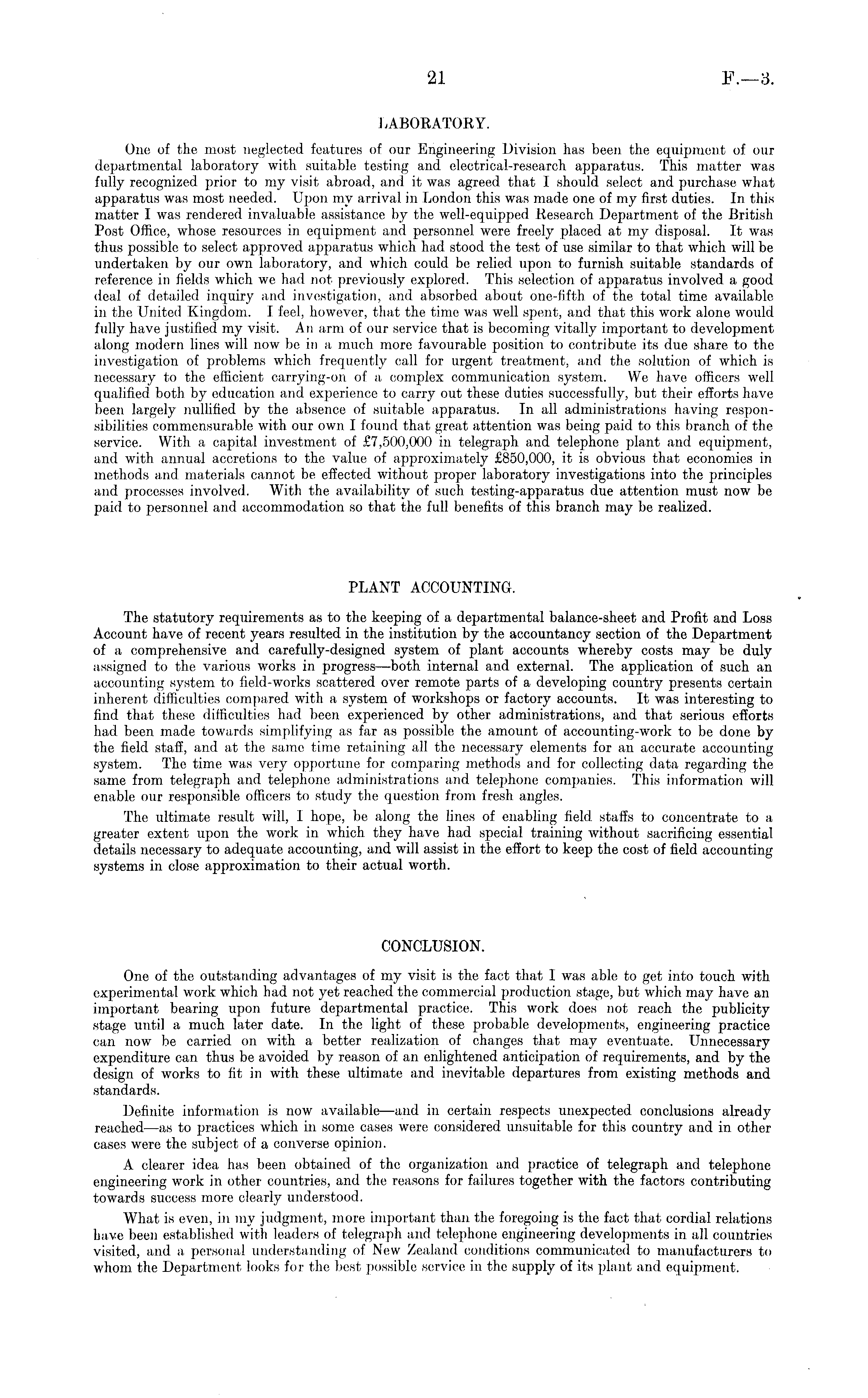 LABORATORY. One of the most neglected features of our Engineering Division has been the equipment of our departmental laboratory with suitable testing and electrical-research apparatus. This matter was fully recognized prior to my visit abroad, and it was agreed that I should select and purchase what apparatus was most needed. Upon my arrival in London this was made one of my first duties. In this matter I was rendered invaluable assistance by the well-equipped Research Department of the British Post Office, whose resources in equipment and personnel were freely placed at my disposal. It was thus possible to select approved apparatus which had stood the test of use similar to that which will be undertaken by our own laboratory, and which could be relied upon to furnish suitable standards of reference in fields which we had not previously explored. This selection of apparatus involved a good deal of detailed inquiry and investigation, and absorbed about one-fifth of the total time available in the United Kingdom. I feel, however, that the time was well spent, and that this work alone would fully have justified my visit. An arm of our service that is becoming vitally important to development along modern lines will now be in a much more favourable position to contribute its due share to the investigation of problems which frequently call for urgent treatment, and the solution of which is necessary to the efficient carrying-on of a complex communication system. We have officers well qualified both by education and experience to carry out these duties successfully, but their efforts have been largely nullified by the absence of suitable apparatus. In all administrations having responsibilities commensurable with our own I found that great attention was being paid to this branch of the service. With a capital investment of £7,500,000 in telegraph and telephone plant and equipment, and with annual accretions to the value of approximately £850,000, it is obvious that economies in methods and materials cannot be effected without proper laboratory investigations into the principles and processes involved. With the availability of such testing-apparatus due attention must now be paid to personnel and accommodation so that the full benefits of this branch may be realized. PLANT ACCOUNTING. The statutory requirements as to the keeping of a departmental balance-sheet and Profit and Loss Account have of recent years resulted in the institution by the accountancy section of the Department of a comprehensive and carefully-designed system of plant accounts whereby costs may be duly assigned to the various works in progress—both internal and external. The application of such an accounting system to field-works scattered over remote parts of a developing country presents certain inherent difficulties compared with a system of workshops or factory accounts. It was interesting to find that these difficulties had been experienced by other administrations, and that serious efforts had been made towards simplifying as far as possible the amount of accounting-work to be done by the field staff, and at the same time retaining all the necessary elements for an accurate accounting system. The time was very opportune for comparing methods and for collecting data regarding the same from telegraph and telephone administrations and telephone companies. This information will enable our responsible officers to study the question from fresh angles. The ultimate result will, 1 hope, be along the lines of enabling field, staffs to concentrate to a greater extent upon the work in which they have had special training without sacrificing essential details necessary to adequate accounting, and will assist in the effort to keep the cost of field accounting systems in close approximation to their actual worth. CONCLUSION. One of the outstanding advantages of my visit is the fact that I was able to get into touch with experimental work which had not yet reached the commercial production stage, but which may have an important bearing upon future departmental practice. This work does not reach the publicity stage until a much later date. In the light of these probable developments, engineering practice can now be carried on with a better realization of changes that may eventuate. Unnecessary expenditure can thus be avoided by reason of an enlightened anticipation of requirements, and by the design of works to fit in with these ultimate and inevitable departures from existing methods and standards. Definite information is now available —and in certain respects unexpected conclusions already reached —as to practices which in some cases were considered unsuitable for this country and in other cases were the subject of a converse opinion. A clearer idea has been obtained of the organization and practice of telegraph and telephone engineering work in other countries, and the reasons for failures together with the factors contributing towards success more clearly understood. What is even, in my judgment, more important than the foregoing is the fact that cordial relations have been established with leaders of telegraph and telephone engineering developments in all countries visited, and a personal understanding of New Zealand conditions communicated to manufacturers to whom the Department looks for the best possible service in the supply of its plant and equipment.