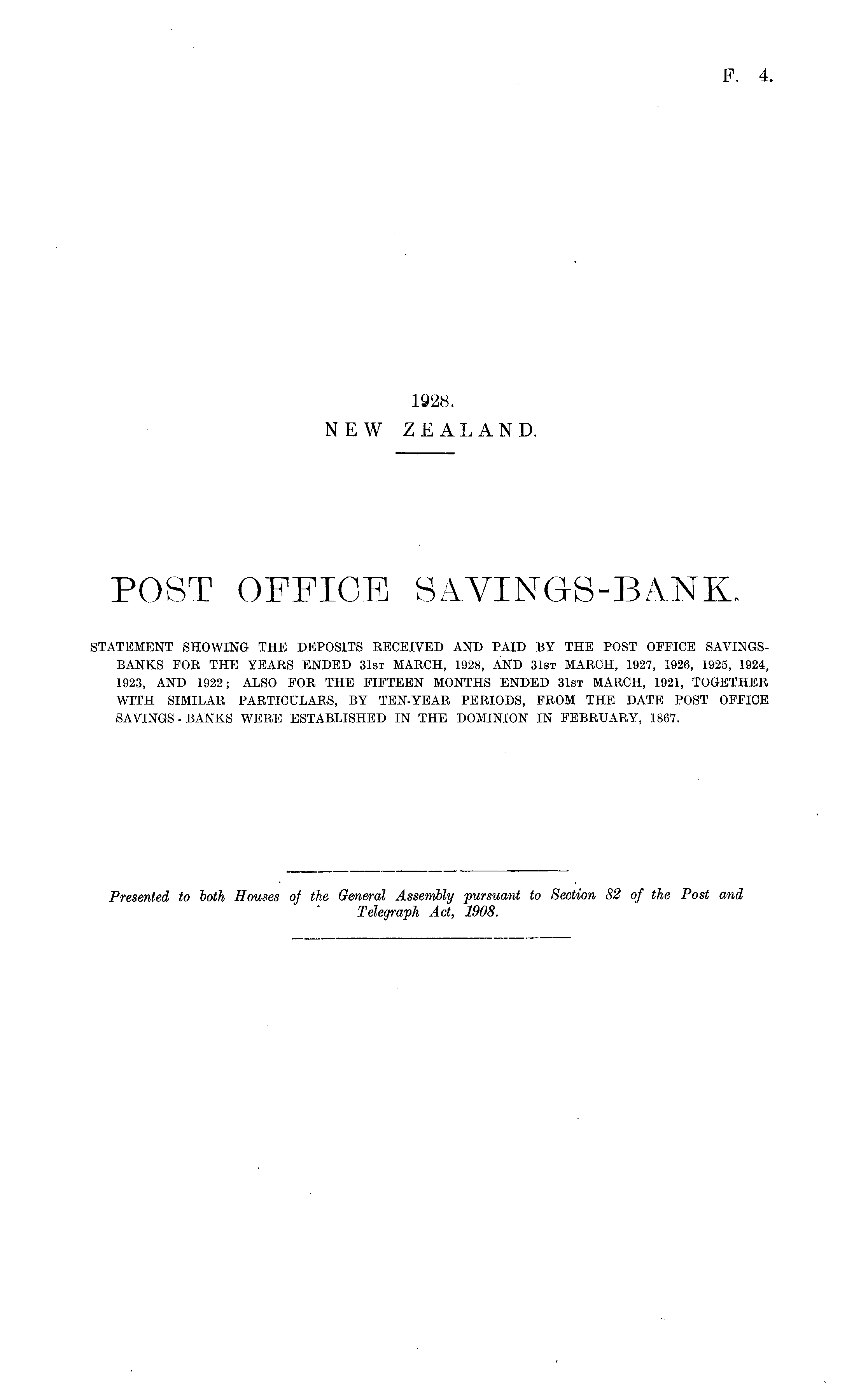 POST OFFICE SAVINGS-BANK. STATEMENT SHOWING THE DEPOSITS RECEIVED AND PAID BY THE POST OFFICE SAVINGSBANKS FOR THE YEARS ENDED 31st MARCH, 1928, AND 31st MARCH, 1927, 1926, 1925, 1924, 1923, AND 1922; ALSO FOR THE FIFTEEN MONTHS ENDED 31st MARCH, 1921, TOGETHER WITH SIMILAR PARTICULARS, BY TEN-YEAR PERIODS, FROM THE DATE POST OFFICE SAVINGS-BANKS WERE ESTABLISHED IN THE DOMINION IN FEBRUARY, 1867.