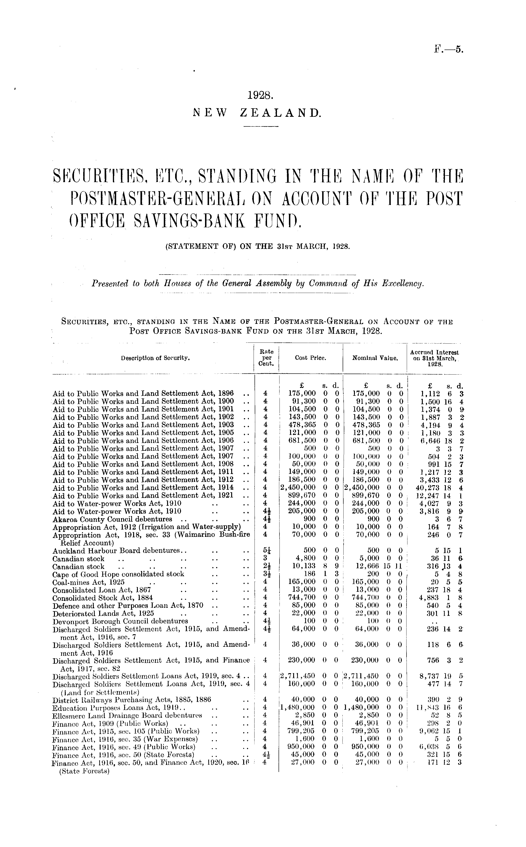 Securities, etc., standing in the Name of the Postmaster-General on Account of the Post Office Savings-bank Fund on the 31st March, 1928.