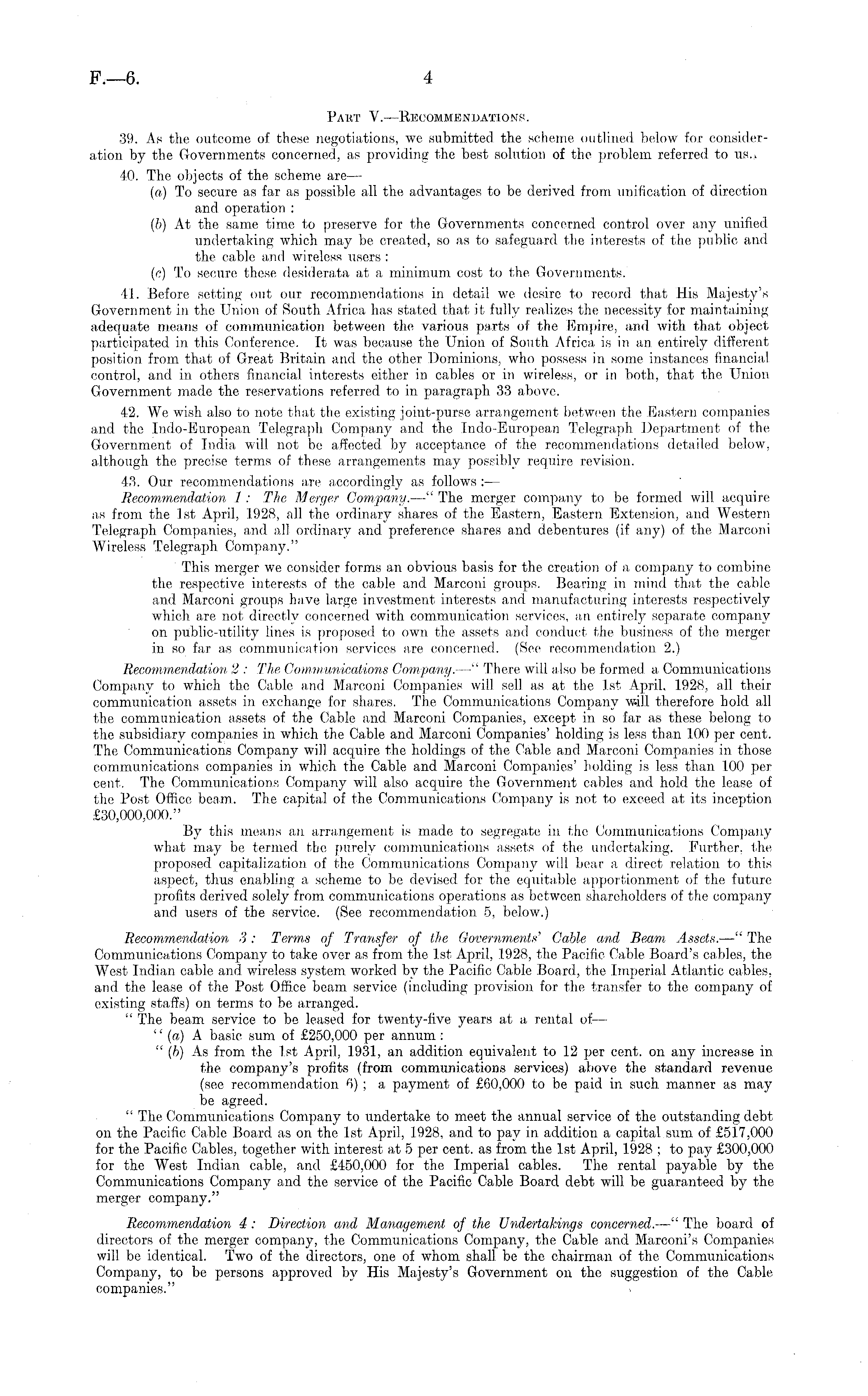 Part V.—Recommendations. 39. As the outcome of these negotiations, we submitted the scheme outlined below for consideration by the Governments concerned, as providing the best solution of the problem referred to us.» 40. The objects of the scheme are— (a) To secure as far as possible all the advantages to be derived from unification of direction and operation : (b) At the same time to preserve for the Governments concerned control over any unified undertaking which may be created, so as to safeguard the interests of the public and the cable and wireless users : (c) To secure these desiderata at a minimum cost to the Governments. 41. Before setting out our recommendations in detail we desire to record that His Majesty's Government in the Union of South Africa has stated that it fully realizes the necessity for maintaining adequate, means of communication between the various parts of the Empire, and with that object participated in this Conference. It was because the Union of South Africa, is in an entirely different position from that of Great Britain and the other Dominions, who possess in some instances financial control, and in others financial interests either in cables or in wireless, or in both, that the Union Government made the reservations referred to in paragraph 33 above. 42. We wish also to note that the existing joint-purse arrangement between the Eastern companies and the Indo-European Telegraph. Company and the Indo-European Telegraph Department of the Government of India, will not be affected, by acceptance of the recommendations detailed below, although the precise terms of these arrangements may possibly require revision. 43. Our recommendations are accordingly as follows : — Recommendation 1 : The Merger Company. —" The merger company to be formed will acquire as from the Ist April, .1928, all the ordinary shares of the Eastern, Eastern Extension, and Western Telegraph Companies, and all ordinary and preference shares and debentures (if any) of the Marconi Wireless Telegraph Company." This merger we consider forms an obvious basis for the creation of a company to combine the respective interests of the cable and Marconi groups. Bearing in mind that the cable and Marconi groups have large investment interests and manufacturing interests respectively which are not directly concerned with communication services, an entirely separate company on public-utility lines is proposed to own the assets and conduct the business of the merger in so far as communication services are concerned. (See recommendation 2.) Recommendation 2 : The Communications Company. —" There will also be formed a, Communications Company to which the Cable and Marconi Companies will sell as at the Ist April. 1928, all their communication assets in exchange for shares. The Communications Company will therefore hold all the, communication assets of the Cable and Marconi Companies, except in so far as these belong to the subsidiary companies in which the Cable and Marconi Companies' holding is less than 100 per cent. The Communications Company will acquire the holdings of the Cable and Marconi Companies in those communications companies in which the, Cable and. Marconi Companies' holding is less than 100 per cent. The Communications Company will also acquire the Government cables and hold the lease of the Post Office beam. The capital of the Communications Company is not to exceed at its inception £30,000,000." By this means an arrangement is made to segregate in the Communications Company what may be termed the purely communications assets of the undertaking. Eurther, the proposed capitalization, of the Communications Company will bear a direct relation to this aspect, thus enabling a scheme to be devised for the equitable apportionment of the future profits derived solely from communications operations as between shareholders of the company and users of the service. (See recommendation 5, below.) Recommendation, ,'i: Terms of Transfer of the Governments' Cable and Beam Assets. —" The Communications Company to take over as from the Ist April, 1928, the Pacific Cable Board's cables, the West Indian cable and. wireless system, worked by the Pacific Cable Board, the Imperial Atlantic cables, and the lease of the Post Office beam service (including provision for the transfer to the, company of existing staffs) on terms to be arranged. " The beam service to be leased for twenty-five years at a rental of — '' (a) A basic sum of £250,000 per annum : " (b) As from the Ist April, 1931, an. addition equivalent to 12 per cent, on any increase in the company's profits (from communications services) above the standard revenue (see recommendation 6) ; a payment, of £60,000 to be paid in such manner as may be agreed. " The Communications Company to undertake to meet the annual service of the outstanding debt on the Pacific Cable Board as on the Ist April, 1928, and to pay in addition a capital sum of £517,000 for the Pacific Cables, together with interest at 5 per cent, as from the Ist April, 1928 ; to pay £300,000 for the West Indian cable, and £450,000 for the Imperial cables. The rental payable by the Communications Company and the service of the Pacific Cable Board debt will be guaranteed by the merger company." Recommendation 4 : Direction and Management of the Undertakings concerned. —" The board of directors of the merger company, the Communications Company, the Cable and Marconi's Companies will be identical. Two of the directors, one of whom shall be the chairman of the Communications Company, to be persons approved by His Majesty's Government on the suggestion of the Cable companies."