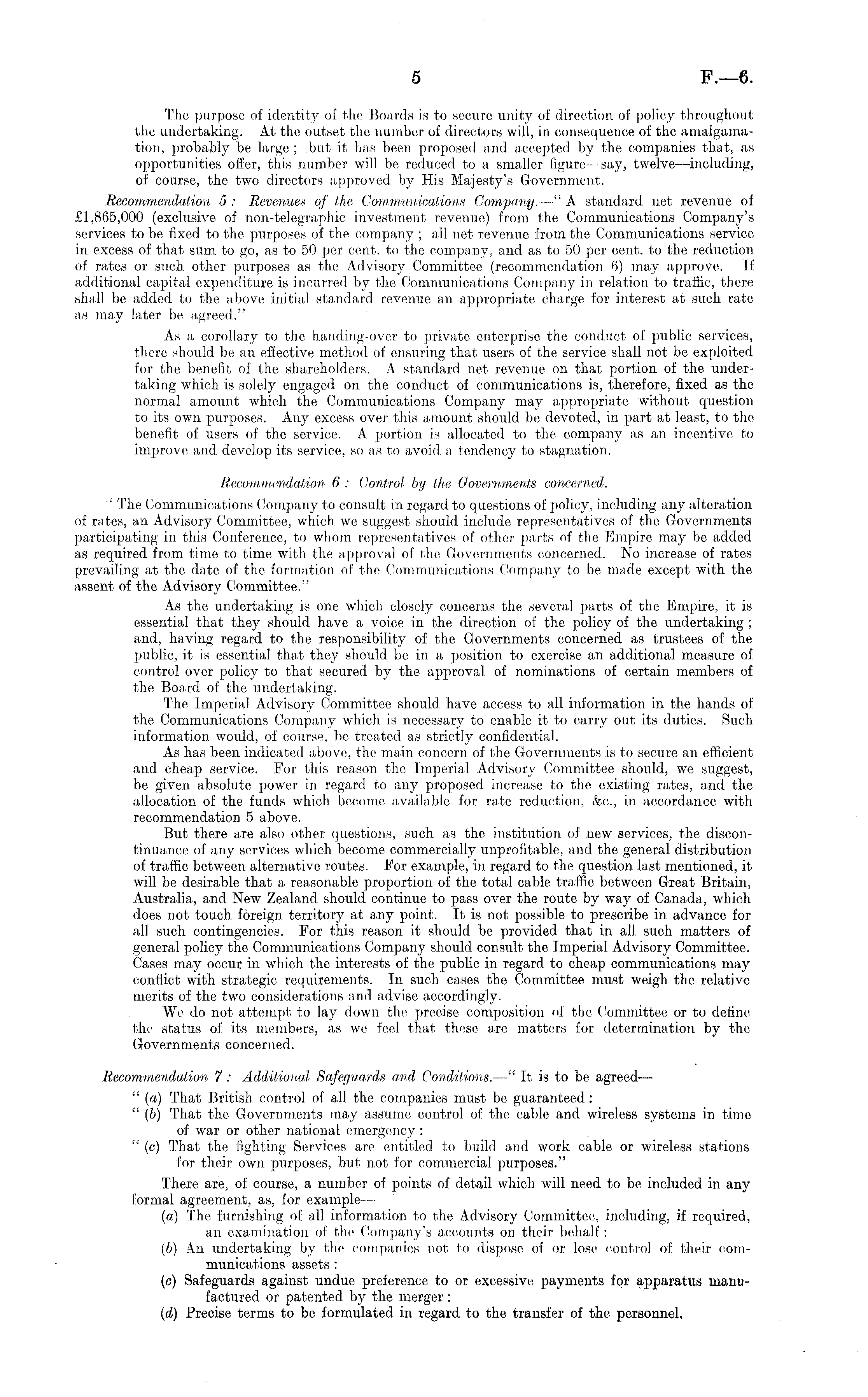 The purpose of identity of the Boards is to secure unity of direction of policy throughout the undertaking. At the outset the number of directors will, in consequence of the amalgamation, probably be large ; but it has been proposed and accepted, by the companies that, as opportunities offer, this number will be reduced to a smaller figure—say, twelve —including, of course, the two directors approved by His Majesty's Government. Recommendation 5 : Revenues of the Communications Company. - " A standard net revenue of £1,865,000 (exclusive of non-telegraphic investment revenue) from the Communications Company's services to be fixed to the purposes of the company ; all net revenue from the Communications service in excess of that sum to go, as to 50 per cent, to the company, and as to 50 per cent, to the reduction of rates or such other purposes as the Advisory Committee (recommendation 6) may approve. If additional capital expenditure is incurred by the Communications Company in relation to traffic, there shall be added to the above initial standard revenue an appropriate charge for interest at such rate as may later be, agreed." As a corollary to the handing-over to private enterprise the conduct of public services, there should be an effective method of ensuring that users of the service shall not be exploited for the benefit of the shareholders. A standard net revenue on that portion of the undertaking which is solely engaged on the conduct of communications is, therefore, fixed as the normal amount which the Communications Company may appropriate without question to its own purposes. Any excess over this amount should be devoted, in part at least, to the benefit of users of the service. A portion is allocated to the company as an incentive to improve and develop its service, so as to avoid a, tendency to stagnation. Recommendation 6 : Control by the Governments concerned. " The Communications Company to consult in regard to questions of policy, including any alteration of rates, an Advisory Committee, which we suggest should include representatives of the Governments participating in this Conference, to whom representatives of other parts of the Empire may be added as required from time to time with the approval of the Governments concerned. No increase of rates prevailing at the date of the formation of the Communications Company to be made except with the assent of the Advisory Committee." As the undertaking is one which closely concerns the several parts of the Empire, it is essential that they should have a voice in the direction of the policy of the undertaking ; and, having regard to the responsibility of the Governments concerned as trustees of the, public, it is essentia] that they should be in a position to exercise an additional measure of control over policy to that secured by the approval of nominations of certain members of the Board of the undertaking. The Imperial Advisory Committee should have access to all information in the hands of the Communications Company which is necessary to enable it to carry out its duties. Such information would, of course, be treated as strictly confidential. As has been indicated above, the main concern of the Governments is to secure an efficient and cheap service. For this reason the Imperial Advisory Committee should, we suggest, be given absolute power in regard to any proposed increase to the existing rates, and the allocation of the funds which become available for rate reduction, c%c, in accordance with recommendation 5 aboveBut there are also other questions, such as the institution of new services, the discontinuance of any services which become, commercially unprofitable, and the general distribution of traffic between alternative routes. For example, in regard to the question last mentioned, it will be desirable that a reasonable proportion of the total cable traffic between Great Britain, Australia, and New Zealand should continue to pass over the route by way of Canada, which does not touch foreign territory at any point. It is not possible to prescribe in advance for all such contingencies. For this reason it should be provided that in. all such matters of general policy the Communications Company should consult the Imperial Advisory Committee. Cases may occur in which the interests of the public in regard to cheap communications may conflict with strategic requirements. In such cases the Committee must weigh the relative merits of the two considerations and advise accordingly. We do not attempt to lay down the precise composition of the Committee or to define the status of its members, as we feel that these arc matters for determination by the Governments concerned. Recommendation 7 : Additional Safeguards and Conditions. —" It is to be agreed- — " (a) That British control of all the companies must be guaranteed: " (b) That the Governments may assume control of the cable and wireless systems in time of war or other national emergency: " (c) That the fighting Services are entitled to build and work, cable or wireless stations for their own purposes, but not for commercial purposes." There are, of course, a number of points of detail which will need to be included in any formal agreement, as, for example (a) The furnishing of all information to the Advisory Committee, including, if required, an examination of the Company's accounts on their behalf: (ft) An undertaking by the companies not to dispose of or lose control of their communications assets : (c) Safeguards against undue preference to or excessive payments for apparatus manufactured or patented by the merger: (d) Precise terms to be formulated in regard to the transfer of the personnel.