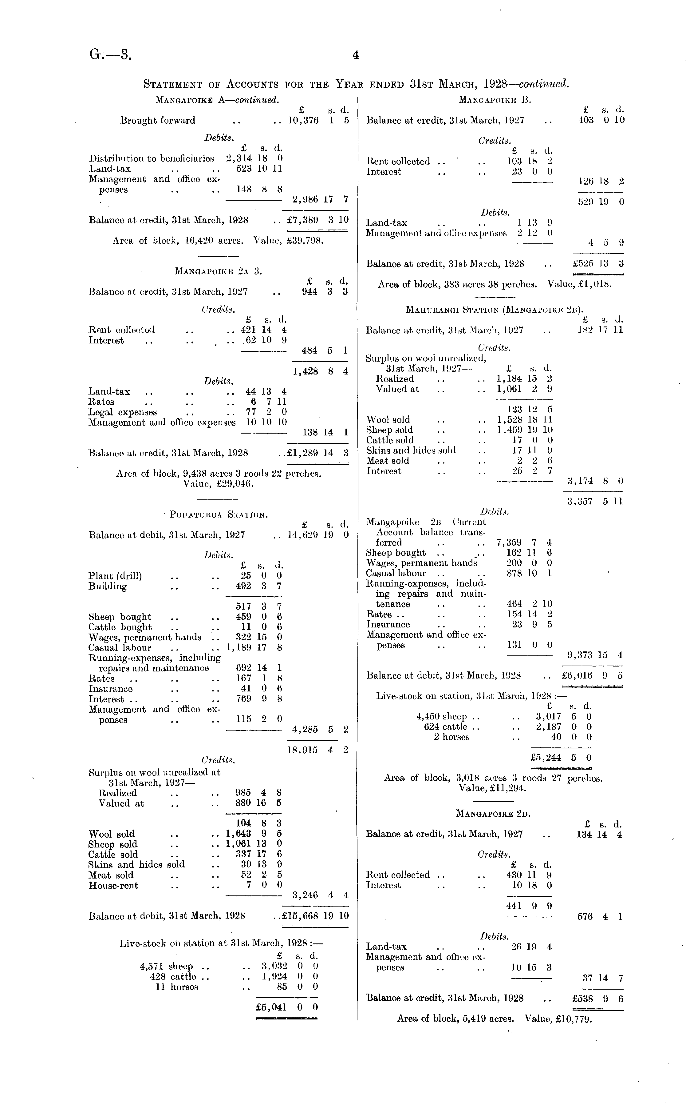 Statement of Accounts for the Year ended 31st March, 1928— continued. Mangapoike A— continued. Mangapoike B. £ s. d. £ s. d. Brought forward .. .. 10,376 1 5 Balance at credit, 31st March, 1927 .. 403 010 Debits. Credits. £ s. d. £ B , di Distribution to beneficiaries 2,314 18 0 Rent collected .. ' .. 103 18 2 Land-tax .. .. 523 10 11 Interest .. .. 23 0 0 Management and office ex- 126 18 2 penses .. .. 148 8 8 2,986 17 7 529 19 0 Debits. Balance at credit, 31st March, 1928 .. £7,389 310 Land-tax .. 113 9 Management and office expenses 2 1.2 0 Area of block, 16,420 acres. Value, £39,798. 4 5 9 Balance at credit, 31st March, 1928 .. £525 13 3 Mangapoike 2a 3. ==== _^_ £ s. d. Area of block, 383 acres 38 perches. Value, £1,018. Balance at credit, 31st March, 1927 .. 944 3 3 Credits. Mahurangi Station (Mangapoikio 2b). £ s. cl. £ s. d. Rent collected .. .. 421 14 4 Balance at credit, 31st March, 1927 .. 1821711 Interest .. .. .. 62 10 9 484 5 1 Credits. Surplus on wool unrealized, 1 428 8 4 31 st March, 1927— £ s. d. Debits. Realized .. 1,184 15 2 Land-tax .. .. .'. 44 13 4 Valued at .. .. 1,061 2 9 Ratos .. .. .. 6 711 ~ Legal expenses .. . . 77 2 0 l 2;i '- 1 s Management and dffloe expenses 10 10 10 Wool sold .. .. 1,528 18 11 138 14 1 Sheep sold .. .. 1,459 19 10 Cattle sold .. .. 17 0 0 Balance at credit, 31st March, 1928 ..£1,289 14 3 Skins and hides sold .. 17 11 9 — Meat sold .. .. 2 2 6 Area of block, 9,438 acres 3 roods 22 perches. Interest .. .. 25 2 7 Value, £29,046. — :i 8 0 3,357 5 11 ■ Pouaturoa Station. Debits. £ s. d. Mangapoike 2n Current Balaneo at debit, 31st March, 1927 .. 14,629 19 6 Account balance transferred .. .. 7,359 7 4 Debits. Sheep bought .. _.. 162 11 6 £ Si fl, Wages, permanent hands 200 0 0 Plant (drill) .. .. 25 0 0 Casual labour .. .. 878 10 1 Building .. .. 492 3 7 Running-expenses, inoluding repairs and main--517 3 7 tenanoe .. .. 464 210 Sheep bought .. .. 459 0 6 Rates •■• • • • 154 14 2 Cattle bought .. .. 11 0 6 Insurance .. .. 23 9 5 Wages, permanent hands '. . 322 15 0 Management and office exCasual labour .. .. 1,189 17 8 P enBes •• •• 131 °°, . . r Running-expenses, including 9,373 15 4 repairs and maintenance 092 14 1 Rates .. 167 1 8 Balance at debit, 31st March, .1928 .. £0,016 9 5 Insurance .. 41 0 0 l^*^ Interest ~ 769 9 8 Live-stock on station, 31st March, 1928 : — Management and office ex- £ s - ". penses .. .. 115 2 0 4,450 sheep .. .. 3,017 5 0 r 4 285 5 2 624 cattle.. .. 2,187 0 0 ' 2 horses .. 40 0 0 18,915 4 2 Credits. £5,244 5 0 Surplus on wool unrealized at . tln , ~,.,,, ~ j » 'T 31st March, 1927- Area of blook > %?" fZ L I0 ° da 21 peroheS ' Realized .. .. 985 4 8 Value, £11,294. Valued at .. .. 880 16 5 ■ Mangapoike 2d. 104 8 3 £ s. d. Wool sold .. .. 1,643 9 5 Balance at credit, 31st March, 1927 .. 134 14 4 Sheep sold .. .. 1,061 13 0 Cattle sold .. .. 337 17 6 Credits. Skins and hides sold 39 13 9 £ s. d. Moat sold .. .. 52 2 5 Rent collected .. ... 430 11 9 House-rent .. .. 7 0 0 Interest .. .. 10 18 O ■ 3,246 4 4 441 9 9 Balance at debit, 31st March, 1928 ..£15,668 19 10 576 4 1 Live-stock on station at 31st March, 1928: — Land-tax 26 19 4 £ s. d. Management and office ex--4,571 sheep .. .. 3,032 0 0 penses .. .. 10 15 3 428 cattle .. .. 1,924 0 0 37 14 7 11 horsos .. 85 0 0 . Balance at credit, 31st March, 1928 .. £538 9 6 £5,041 0 0 - ■—i—i—-r-r-r - Area of block, 5,419 acres. Value, £10,779.