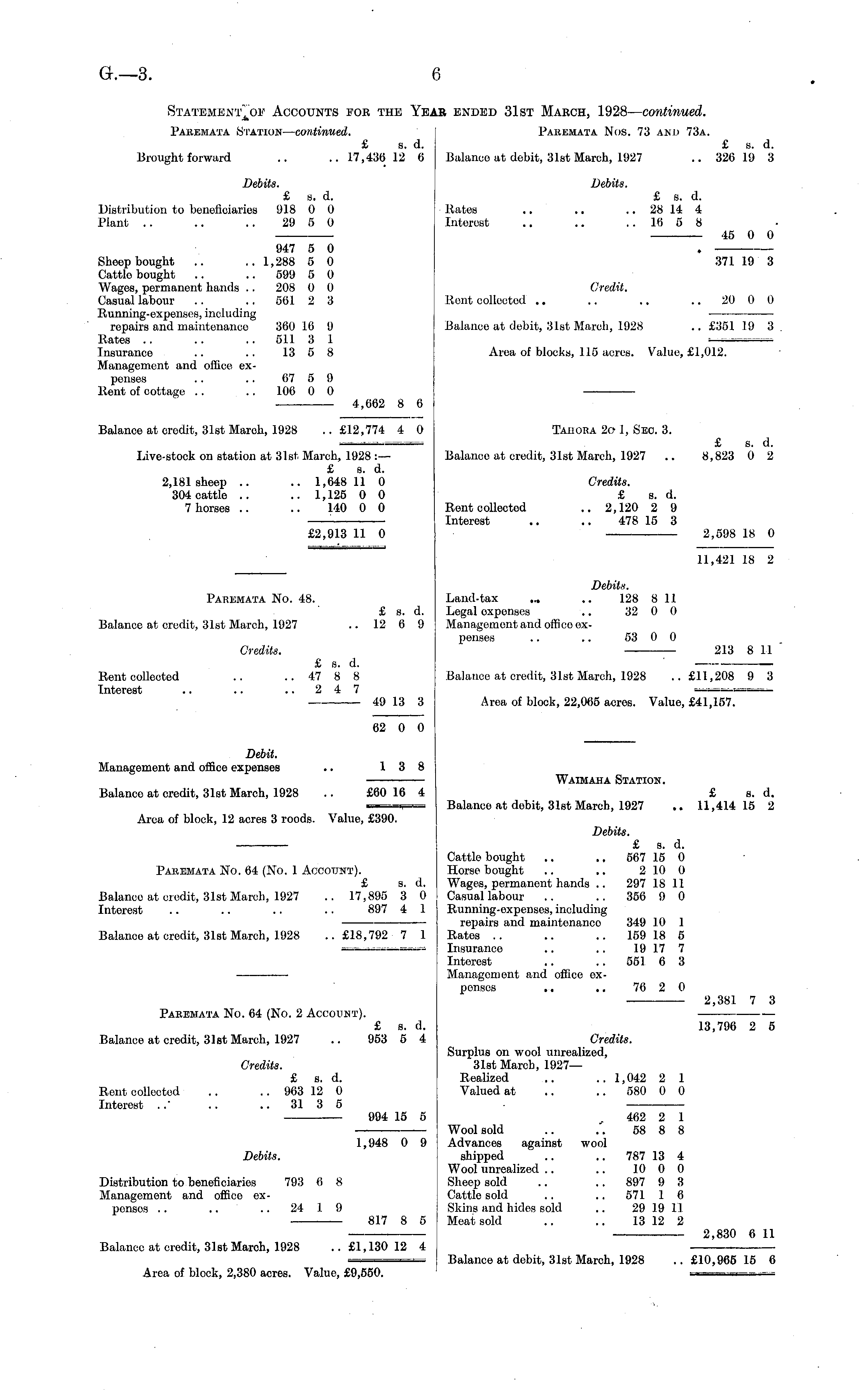 Statement\of Accounts for the Ybae ended 31st March, 1928 — continued. Paremata Station — continued. Paremata Nos. 73 and 73a. £ s. d. £ s. d. Brought forward .. .. 17,436 12 6 Balaneo at debit, 31st March, 1927 .. 326 19 3 Debits. Debits. £ s. d. £ s. d. Distribution to beneficiaries 918 0 0 Rates .. .. .. 28 14 4 Piant .. .. .. 29 5 0 Interest .. .. .. 16 5 8 45 0 0 947 5 0 . Sheep bought .... 1,288 5 0 371 19 3 Cattle bought .. .. 599 5 0 Wages, permanent hands .. 208 0 0 Credit. Casual labour .. .. 561 2 3 Rent collected .. .. .. 20 0 0 Running-expenses, including ropairs and maintenance 360 16 9 Balance at debit, 31st March, 1928 .. £351 19 3 Rates .. .. .. 511 3 1 r Insurance .. .. 13 5 8 Area of blocks, 115 acres. Value, £1,012. Management and office expenses .. .. 67 5 9 Rent of cottage .. .. 106 0 0 4,662 8 6 Balaneo at credit, 31st Maroh, 1928 .. £12,774 4 0 Tahora 2c ]~ Seo. 3. --t . -i ---■-, £ s. d. Live-stock on station at 31st Mai-ch, 1928 :— Balance at credit, 31st March, 1927 .. 8,823 0 2 £ s. d. 2,181 sheep .. .. 1,648 11 0 Credits. 304 cattle .. .. 1,125 0 0 £ s. d. 7 horses .. .. 140 0 0 Rent collected .. 2,120 2 9 : Interest .. .. 478 15 8 £2,913 II 0 2,598 18 0 11,421 18 2 Debits. Paremata No. 48. Land-tax ... .. 128 8 11 £ s. d. Logal oxponses .. 32 0 0 Balance at credit, 31st March, 1927 .. 12 6 9 Management and office expenses .. .. 53 0 0 Credits. 213 8 11 £ s. d. Rent collected .. .. 47 8 8 Balance at credit, 31st March, 1928 ..£11,208 9 3 Interest .. .. .. 2 4 7 — — — 49 13 3 Area of block, 22,065 acres. Value, £41,157. 62 0 0 Debit. Management and office expenses .. 13 8 Waimaha Station. Balance at credit, 31st March, 1928 .. £60 16 4 £ s. d. ■ M Balaneo at debit, 31st March, 1927 .. 11,414 15 2 Area of block, 12 acres 3 roods. Value, £390. Debits. £ s. d. Cattle bought .. .. 567 15 0 Paremata No. 64 (No. 1 Account). Horse bought .. .. 210 0 £ s. d. Wages, permanent hands .. 297 18 11 Balance at credit, 31st March, 1927 .. 17,895 3 0 Casual labour .. .. 356 9 0 Interest .. .. .. .. 897 4 1 Running-expenses, including repairs and maintenance 349 10 1 Balance at credit, 31st March, 1928 ..£18,792 7 1 Rates .. .. .. 159 18 5 —- - -»aaa Insurance .. .. 19 17 7 Interest .. .. 551 6 3 Managomont and office expenses .. .. 76 2 0 2,381 7 3 Pabemata No. 64 (No. 2 Account). £ s. d. 13,796 2 5 Balaneo at credit, 31st March, 1927 .. 953 5 4 Credits. Surplus on wool unrealized, Credits. 31st March, 1927— £ s. d. Realizod .. .. 1,042 2 1 Rent colloetod .. .. 963 12 0 Valued at .. 580 0 0 Intorcst ..' .. 31 3 5 • 994 15 5 462 2 1 Wool sold .. .'. 58 8 8 1,948 0 9 Advances against wool Debits. shipped .. .. 787 13 4 Wool unrealized .. .. 10 0 0 Distribution to beneficiaries 793 6 8 Sheep sold .. .. 897 9 3 Management and office ex- Cattle sold .. .. 571 1 6 ponsos .. .. .. 24 1 9 Skins and hides sold .. 29 19 1.1. 817 8 5 Meat sold .. .. 13 12 2 2,830 6 11 Balance at credit, 31st March, 1928 ..£1,130 12 4 ' Balance at debit, 31st March, 1928 .. £10,966 15 6 Area of block, 2,380 acres. Value, £9,550. „__ S= _ B===;