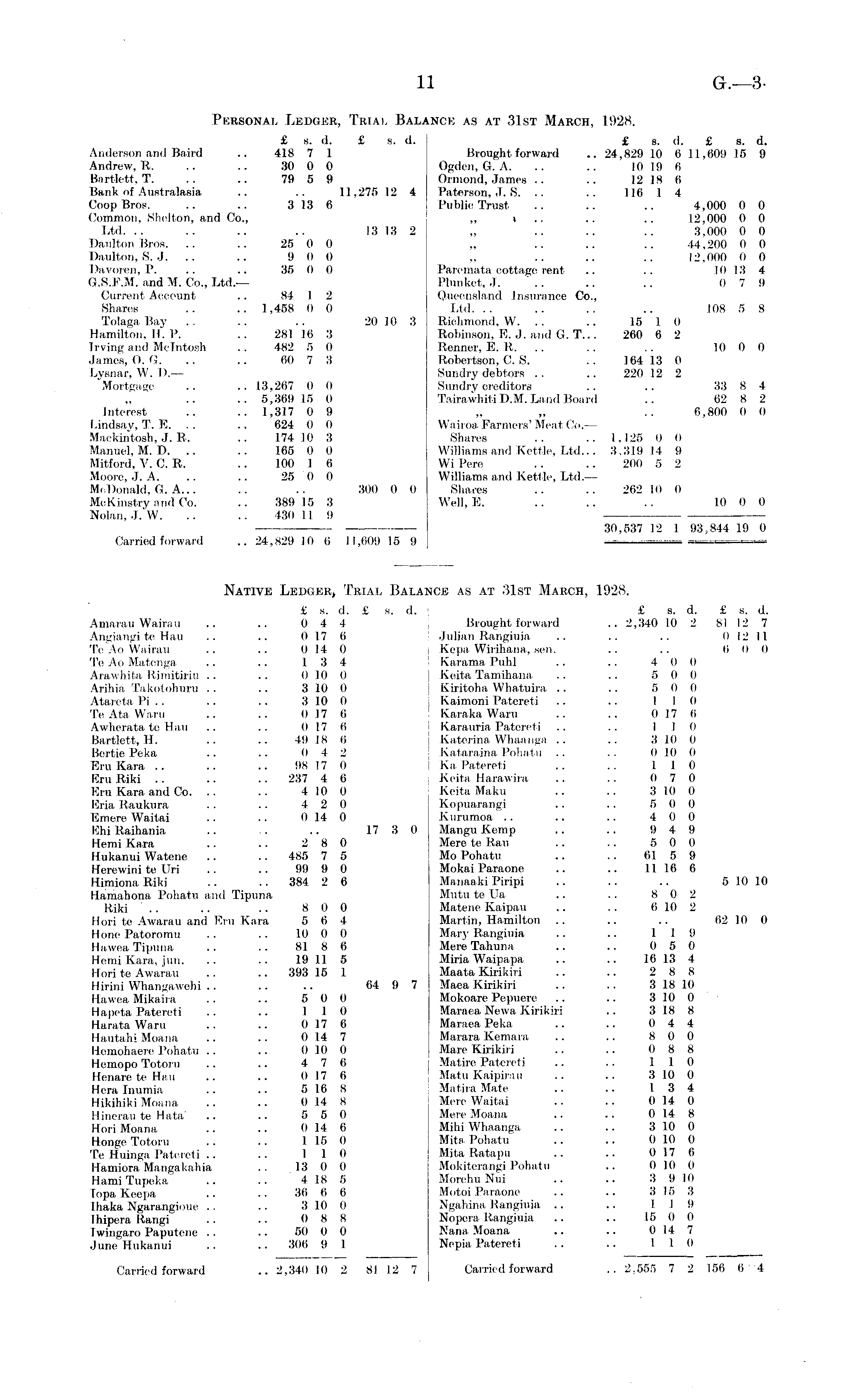 Personal Ledger, Trial Balance as at 31st March, 1928. £ s. d. £ s. d. £ s. cl. £ s. d. Anderson and Baird .. 418 7 1 Brought forward .. 24,829 10 6 11,609 15 9 Andrew, R. .. .. 30 0 0 Ogden, G. A. .. .. 10 19 6 Bartlett, T. .. .. 79 5 9 Ormond, James .. .. 12 18 6 Bank of Australasia .. .. 11,275 12 4 Paterson, J. S. .. .. 116 1 4 Coop Bros. .. .. 3 13 6 Public Trust .. .. .. 4,000 0 0 Common, Sholton, and Co., ~ i .. .. .. 12,000 0 0 Ltd. .. .. .. .. 13 13 2 „ .. .. .. 3.000 0 0 Daulton Bros. .. .. 25 0 0 „ .. .. .. 44,200 0 0 Daulton, S. J. .. .. 9 0 0 „ .. .. .. 12,000 0 0 Davoren, P. .. .. 35 0 0 Paremata cottage rent .. .. 10 13 4 G.S.F.M. and M. Co., Ltd.— Plnnket, J. .. .. .. 0 7 9 Current Account .. 84 I 2 Queensland Insurance Co., Shares .. .. 1,458 0 0 Ltd. .. .. .. .. 108 5 8 Tolaga Bay .. .. .. 20 10 3 Richmond, W. .. .. 15 1 0 Hamilton, H. P. .. 28116 3 Robinson, E. J. and G. T... 260 6 2 Irving and Mcintosh .. 482 5 0 Renner, E. R. .. .. .. 10 0 0 James, O. G. .. .. 60 7 3 Robertson, C. S. .. 164 13 0 Lysnar, W. !>.— Sundry debtors .. .. 220 12 2 Mortgage .. .. 13,267 0 0 Sundry creditors .. .. 33 8 4 .. 5,369 15 0 Tairawhiti D.M. Land Board .. 62 8 2 Interest .. .. 1,317 0 9 „ .. 6,800 0 0 Lindsav, T. E. . . .. 624 0 0 Wairoa Farmers' Meat, Co.— Mackintosh, J. R, .. 174 10 3 Shares .. .. 1,125 0 0 Manuel, M. D. .. .. 165 0 0 Williams and Kettle, Ltd... 3,319 14 9 Mitford, V. C. R. .. 100 I 6 Wi Pore .. .. 200 5 2 Moore, J. A. .. .. 25 0 0 Williams and Kettle, Ltd.— McDonald, G. A... .. .. 300 0 0 Shares .. .. 262 10 0 MoKinstrynndCo. .. 389 15 3 Well, E. .. .. .. 10 0 0 Nolan, J. W. .. .. 430 11 9 — 30,537 12 1 93,844 19 0 Carried forward .. 24,829 10 6 11,609 15 9 =■ r =_ Native Ledger, Trial Balance as at 31st March, 1928. £ s. d. £ s. d. j £ s. d. £ s. d. Amarau Wairau .. .. 0 4 4 Brought forward ..2,340 10 2 81 12 7 Angiangi te Hau .. .. 017 6 j Julian Rangiuia .. .. .. 012 11 Te Ao Wairau .. .. 0 14 0 \ Kepa Wirihana, sen. .. .. 6 0 0 Te Ao Matenga .. .. 13 4 i Karama Puhl .. .. 4 0 0 Arawhita Rimitiriu .. .. 0 10 0 Keita Tamihana .. .. 5 0 0 Arihia Takotohuru .. .. 3 10 0 Kiritoha Whatuira .. .. 5 0 0 Atareta Pi .. .. .. 310 0 Kaimoni Patcreti .. .. 110 Te Ata Warn .. .. 0 17 6 Karaka Waru .. .. 0 17 6 Awhcrata te Hau .. .. 0 17 6 Karauria Patereti .. .. 110 Bartlett, H. .. .. 49 18 6 Katcrina Whaanga .. .. 3 10 0 Bertie Peka .. .. 0 4 2 Kataraina Pohatu .. .. 0 10 0 Eru Kara .. .. .. 98 17 0 Ka Patereti .. .. 110 Era Riki .. .. .. 237 4 6 Keita Harawira .. .. 0 7 0 Eru Kara and Co. .. .. 4 10 0 Keita Maku .. .. 3 10 0 Eria Raukura . . .. 4 2 0 Kopuarangi .. .. 5 0 0 Kmere Waitai .. .. 0 14 0 Kurumoa .. .. .. 4 0 0 Khißaihania .. .. .. 17 3 0 Mangu Kemp .. .. 9 4 9 liemi Kara .. .. 2 8 0 Mere te Ran .. .. 5 0 0 Hukanui Watene .. .. 485 7 5 Mo Pohatu .. .. 61 5 9 Herewini te Uri .. .. 99 9 0 Mokai Paraone .. .. 11 16 6 Himiona Riki .. .. 384 2 6 Manaaki Piripi .. .. .. 510 10 Hamabona Pohatu and Tipuna Mutu te IJa .. .. 8 0 2 Riki .. .. .. 8 0 0 Matene Kaipau .. .. 610 2 Hori te Awarau and Eru Kara 5 6 4 Martin, Hamilton .. .. .. 62 10 0 Hone Patoromu . . .. 10 0 0 Mary Rangiuia .. .. 119 Hawea Tipuna .. .. 81 8 6 Mere Tahuna .. .. 0 5 0 Hemi Kara, jun. .. .. 19 11 5 Miria Waipapa .. .. 16 13 4 Hori te Awarau .. .. 393 15 1 Maata Kirikiri .. .. 2 8 8 Hirini Whangawehi .. .. .. 64 9 7 Maea Kirikiri .. .. 318 10 Hawea Mikaira .. .. 5 0 0 Mokoare Pepuere .. .. 310 0 Hapeta Patereti .. .. 110 Maraea Newa Kirikiri .. 3 18 8 Ha rata Warn .. .. 0 17 6 Maraea Peka .. .. 0.4 4 Hautahi Moana .. .. 0 14 7 Marara Kemara .. .. 8 0 0 Hemohaerc Pohatu .. .. 0 10 0 Mare Kirikiri .. .. 0 8 8 Hemopo Totoru .. .. 4 7 6 Matiro Patereti .. .. 110 HenareteHini .. .. 0 17 6 Matu Kaipirau .. .. 3 10 0 Hera Inumia .. .. 5 16 8 Matira Mate .. .. 13 4 Hikihiki Moana .. .. 0 14 8 Mere Waitai .. .. 0 14 0 Hinerau te Hata' .. -. 5 5 0 Mere Moana .. .. 014 8 Hori Moana .. .. 0 14 6 Mihi Whaanga .. .. 3 10 0 Honge Totoru .. .. 115 0 Mita Pohatu .. .. 010 0 Te Huinga Patereti .. .. 110 Mita Ratapu .. .. 0 17 6 liamiora Mangakahia .. 13 0 0 Mokitcrangi Pohatu .. 0 10 0 HamiTupeka .. .. 4 18 5 Morehu Nui .. .. 3 9 10 fopa Keepa .. .. 36 6 6 Motoi Paraone .. .. 3 15 3 IhakaNgarangioue .. .. 3 10 0 Ngahina Rangiuia .. .. 119 I hipera Rangi .. .. 0 8 8 Nopera Rangiuia .. .. 15 0 0 Iwingaro Paputene .. .. 50 0 0 Nana Moana .. .. 0 14 7 June Hukanui .. .. 306 9 1 Nepia Patereti .. .. 110 Carried forward .. 2,340 10 2 81 12 7 Carried forward .. 2,555 7 2 156 6 4