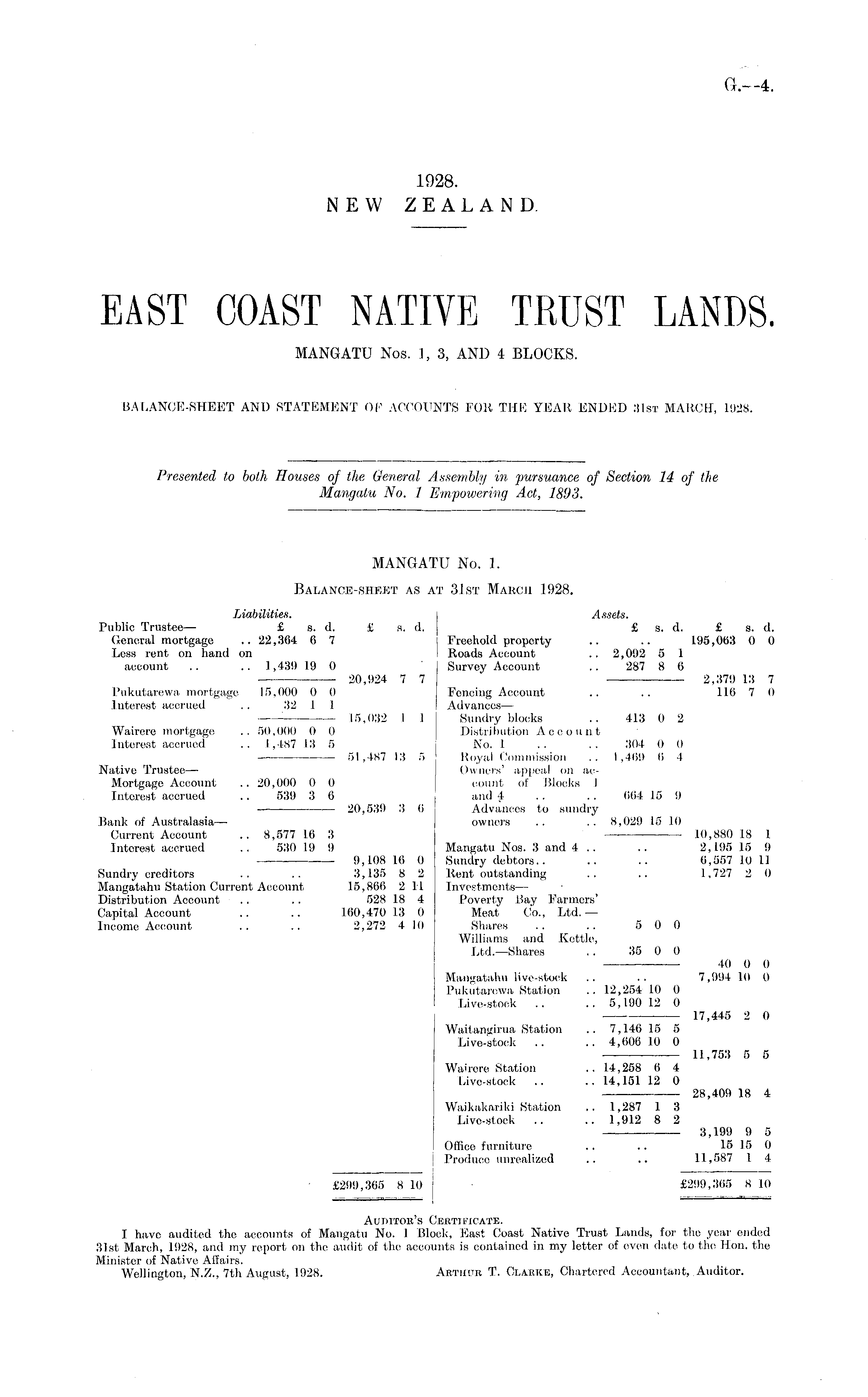 EAST COAST NATIVE TRUST LANDS. MANGATU Nos. 1, 3, AND 4 BLOCKS. BALANCE-SHEET AND STATEMENT OF ACCOUNTS FOR THE YEAR ENDED 31st MARCH, 1928.