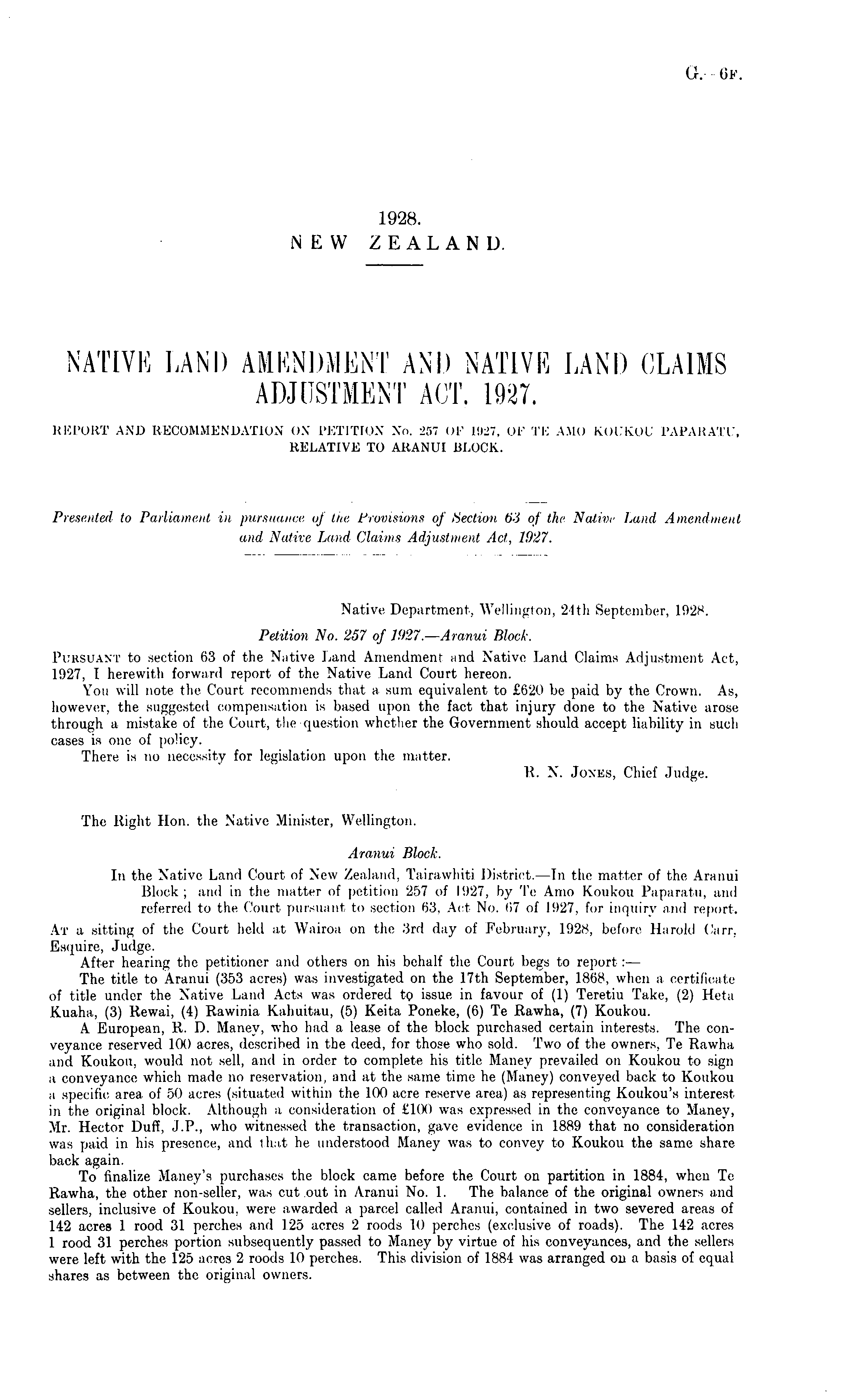 The Right Hon. the Native Minister, Wellington. Aranui Block. In the Native Land Court of New Zealand, Tairawhiti District.—ln the matter of the Aranui Block ; and in the matter of petition 257 of 1927, by Te Amo Koukou Paparatu, and referred to the Court pursuant to section 63, Act No. 67 of 1927, for inquiry and report. At a sitting of the Court held at Wairoa on the 3rd day of February, 1928, before Harold Carr. Esquire, Judge. After hearing the petitioner and others on his behalf the Court begs to report:— The title to Aranui (353 acres) was investigated on the 17th September, 1868, when a certificate of title under the Native Land Acts was ordered tp issue in favour of (1) Teretiu Take, (2) Heta Kuaha, (3) Rewai, (4) Rawinia Kahuitau, (5) Keita Poneke, (6) Te Rawha, (7) Koukou. A European, R. D. Maney, who had a lease of the block purchased certain interests. The conveyance reserved 100 acres, described in the deed, for those who sold. Two of the owners, Te Rawha and Koukou, would not sell, and in order to complete his title Maney prevailed on Koukou to sign a conveyance which made no reservation, and at the same time he (Maney) conveyed back to Koukou a specific area of 50 acres (situated within the 100 acre reserve area) as representing Koukou's interest in the original block. Although a consideration of £100 was expressed in the conveyance to Maney, Mr. Hector Duff, J.P., who witnessed the transaction, gave evidence in 1889 that no consideration was paid in his presence, and that he understood Maney was to convey to Koukou the same share back again. To finalize Maney's purchases the block came before the Court on partition in 1884, when Te Rawha, the other non-seller, was exit .out in Aranui No. 1. The balance of the original owners and sellers, inclusive of Koukou, were awarded a parcel called Aranui, contained in two severed areas of 142 acres 1 rood 31 perches and 125 acres 2 roods 10 perches (exclusive of roads). The 142 acres 1 rood 31 perches portion subsequently passed to Maney by virtue of his conveyances, and the sellers were left with the 125 acres 2 roods 10 perches. This division of 1884 was arranged on a basis of equal shares as between the original owners.