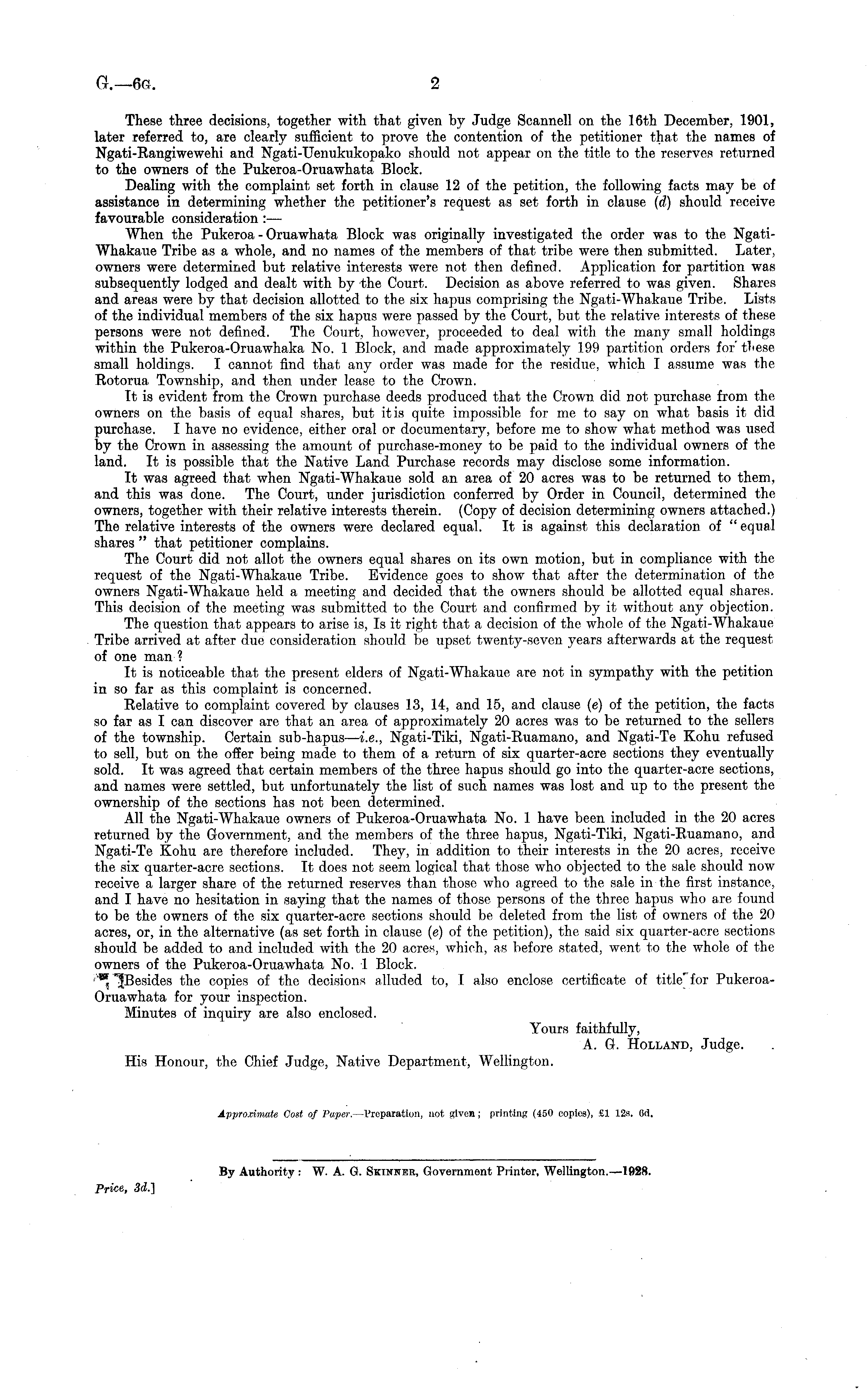 These three decisions, together with that given by Judge Scannell on the 16th December, 1901, later referred to, are clearly sufficient to prove the contention of the petitioner that the names of Ngati-Rangiwewehi and Ngati-Uenukukopako should not appear on the title to the reserves returned to the owners of the Pukeroa-Oruawhata Block. Dealing with the complaint set forth in clause 12 of the petition, the following facts may be of assistance in determining whether the petitioner's request as set forth in clause (d) should receive favourable consideration:— When the Pukeroa - Oruawhata Block was originally investigated the order was to the NgatiWhakaue Tribe as a whole, and no names of the members of that tribe were then submitted. Later, owners were determined but relative interests were not then defined. Application for partition was subsequently lodged and dealt with by the Court. Decision as above referred to was given. Shares and areas were by that decision allotted to the six hapus comprising the. Ngati-Whakaue Tribe. Lists of the individual members of the six hapus were passed by the Court, but the relative interests of these persons were not defined. The Court, however, proceeded to deal with the many small holdings within the Pukeroa-Oruawhaka No. 1 Block, and made approximately 199 partition orders for' these small holdings. I cannot find that any order was made for the residue, which I assume was the Rotorua Township, and then under lease to the Crown. It is evident from the Crown purchase deeds produced that the Crown did. not purchase from the owners on the basis of equal shares, but it is quite impossible for me to say on what basis it did purchase. I have no evidence, either oral or documentary, before me to show what method was used by the Crown in assessing the amount of purchase-money to be paid to the individual owners of the land. It is possible that the Native Land Purchase records may disclose some information. It was agreed that when Ngati-Whakaue sold an area of 20 acres was to be returned to them, and this was done. The Court, under jurisdiction conferred by Order in Council, determined the owners, together with their relative interests therein. (Copy of decision determining owners attached.) The relative interests of the owners were declared equal. It is against this declaration of "equal shares " that petitioner complains. The Court did not allot the owners equal shares on its own motion, but in compliance with the request of the Ngati-Whakaue Tribe. Evidence goes to show that after the determination of the owners Ngati-Whakaue held a meeting and decided that the owners should be allotted equal shares. This decision of the meeting was submitted to the Court and confirmed by it without any objection. The question that appears to arise is, Is it right that a decision of the whole of the Ngati-Whakaue Tribe arrived at after due consideration should be upset twenty-seven years afterwards at the request of one man ? It is noticeable that the present elders of Ngati-Whakaue are not in sympathy with the petition in so far as this complaint is concerned. Relative to complaint covered by clauses 13, 14, and 15, and clause (c) of the petition, the facts so far as I can discover are that an area of approximately 20 acres was to bo returned to the sellers of the township. Certain sub-hapus— i.e., Ngati-Tiki, Ngati-Ruamano, and Ngati-Te Kohu refused to sell, but on the offer being made to them of a return of six quarter-acre sections they eventually sold. It was agreed that certain members of the three hapus should go into the quarter-acre sections, and names were settled, but unfortunately the list of such names was lost and up to the present the ownership of the sections has not been determined. All the Ngati-Whakaue owners of Pukeroa-Oruawhata No. 1 have been included in the 20 acres returned by the Government, and the members of the three hapus, Ngati-Tiki, Ngati-Ruamano, and Ngati-Te Kohu are therefore included. They, in addition to their interests in the 20 acres, receive the six quarter-acre sections. It does not seem logical that those who objected to the sale should now receive a larger share of the returned reserves than those who agreed to the sale in the first instance, and I have no hesitation in saying that the names of those persons of the three hapus who are found to be the owners of the six quarter-acre sections should be deleted from the list of owners of the 20 acres, or, in the alternative (as set forth in clause (c) of the petition), the said six quarter-acre sections should be added to and included with the 20 acres, which, as before stated, went to the whole of the owners of the Pukeroa-Oruawhata No. 1 Block. ''* the copies of the decisions alluded to, I also enclose certificate of PukeroaOruawhata for your inspection. Minutes of inquiry are also enclosed. Yours faithfully, A. G. Holland, Judge. His Honour, the Chief Judge, Native Department, Wellington.