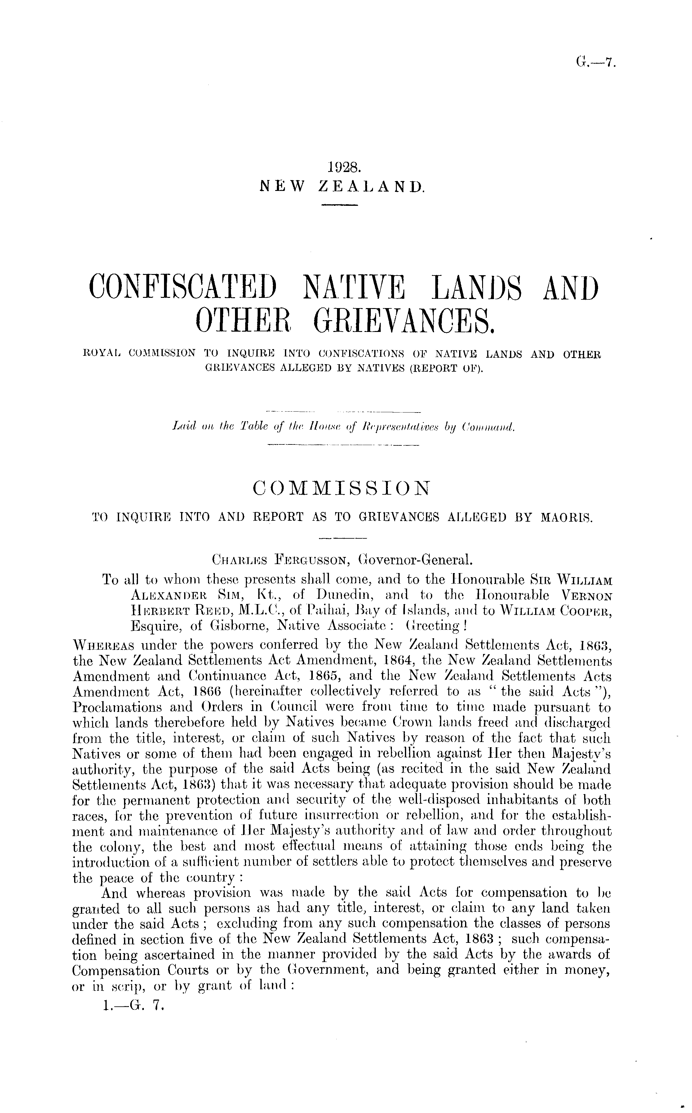 COMMISSION TO INQUIRE INTO AND REPORT AS TO GRIEVANCES ALLEGED BY MAORIS. Charles Fergusson, Governor-General. To all to whom these presents shall come, and to the Honourable Sir William Alexander Sim, Kt., of Dunedin, and to the Honourable Vernon Herbert Reed, M.L.C., of Paihai, Bay of Islands, and to William Cooper, Esquire, of Gisborne, Native Associate : Greeting! Whereas under the powers conferred by the New Zealand Settlements Act, 1863, the New Zealand Settlements Act Amendment, 1864, the New Zealand Settlements Amendment and Continuance Act, 1865, and the New Zealand Settlements Acts Amendment Act, 1866 (hereinafter collectively referred to as " the said Acts "), Proclamations and Orders in Council were from time to time made pursuant to which lands therebefore held by Natives became Crown lands freed and discharged from the title, interest, or claim of suoh Natives by reason of the fact that such Natives or some of them had been engaged in rebellion against Her then Majesty's authority, the purpose of the said Acts being (as recited in the said New Zealand Settlements Act, 1863) that it was necessary that adequate provision should be made for the permanent protection and security of the well-disposed inhabitants of both races, for the prevention of future insurrection or rebellion, and for the establishment and maintenance of Her Majesty's authority and of law and order throughout the colony, the best and most effectual means of attaining those ends being the introduction of a sufficient number of settlers able to protect themselves and preserve the peace of the country : And whereas provision was made by the said Acts for compensation to be granted to all such persons as had any title, interest, or claim to any land taken under the said Acts ; excluding from any such compensation the classes of persons defined in section five of the New Zealand Settlements Act, 1863 ; such compensation being ascertained in the manner provided by the said Acts by the awards of Compensation Courts or by the Government, and being granted either in money, or in scrip, or by grant of land :