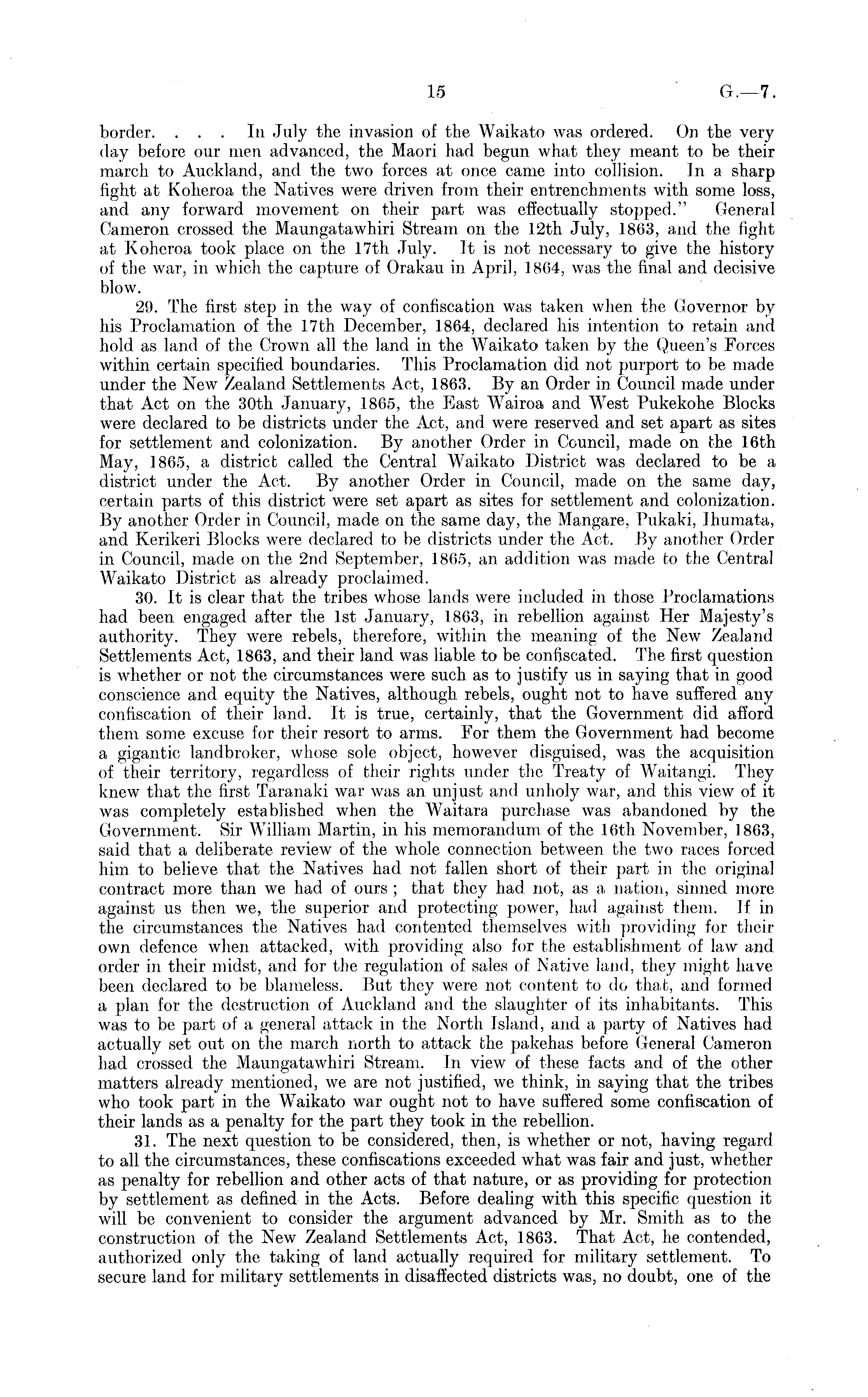 border. ... In July the invasion of the Waikato was ordered. On the very day before our men advanced, the Maori had begun what they meant to be their march to Auckland, and the two forces at once came into collision. In a sharp fight at Koheroa the Natives were driven from their entrenchments with some loss, and any forward movement on their part was effectually stopped." General Cameron crossed the Maungatawhiri Stream on the 12th July, 1863, and the fight at Koheroa took place on the 17th July. It is not necessary to give the history of the war, in which the capture of Orakau in April, 1864, was the final and decisive blow. 29. The first step in the way of confiscation was taken when the Governor by his Proclamation of the 17th December, 1864, declared his intention to retain and hold as land of the Crown all the land in the Waikato taken by the Queen's Forces within certain specified boundaries. This Proclamation did not purport to be made under the New Zealand Settlements Act, 1863. By an Order in Council made under that Act on the 30th January, 1865, the East Wairoa and West Pukekohe Blocks were declared to be districts under the Act, and were reserved and set apart as sites for settlement and colonization. By another Order in Council, made on the 16th May, 1865, a district called the Central Waikato District was declared to be a district under the Act. By another Order in Council, made on the same day, certain parts of this district were set apart as sites for settlement and colonization. By another Order in Council, made on the same day, the Mangare, Pukaki, Ihumata, and Kerikeri Blocks were declared to be districts under the Act. By another Order in Council, made on the 2nd September, 1865, an addition was made to the Central Waikato District as already proclaimed. 30. It is clear that the tribes whose lands were included in those Proclamations had been engaged after the Ist January, 1863, in rebellion against Her Majesty's authority. They were rebels, therefore, within the meaning of the New Zealand Settlements Act, 1863, and their land was liable to be confiscated. The first question is whether or not the circumstances were such as to justify us in saying that in good conscience and equity the Natives, although, rebels, ought not to have suffered any confiscation of their land. It is true, certainly, that the Government did afford them some excuse for their resort to arms. For them the Government had become a gigantic landbroker, whose sole object, however disguised, was the acquisition of their territory, regardless of their rights under the Treaty of Waitangi. They knew that the first Taranaki war was an unjust and unholy war, and this view of it was completely established when the Waitara purchase was abandoned by the Government. Sir William Martin, in his memorandum of the 16th November, 1863, said that a deliberate review of the whole connection between the two races forced him to believe that the Natives had not fallen short of their part in the original contract more than we had of ours ; that they had not, as a nation, sinned more against us then we, the superior and protecting power, had against them. If in the circumstances the Natives had contented themselves with providing for their own defence when attacked, with providing also for the establishment of law and order in their midst, and for the regulation of sales of Native land, they might have been declared to be blameless. But they were not content to do that, and formed a plan for the destruction of Auckland and the slaughter of its inhabitants. This was to be part of a general attack in the North Island, and a party of Natives had actually set out on the march north to attack the pakehas before General Cameron had crossed the Maungatawhiri Stream. In view of these facts and of the other matters already mentioned, we are not justified, we think, in saying that the tribes who took part in the Waikato war ought not to have suffered some confiscation of their lands as a penalty for the part they took in the rebellion. 31. The next question to be considered, then, is whether or not, having regard to all the circumstances, these confiscations exceeded what was fair and just, whether as penalty for rebellion and other acts of that nature, or as providing for protection by settlement as defined in the Acts. Before dealing with this specific question it will be convenient to consider the argument advanced by Mr. Smith as to the construction of the New Zealand Settlements Act, 1863. That Act, he contended, authorized only the taking of land actually required for military settlement. To secure land for military settlements in disaffected districts was, no doubt, one of the