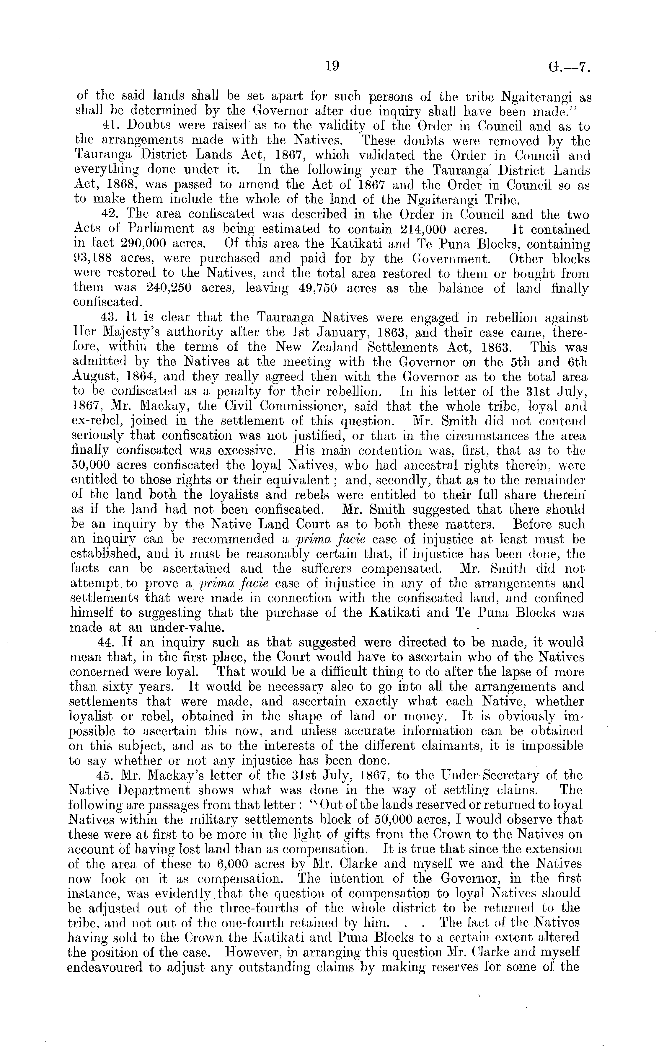 of the said lands shall be set apart for such persons of the tribe Ngaiterangi as shall be determined by the Governor after due inquiry shall have been made." 41. Doubts were raised'as to the validity of the Order in Council and as to the arrangements made with the Natives. These doubts were removed by the Tauranga District Lands Act, 1867, which validated the Order in Council and everything done under it. In the following year the Tauranga' District Lands Act, 1868, was passed to amend the Act of .1867 and the Order in Council so as to make them, include the whole of the land of the Ngaiterangi Tribe. 42. The area confiscated was described in the Order in Council and the two Acts of Parliament as being estimated to contain 214,000 acres. It contained in fact 290,000 acres. Of this area the Katikati and Te Puna Blocks, containing 93,188 acres, were purchased and paid for by the Government. Other blocks were restored to the Natives, and the total area restored to them or bought from them was 240,250 acres, leaving 49,750 acres as the balance of land finally confiscated. 43. It is clear that the Tauranga Natives were engaged in rebellion against Her Majesty's authority after the Ist January, 1863, and their case came, therefore, within the terms of the New Zealand Settlements Act, 1863. This was admitted by the Natives at the meeting with the Governor on the sth and 6th August, 1864, and they really agreed then with the Governor as to the total area to be confiscated as a penalty for their rebellion. In his letter of the 3.lst July, 1867, Mr. Mackay, the Civil Commissioner, said that the whole tribe, loyal and ex-rebel, joined in the settlement of this question. Mr. Smith did not contend seriously that confiscation was not justified, or that in the circumstances the area finally confiscated was excessive. His main contention was, first, that as to the 50,000 acres confiscated the loyal Natives, who had ancestral rights therein, were entitled to those rights or their equivalent ; and, secondly, that as to the remainder of the land both the loyalists and rebels were entitled to their full share therein as if the land had not been confiscated. Mr. Smith suggested that there should be an inquiry by the Native Land Court as to both these matters. Before such an inquiry can be recommended a prima facie case of injustice at least must be established, and it must be reasonably certain that, if injustice has been done, the facts can be ascertained and the sufferers compensated. Mr. Smith did not attempt to prove a 'prima, facie case of injustice in any of the arrangements and settlements that were made in connection, with the confiscated land, and confined himself to suggesting that the purchase of the Katikati and Te Puna Blocks was made at an under-value. 44. If an inquiry such as that suggested were directed to be made, it would mean that, in the first place, the Court would have to ascertain who of the Natives concerned were loyal. That would be a difficult thing to do after the lapse of more than sixty years. It would be necessary also to go into all the arrangements and settlements that were made, and ascertain exactly what each Native, whether loyalist or rebel, obtained in the shape of land or money. It is obviously impossible to ascertain this now, and unless accurate information can be obtained on this subject, and as to the interests of the different claimants, it is impossible to say whether or not any injustice has been done. 45. Mr. Mackay's letter of the 31st July, 1867, to the Under-Secretary of the Native Department shows what was done in the way of settling claims. The following are passages from that letter : " Out of the lands reserved or returned to loyal Natives within the military settlements block of 50,000 acres, I would observe that these were at first to be more in the light of gifts from the Crown to the Natives on account of having lost land than as compensation. It is true that since the extension of the area of these to 6,000 acres by Mr. Clarke and myself we and the Natives now look on it as compensation. The intention of the Governor, in the first instance, was evidently.that the question of compensation to loyal Natives should be adjusted out of the three-fourths of the whole district to be returned to the tribe, and not out of the one-fourth retained by him. . . The fact of the Natives having sold to the Crown the Katikati and Puna Blocks to a certain extent altered the position of the case. However, in arranging this question Mr. Clarke and myself endeavoured to adjust any outstanding claims by making reserves for some of the