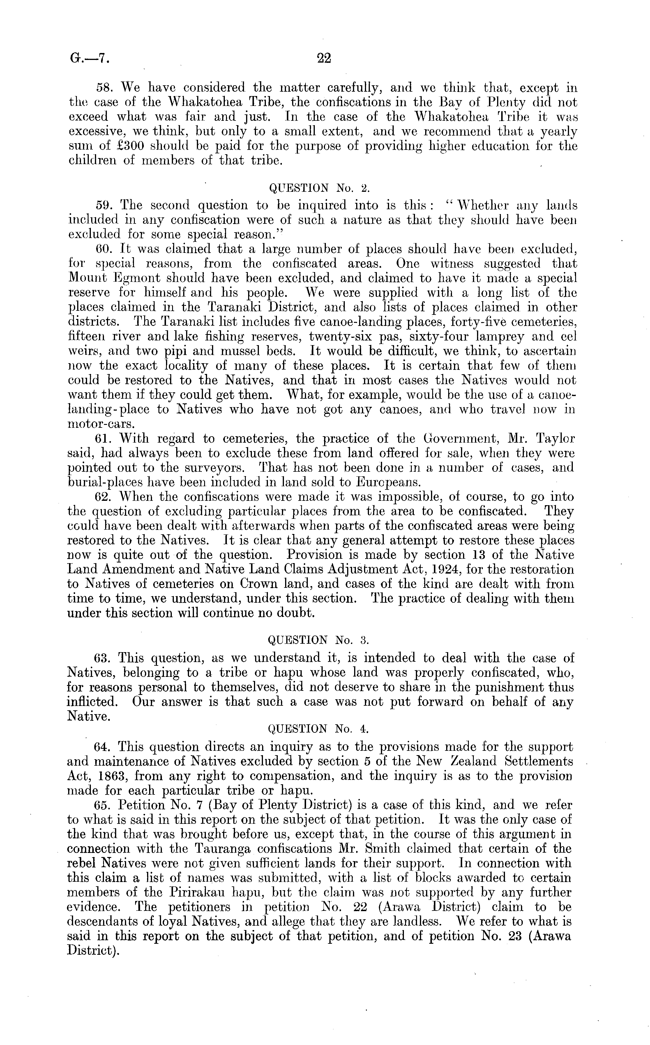 58. We have considered the matter carefully, and we think that, except in the case of the Whakatohea Tribe, the confiscations in the Bay of Plenty did not exceed what was fair and just. In the case of the Whakatohea Tribe it was excessive, we think, but only to a small extent, and we recommend that a yearly sum of £300 should be paid for the purpose of providing higher education for the children of members of that tribe. QUESTION No. 2. 59. The second question to be inquired into is this : " Whether any lands included in any confiscation were of such a nature as that they should have been excluded for some special reason." 60. It was claimed that a large number of places should have been excluded, for special reasons, from the confiscated areas. One witness suggested that Mount Egmont should have been excluded, and claimed to have it made a special reserve for himself and his people. We were supplied with a long list of the places claimed in the Taranaki District, and also lists of places claimed in other districts. The Taranaki list includes five canoe-landing places, forty-five cemeteries, fifteen river and lake fishing reserves, twenty-six pas, sixty-four lamprey and eel weirs, and two pipi and mussel beds. It would be difficult, we think, to ascertain now the exact locality of many of these places. It is certain that few of them could be restored to the Natives, and that in most cases the Natives would not want them if they could get them. What, for example, would be the use of a canoe-landing-place to Natives who have not got any canoes, and who travel now in motor-cars. 61. With regard to cemeteries, the practice of the Government, Mr. Taylor said, had always been to exclude these from land offered for sale, when they were pointed out to the surveyors. That has not been done in a number of cases, and burial-places have been included in land sold to Europeans. 62. When the confiscations were made it was impossible, of course, to go into the question of excluding particular places from the area to be confiscated. They could have been dealt with afterwards when parts of the confiscated areas were being restored to the Natives. It is clear that any general attempt to restore these places now is quite out of the question. Provision is made by section 13 of the Native Land Amendment and Native Land Claims Adjustment Act, 1924, for the restoration to Natives of cemeteries on Crown land, and cases of the kind are dealt with from time to time, we understand, under this section. The practice of dealing with them under this section will continue no doubt. QUESTION No. 3. 63. This question, as we understand it, is intended to deal with the case of Natives, belonging to a tribe or hapu whose land was properly confiscated, who, for reasons personal to themselves, did not deserve to share in the punishment thus inflicted. Our answer is that such a case was not put forward on behalf of any Native. QUESTION No. 4. 64. This question directs an inquiry as to the provisions made for the support and maintenance of Natives excluded by section 5 of the New Zealand Settlements Act, 1863, from any right to compensation, and the inquiry is as to the provision made for each particular tribe or hapu. 65. Petition No. 7 (Bay of Plenty District) is a case of this kind, and we refer to what is said in this report on the subject of that petition. It was the only case of the kind that was brought before us, except that, in the course of this argument in connection with the Tauranga confiscations Mr. Smith claimed that certain of the rebel Natives were not given sufficient lands for their support. In connection with this claim a list of names was submitted, with a list of blocks awarded to certain members of the Pirirakau hapu, but the claim was not supported by any further evidence. The petitioners in petition No. 22 (Arawa District) claim to be descendants of loyal Natives, and allege that they are landless. We refer to what is said in this report on the subject of that petition, and of petition No. 23 (Arawa District).