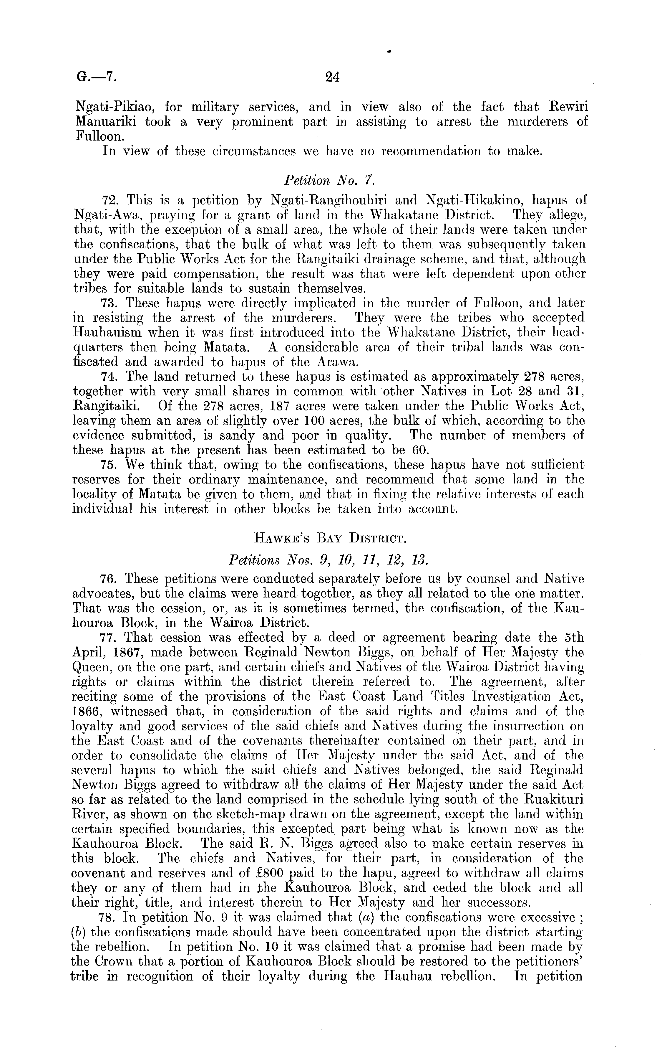 Ngati-Pikiao, for military services, and in view also of the fact that Rewiri Manuariki took a very prominent part in assisting to arrest the murderers of Fulloon. In view of these circumstances we have no recommendation to make. Petition No. 7. 72. This is a petition by Ngati-Rangihouhiri and Ngati-Hikakino, hapus of Ngati-Awa, praying for a grant of land in the Whakatane District. They allege, that, with the exception of a small area, the whole of their lands were taken under the confiscations, that the bulk of what was left to them was subsequently taken under the Public Works Act for the Rangitaiki drainage scheme, and that, although they were paid compensation, the result was that were left dependent upon other tribes for suitable lands to sustain themselves. 73. These hapus were directly implicated in the murder of Fulloon, and later in resisting the arrest of the murderers. They were the tribes who accepted Hauhauism when it Was first introduced into the Whakatane District, their headquarters then being Matata. A considerable area of their tribal lands was confiscated and awarded to hapus of the Arawa. 74. The land returned to these hapus is estimated as approximately 278 acres, together with very small shares in common with other Natives in Lot 28 and 31, Rangitaiki. Of the 278 acres, 187 acres were taken under the Public Works Act, leaving them an area of slightly over 100 acres, the bulk of which, according to the evidence submitted, is sandy and poor in quality. The number of members of these hapus at the present has been estimated to be 60. 75. We think that, owing to the confiscations, these hapus have not sufficient reserves for their ordinary maintenance, and recommend that some land in the locality of Matata be given to them, and that in fixing the relative interests of each individual his interest in other blocks be taken into account. Hawke's Bay District. Petitions Nos. 9, 10, 11, 12, 13. 76. These petitions were conducted separately before us by counsel and Native advocates, but the claims were heard together, as they all related to the one matter. That was the cession, or, as it is sometimes termed, the confiscation, of the Kauhouroa Block, in the Wairoa District. 77. That cession was effected by a deed or agreement bearing date the sth April, 1867, made between Reginald Newton Biggs, on behalf of Her Majesty the Queen, on the one part, and certain chiefs and Natives of the Wairoa District having rights or claims within the district therein referred to. The agreement, after reciting some of the provisions of the East Coast Land Titles Investigation Act, 1866, witnessed that, in consideration of the said rights and claims and of the loyalty and good services of the said chiefs and Natives during the insurrection on the East Coast and of the covenants thereinafter contained on their part, and in order to consolidate the claims of Her Majesty under the said Act, and of the several hapus to which the said chiefs and Natives belonged, the said Reginald Newton Biggs agreed to withdraw all the claims of Her Majesty under the said Act so far as related to the land comprised in the schedule lying south of the Ruakituri River, as shown on the sketch-map drawn on the agreement, except the land within certain specified boundaries, this excepted part being what is known now as the Kauhouroa Block. The said R. N. Biggs agreed also to make certain reserves in this block. The chiefs and Natives, for their part, in. consideration of the covenant and reserves and of £800 paid to the hapu, agreed to withdraw all claims they or any of them had in the Kauhouroa Block, and ceded the block and all their right, title, and interest therein to Her Majesty and her successors. 78. In petition No. 9 it was claimed that (a) the confiscations were excessive ; (b) the confiscations made should have been concentrated upon the district starting the rebellion. In petition No. 10 it was claimed that a promise had been made by the Crown that a portion of Kauhouroa Block should be restored to the petitioners' tribe in recognition of their loyalty during the Hauhau rebellion. In petition