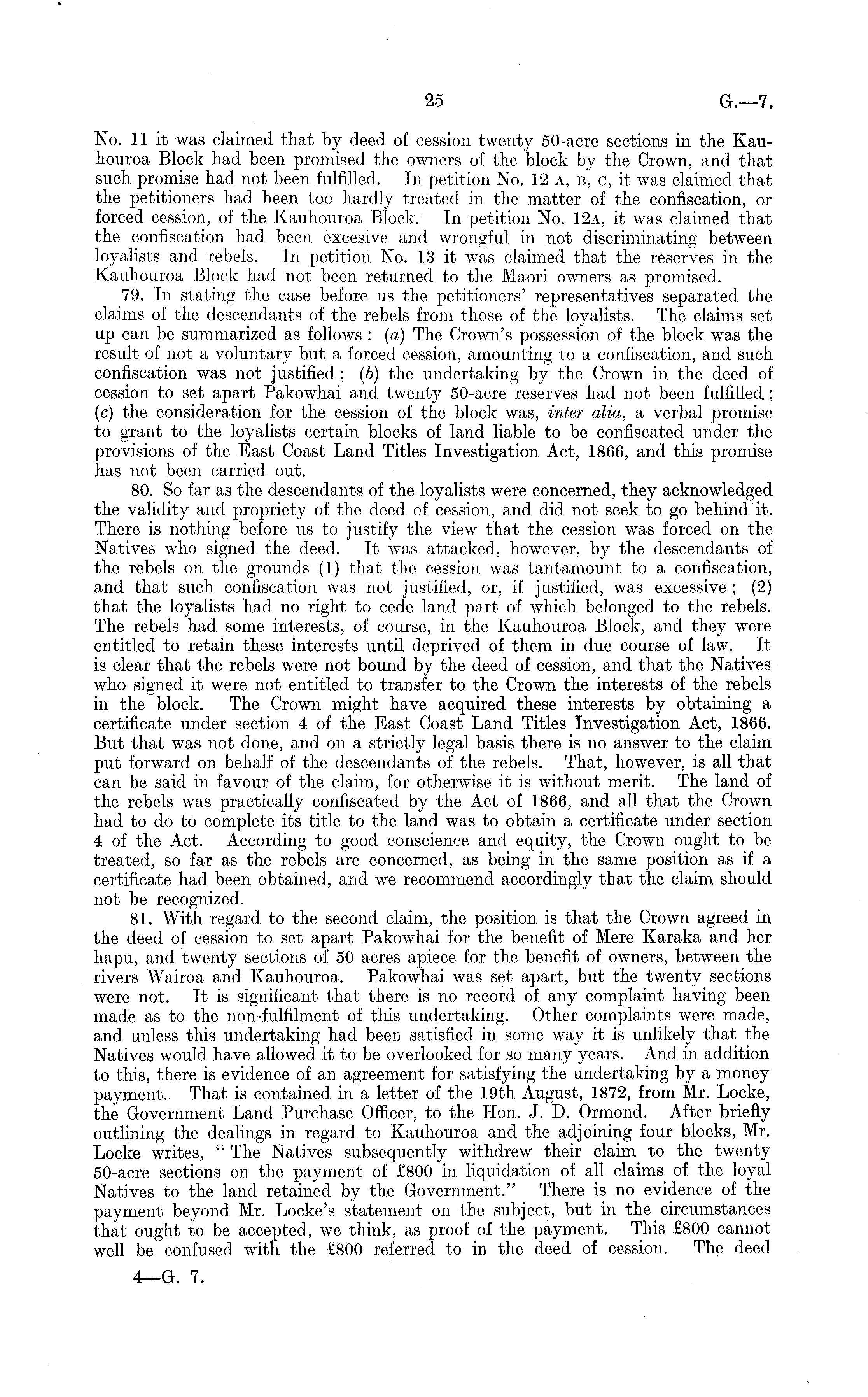 No. 11 it was claimed that by deed of cession twenty 50-acre sections in the Kauhouroa Block had been promised the owners of the block by the Crown, and that such promise had not been fulfilled. In petition No. 12 a, b, c, it was claimed that the petitioners had been too hardly treated in the matter of the confiscation, or forced cession, of the Kauhouroa Block. In petition No. 12a, it was claimed that the confiscation had been excesive and wrongful in not discriminating between loyalists and rebels. In petition No. 13 it was claimed that the reserves in the Kauhouroa Block had not been returned to the Maori owners as promised. 79. In stating the case before us the petitioners' representatives separated the claims of the descendants of the rebels from those of the loyalists. The claims set up can be summarized as follows : (a) The Crown's possession of the block was the result of not a voluntary but a forced cession, amounting to a confiscation, and such confiscation was not justified ; (b) the undertaking by the Crown in the deed of cession to set apart Pakowhai and twenty 50-acre reserves had not been fulfilled; (c) the consideration for the cession of the block was, inter alia, a verbal promise to grant to the loyalists certain blocks of land liable to be confiscated under the provisions of the East Coast Land Titles Investigation Act, 1866, and this promise has not been carried out. 80. So far as the descendants of the loyalists were concerned, they acknowledged the validity and propriety of the deed, of cession, and did not seek to go behind it. There is nothing before us to justify the view that the cession was forced on the Natives who signed the deed. It was attacked, however, by the descendants of the rebels on the grounds (1) that the cession was tantamount to a confiscation, and that such confiscation was not justified, or, if justified, was excessive ; (2) that the loyalists had no right to cede land part of which belonged to the rebels. The rebels had some interests, of course, in the Kauhouroa Block, and they were entitled to retain these interests until deprived of them in due course of law. It is clear that the rebels were not bound by the deed of cession, and that the Natives who signed it were not entitled to transfer to the Crown the interests of the rebels in the block. The Crown might have acquired these interests by obtaining a certificate under section 4 of the East Coast Land Titles Investigation Act, 1866. But that was not done, and on a strictly legal basis there is no answer to the claim put forward on behalf of the descendants of the rebels. That, however, is all that can be said in favour of the claim, for otherwise it is without merit. The land of the rebels was practically confiscated by the Act of 1866, and all that the Crown had to do to complete its title to the land was to obtain a certificate under section 4of the Act. According to good conscience and equity, the Crown ought to be treated, so far as the rebels are concerned, as being in the same position as if a certificate had been obtained, and we recommend accordingly that the claim should not be recognized. 81. With regard to the second claim, the position is that the Crown agreed in the deed of cession to set apart Pakowhai for the benefit of Mere Karaka and her hapu, and twenty sections of 50 acres apiece for the benefit of owners, between the rivers Wairoa and Kauhouroa. Pakowhai was set apart, but the twenty sections were not. It is significant that there is no record, of any complaint having been made as to the non-fulfilment of this undertaking. Other complaints were made, and unless this undertaking had been satisfied in some way it is unlikely that the Natives would have allowed it to be overlooked for so many years. And in addition to this, there is evidence of an agreement for satisfying the undertaking by a money payment. That is contained in a letter of the 19th August, 1872, from Mr. Locke, the Government Land Purchase Officer, to the Hon. J. D. Ormond. After briefly outlining the dealings in regard to Kauhouroa and the adjoining four blocks, Mr. Locke writes, " The Natives subsequently withdrew their claim to the twenty 50-acre sections on the payment of £800 in, liquidation of all claims of the loyal Natives to the land retained by the Government." There is no evidence of the payment beyond Mr. Locke's statement on the subject, but in the circumstances that ought to be accepted, we think, as proof of the payment. This £800 cannot well be' confused with the £800 referred to in the deed of cession. The deed