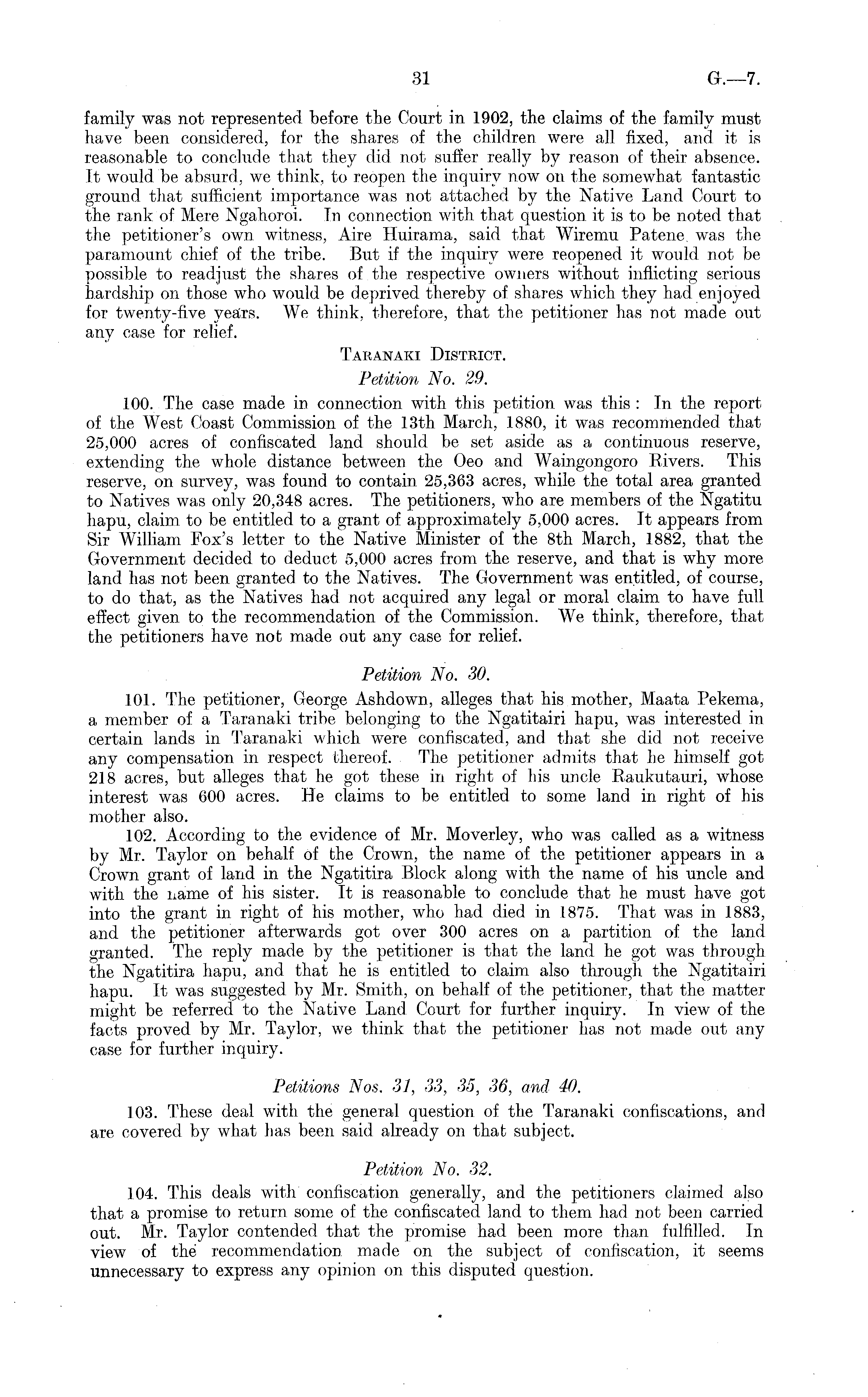 family was not represented before the Court in 1902, the claims of the family must have been considered, for the shares of the children were all fixed, and it is reasonable to conclude that they did not suffer really by reason of their absence. It would be absurd, we think, to reopen the inquiry now on the somewhat fantastic ground that sufficient importance was not attached by the Native Land Court to the rank of Mere Ngahoroi. Tn connection, with that question it is to be noted that the petitioner's own witness, Aire Huirama, said that Wiremu Patene, was the paramount chief of the tribe. But if the inquiry were reopened it would not be possible to readjust the shares of the respective owners without inflicting serious hardship on those who would be deprived thereby of shares which they had enjoyed for twenty-five years. We think, therefore, that the petitioner has not made out any case for relief. Taranaki District. Petition No. 29. 100. The case made in connection with this petition was this : In the report of the West Coast Commission of the 13th March, 1880, it was recommended that 25,000 acres of confiscated land should be set aside as a continuous reserve, extending the whole distance between the Oeo and Waingongoro Rivers. This reserve, on survey, was found to contain 25,363 acres, while the total area granted to Natives was only 20,348 acres. The petitioners, who are members of the Ngatitu hapu, claim to be entitled to a grant of approximately 5,000 acres. It appears from Sir William Fox's letter to the Native Minister of the Bth March, 1882, that the Government decided to deduct 5,000 acres from the reserve, and that is why more land has not been granted to the Natives. The Government was entitled, of course, to do that, as the Natives had not acquired any legal or moral claim to have full effect given to the recommendation of the Commission. We think, therefore, that the petitioners have not made out any case for relief. Petition No. 30. 101. The petitioner, George Ashdown, alleges that his mother, Maata Pekema, a member of a Taranaki tribe belonging to the Ngatitairi hapu, was interested in certain lands in Taranaki which were confiscated, and that she did not receive any compensation in respect thereof. The petitioner admits that he himself got 218 acres, but alleges that he got these in right of his uncle Raukutauri, whose interest was 600 acres. He claims to be entitled to some land in right of his mother also. 102. According to the evidence of Mr. Moverley, who was called as a witness by Mr. Taylor on behalf of the Crown, the name of the petitioner appears in a Crown grant of land in the Ngatitira Block along with the name of his uncle and with the name of his sister. It is reasonable to conclude that he must have got into the grant in right of his mother, who had died in 1875. That was in 1883, and the petitioner afterwards got over 300 acres on a partition of the land granted. The reply made by the petitioner is that the land he got was through the Ngatitira hapu, and that he is entitled to claim, also through the Ngatitairi hapu. It was suggested by Mr. Smith, on behalf of the petitioner, that the matter might be referred to the Native Land Court for further inquiry. In view of the facts proved by Mr. Taylor, we think that the petitioner has not made out any case for further inquiry. Petitions Nos. 31, 33, 35, 36, and 40. 103. These deal with the general question of the Taranaki confiscations, and are covered by what has been said already on that subject. Petition No. 32. 104. This deals with confiscation generally, and the petitioners claimed also that a promise to return some of the confiscated land to them had not been carried out. Mr. Taylor contended that the promise had been more than fulfilled. In view of the recommendation made on the subject of confiscation, it seems unnecessary to express any opinion on this disputed question.