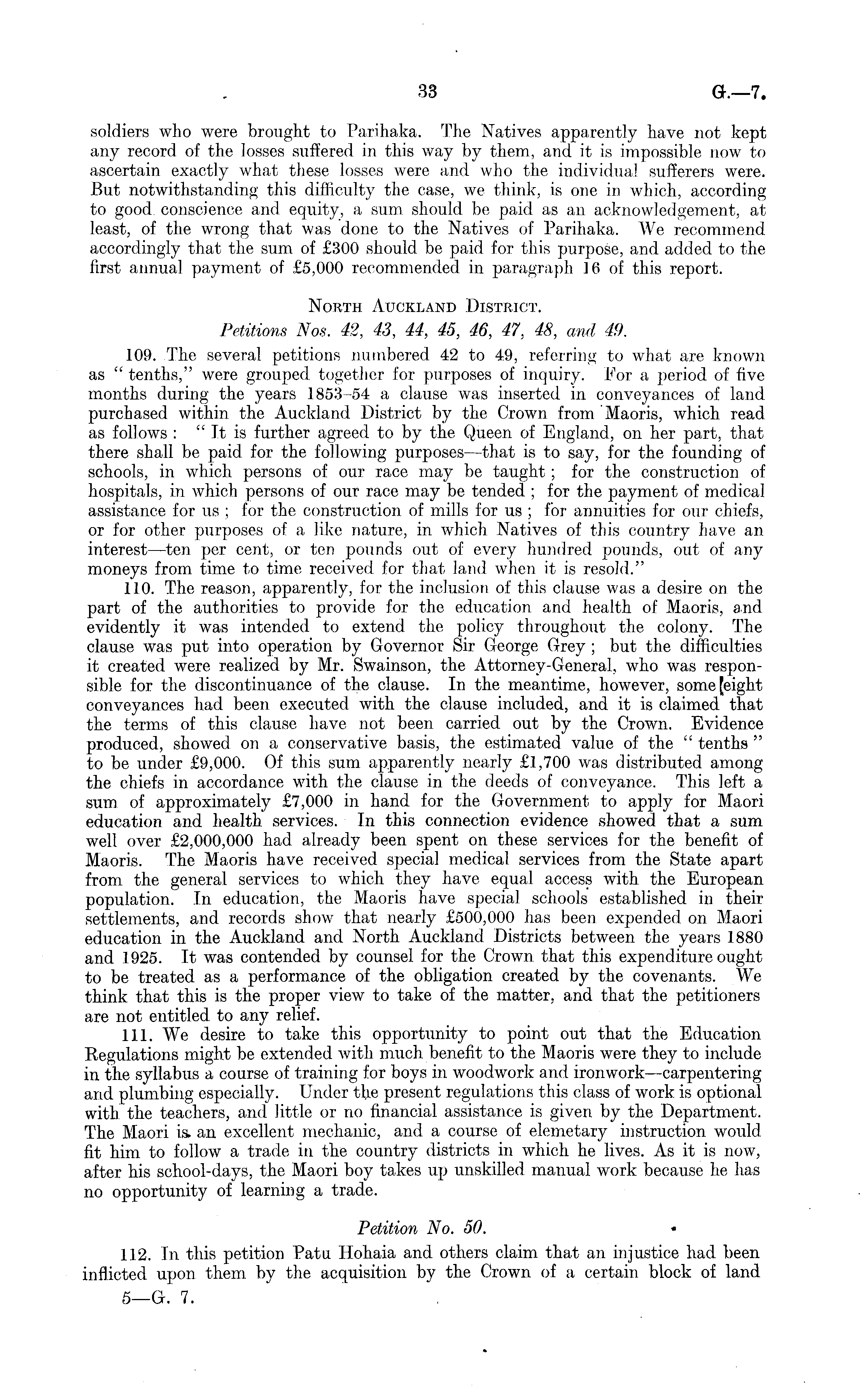 soldiers who were brought to Parihaka. The Natives apparently have not kept any record of the losses suffered in this way by them, and it is impossible now to ascertain exactly what these losses were and who the individual sufferers were. But notwithstanding this difficulty the case, we think, is one in which, according to good conscience and equity, a sum. should be paid as an acknowledgement, at least, of the wrong that was done to the Natives of Parihaka. We recommend accordingly that the sum of £300 should be paid for this purpose, and added to the first annual payment of £5,000 recommended in paragraph 16 of this report. North Auckland District. Petitions Nos. 42, 43, 44, 45, 46, 47, 48, and 49. 109. The several petitions numbered 42 to 49, referring to what are known as " tenths," were grouped together for purposes of inquiry. For a period of five months during the years 1853-54 a clause was inserted in conveyances of land purchased within the Auckland District by the Crown from Maoris, which read as follows : " It is further agreed to by the Queen of England, on her part, that there shall be paid for the following purposes —that is to say, for the founding of schools, in which persons of our race may be taught ; for the construction of hospitals, in which persons of our race may be tended ; for the payment of medical assistance for us ; for the construction of mills for us ; for annuities for our chiefs, or for other purposes of a like nature, in which Natives of this country have an interest —ten per cent, or ten pounds out of every hundred pounds, out of any moneys from time to time received for that land when it is resold." 110. The reason, apparently, for the inclusion of this clause was a desire on the part of the authorities to provide for the education and health of Maoris, and evidently it was intended to extend the policy throughout the colony. The clause was put into operation by Governor Sir George Grey ; but the difficulties it created were realized by Mr. Swainson, the Attorney-General, who was responsible for the discontinuance of the clause. In the meantime, however, some (eight conveyances had been executed with the clause included, and it is claimed, that the terms of this clause have not been carried out by the Crown. Evidence produced, showed on a conservative basis, the estimated value of the " tenths " to be under £9,000. Of this sum apparently nearly £1,700 was distributed among the chiefs in accordance with the clause in the deeds of conveyance. This left a sum of approximately £7,000 in hand for the Government to apply for Maori education and health services. In this connection evidence showed that a sum well over £2,000,000 had already been spent on these services for the benefit of Maoris. The Maoris have received special medical services from the State apart from the general services to which they have equal access with the European population. In education, the Maoris have special schools established in their settlements, and records show that nearly £500,000 has been expended on Maori education in the Auckland and North Auckland Districts between the years 1880 and 1925. It was contended by counsel for the Crown that this expenditure ought to be treated as a performance of the obligation created by the covenants. We think that this is the proper view to take of the matter, and that the petitioners are not entitled to any relief. 111. We desire to take this opportunity to point out that the Education Regulations might be extended with much benefit to the Maoris were they to include in the syllabus a course of training for boys in woodwork and ironwork—carpentering and plumbing especially. Under the present regulations this class of work is optional with the teachers, and little or no financial assistance is given by the Department. The Maori is. an excellent mechanic, and a course of elemetary instruction would fit him to follow a trade in the country districts in which he lives. As it is now, after his school-days, the Maori boy takes up unskilled manual work because he has no opportunity of learning a trade. Petition No. 50. 112. In this petition Patu Hohaia and others claim that an injustice had been inflicted upon them by the acquisition by the Crown of a certain block of land