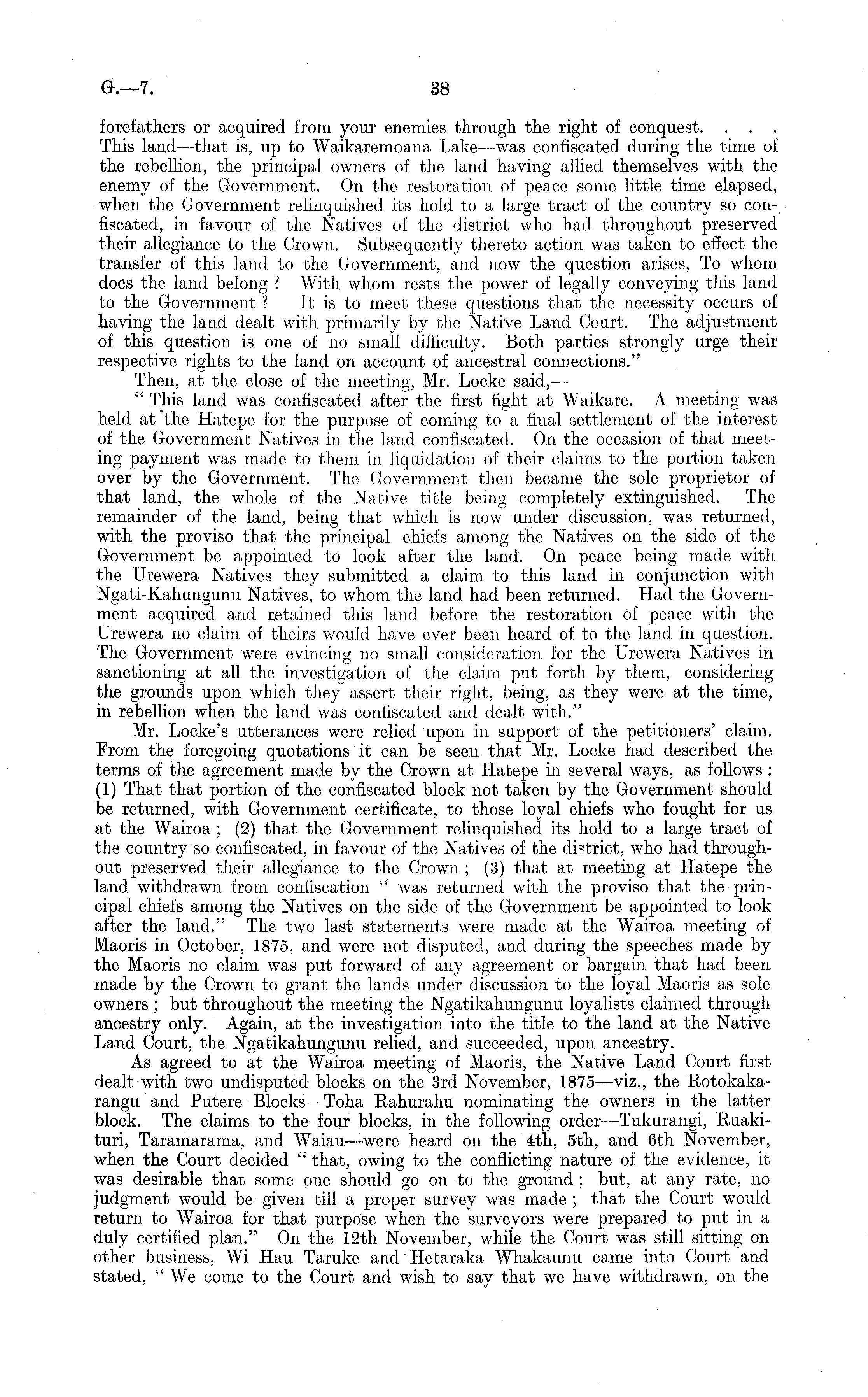 forefathers or acquired from your enemies through the right of conquest. . . . This land —that is, up to Waikaremoana Lake —was confiscated during the time of the rebellion, the principal owners of the land having allied themselves with, the enemy of the Government. On the restoration of peace some little time elapsed, when the Government relinquished its hold to a large tract of the country so confiscated, in favour of the Natives of the district who had throughout preserved their allegiance to the Crown. Subsequently thereto action was taken to effect the transfer of this land to the Government, and now the question arises, To whom does the land belong ? With whom, rests the power of legally conveying this land to the Government ? It is to meet these questions that the necessity occurs of having the land dealt with primarily by the Native Land Court. The adjustment of this question is one of no small difficulty. Both, parties strongly urge their respective rights to the land on account of ancestral connections." Then, at the close of the meeting, Mr. Locke said, — " This land was confiscated after the first fight at Waikare. A meeting was held at the Hatepe for the purpose of coming to a final settlement of the interest of the Government Natives in the land confiscated. On the occasion of that meeting payment was made to them in liquidation of their claims to the portion taken over by the Government. The Government then became the sole proprietor of that land, the whole of the Native title being completely extinguished. The remainder of the land, being that which is now under discussion, was returned, with the proviso that the principal chiefs among the Natives on the side of the Government be appointed to look after the land. On peace being made with the Urewera Natives they submitted a claim to this land in conjunction with Ngati-Kahungunu Natives, to whom the land had been returned. Had the Government acquired and retained this land before the restoration of peace with the Urewera no claim of theirs would have ever been heard of to the land in question. The Government were evincing no small, consideration for the Urewera Natives in sanctioning at all the investigation of the claim put forth by them, considering the grounds upon which they assert their right, being, as they were at the time, in rebellion when the land was confiscated and dealt with." Mr. Locke's utterances were relied upon in support of the petitioners' claim. From the foregoing quotations it can. be seen, that Mr. Locke had described the terms of the agreement made by the Crown at Hatepe in several ways, as follows : (1) That that portion of the confiscated block not taken by the Government should be returned, with Government certificate, to those loyal chiefs who fought for us at the Wairoa ; (2) that the Government relinquished its hold to a. large tract of the country so confiscated, in favour of the Natives of the district, who had throughout preserved their allegiance to the Crown ; (3) that at meeting at Hatepe the land withdrawn from confiscation " was returned with the proviso that the principal chiefs among the Natives on the side of the Government be appointed to look after the land." The two last statements were made at the Wairoa meeting of Maoris in October, 1875, and were not disputed, and during the speeches made by the Maoris no claim was put forward of any agreement or bargain, that had been made by the Crown to grant the lands under discussion to the loyal Maoris as sole owners ; but throughout the meeting the Ngatikahungunu loyalists claimed through ancestry only. Again, at the investigation into the title to the land at the Native Land Court, the Ngatikahungunu relied, and succeeded, upon ancestry. As agreed to at the Wairoa meeting of Maoris, the Native Land Court first dealt with two undisputed blocks on the 3rd November, 1875 —viz., the Rotokakarangu and Putere Blocks—Toha Rahurahu nominating the owners in the latter block. The claims to the four blocks, in the following order —Tukurangi, Ruakituri, Taramarama, and Waiau —were heard on the 4th, sth, and 6th November, when the Court decided " that, owing to the conflicting nature of the evidence, it was desirable that some one should go on to the ground.; but, at any rate, no judgment would be given till a proper survey was made ; that the Court would return to Wairoa for that purpose when the surveyors were prepared to put in a duly certified plan." On the I2th November, while the Court was still sitting on other business, Wi Hau Taruke and Hetaraka Whakaunu came into Court and stated, " We come to the Court and wish to say that we have withdrawn, on the