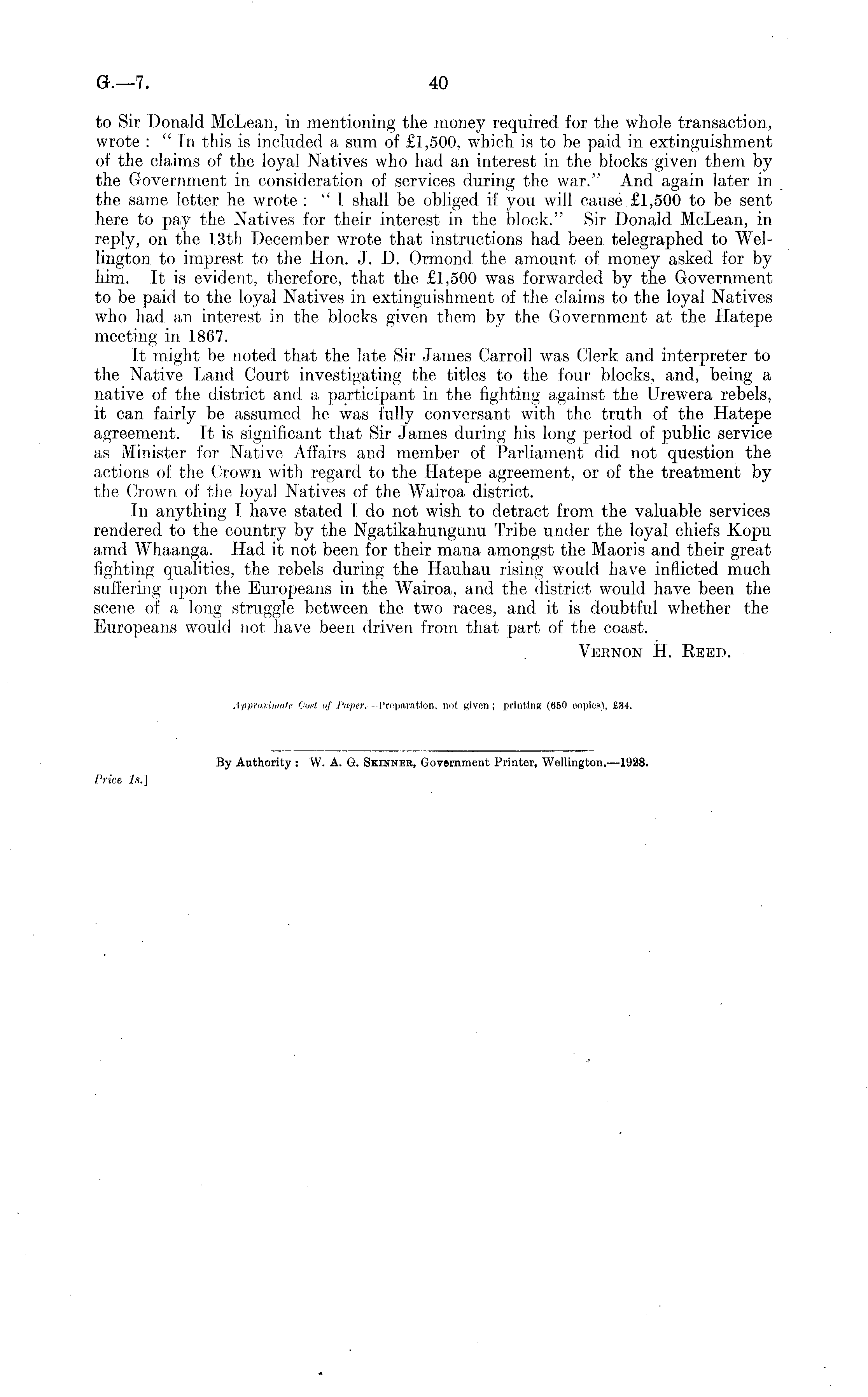 to Sir Donald McLean, in mentioning the money required for the whole transaction, wrote : " In this is included a sum of £1,500, which is to be paid in extinguishment of the claims of the loyal Natives who had an interest in the blocks given them by the Government in consideration of services during the war." And again later in the same letter he wrote : : ' I shall be obliged if you will cause £1,500 to be sent here to pay the Natives for their interest in the block." Sir Donald McLean, in reply, on the 13th December wrote that instructions had been telegraphed to Wellington to imprest to the Hon. J. I). Ormond the amount of money asked for by him. It is evident, therefore, that the £1,500 was forwarded by the Government to be paid to the loyal Natives in extinguishment of the claims to the loyal Natives who had an interest in the blocks given them by the Government at the Hatepe meeting in 1867. It might be noted that the late Sir James Carroll was Clerk and interpreter to the Native Land Court investigating the titles to the four blocks, and, being a native of the district and a participant in the fighting against the Urewera rebels, it can fairly be assumed he was fully conversant with the truth of the Hatepe agreement. It is significant that Sir James during his long period of public service as Minister for Native Affairs and member of Parliament did not question the actions of the Crown with regard to the Hatepe agreement, or of the treatment by the Crown of the loyal Natives of the Wairoa district. In anything I have stated I do not wish to detract from the valuable services rendered to the country by the Ngatikahungunu Tribe under the loyal chiefs Kopu amd Whaanga. Had it not been for their mana amongst the Maoris and their great fighting qualities, the rebels during the Hauhau rising would, have inflicted, much suffering upon the Europeans in the Wairoa, and the district would have been the scene of a long struggle between the two races, and it is doubtful whether the Europeans would not have been driven from that part of the coast. Vernon H. Reed.