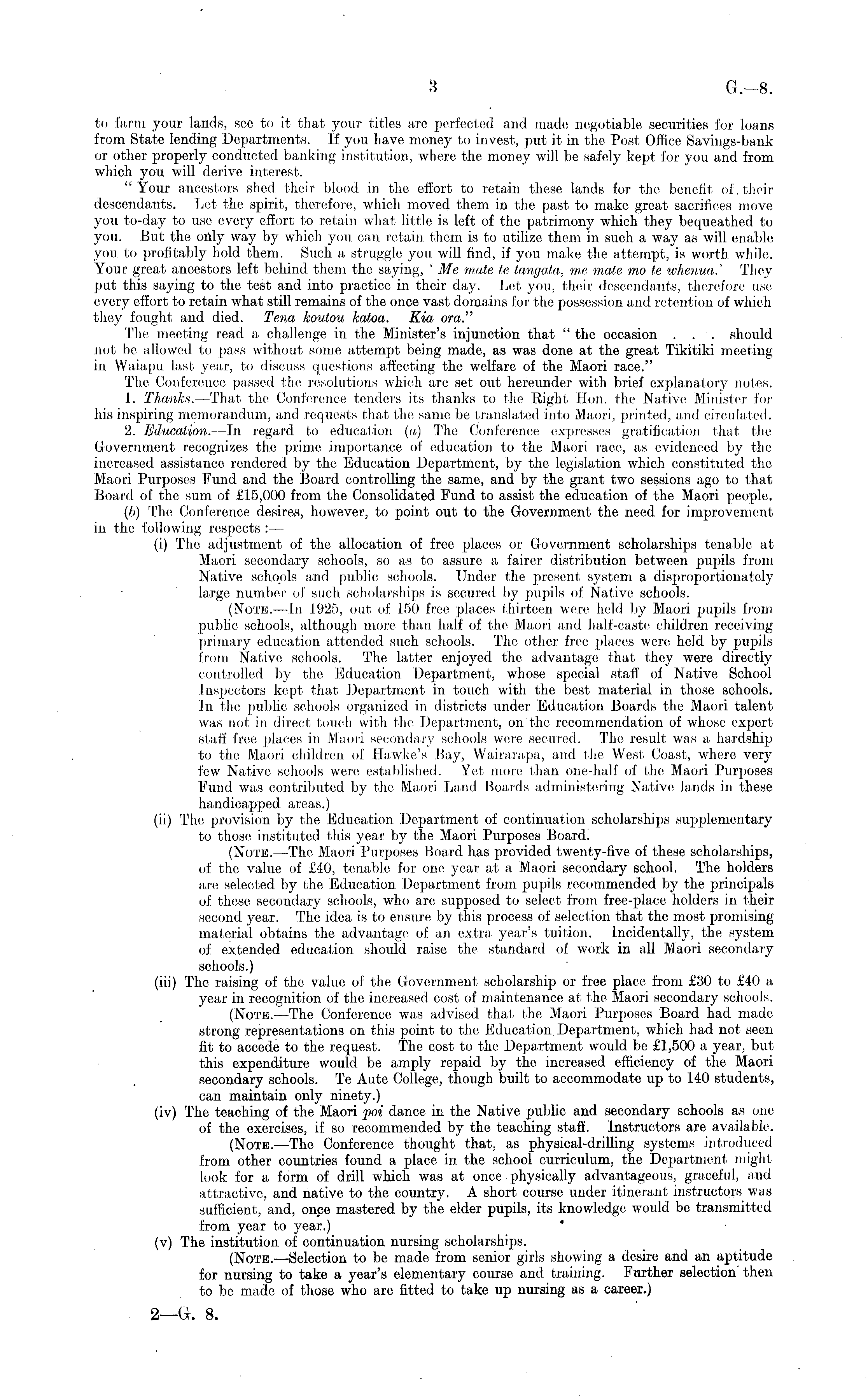 to farm your lands, see to it that your titles are perfected and made negotiable securities for loans from State lending Departments. If you have money to invest, put it in the Post Office Savings-bank or other properly conducted banking institution, where the money will be safely kept for you and from which you will derive interest. "Your ancestors shed their blood in the effort to retain these lands for the benefit of, their descendants. Let the spirit, therefore, which moved them in the past to make great sacrifices move you to-day to use every effort to retain what little is left of the patrimony which they bequeathed to you. But the only way by which you can retain them is to utilize them in such a way as will enable you to profitably hold them. Such a struggle you will find, if you make the attempt, is worth while. Your great ancestors left behind them the saying, 'Me mate te tangata, me male mo te whenua.' They put this saying to the test and into practice in their day. Let you, their descendants, therefore use every effort to retain what still remains of the once vast domains for the possession and retention of which they fought and died. Tena koutou katoa. Kia ora." The meeting read a challenge in the Minister's injunction that " the occasion . . . should not be allowed to pass without some attempt being made, as was done at the great Tikitiki meeting in Waiapu last year, to discuss questions affecting the welfare of the Maori race." The Conference passed the resolutions which are set out hereunder with brief explanatory notes. 1. Thanks. —That the Conference tenders its thanks to the Right Hon. the Native Minister for his inspiring memorandum, and requests that the same be translated into Maori, printed, and circulated. 2. Education. —In regard to education (a) The Conference expresses gratification that the Government recognizes the prime importance of education to the Maori race, as evidenced by the increased assistance rendered by the Education Department, by the legislation which constituted the Maori Purposes Fund and the Board controlling the same, and by the grant two sessions ago to that Board of the sum of £f5,000 from the Consolidated Fund to assist the education of the Maori people. (/)) The Conference desires, however, to point out to the Government the need for improvement in the following respects : — (i) The adjustment of the allocation of free places or Government scholarships tenable at Maori secondary schools, so as to assure a fairer distribution between pupils from Native schools and public schools. Under the present system a disproportionately large number of such scholarships is secured by pupils of Native schools. (Note. —In f925, out of 150 free places thirteen were held by Maori pupils from public schools, although more than half of the Maori and half-caste children receiving primary education attended such schools. The other free places were held by pupils from Native schools. The latter enjoyed the advantage that they were directly controlled by the Education Department, whose special staff of Native School Inspectors kept that Department in touch with the best material in those schools. In the public schools organized in districts under Education Boards the Maori talent was not in direct touch with the Department, on the recommendation of whose expert staff free places in Maori secondary schools were secured. The result was a hardship to the Maori children of Hawke's Bay, Wairarapa, and the West Coast, where very few Native schools were established. Yet more than one-half of the Maori Purposes Fund was contributed by the Maori Land Boards administering Native lands in these handicapped areas.) (ii) The provision by the Education Department of continuation scholarships supplementary to those instituted this year by the Maori Purposes Board. (Note. —The Maori Purposes Board has provided twenty-five of these scholarships, of the value of £40, tenable for one year at a Maori secondary school. The holders are selected by the Education Department from pupils recommended by the principals of these secondary schools, who are supposed to select from free-place holders in their second year. The idea is to ensure by this process of selection that the most promising material obtains the advantage; of an extra year's tuition. Incidentally, the system of extended education should raise the standard of work in all Maori secondary schools.) (iii) The raising of the value of the Government scholarship or free place from £30 to £40 a year in recognition of the increased cost of maintenance at the Maori secondary schools. (Note. —The Conference was advised that the Maori Purposes Board had made strong representations on this point to the Education. Department, which had not seen fit to accede to the request. The cost to the Department would be £1,500 a year, but this expenditure would be amply repaid by the increased efficiency of the Maori secondary schools. Te Aute College, though built to accommodate up to 140 students, can maintain only ninety.) (iv) The teaching of the Maori poi dance in the Native public and secondary schools as one of the exercises, if so recommended by the teaching staff. Instructors are available. (Note. —The Conference thought that, as physical-drilling systems introduced from other countries found a place in the school curriculum, the Department might look for a form of drill which was at once physically advantageous, graceful, and attractive, and native to the country. A short course under itinerant instructors was sufficient, and, once mastered by the elder pupils, its knowledge would be transmitted from year to year.) (v) The institution of continuation nursing scholarships. (Note.—Selection to be made from senior girls showing a desire and an aptitude for nursing to take a year's elementary course and training. Further selection then to be made of those who are fitted to take up nursing as a career.)