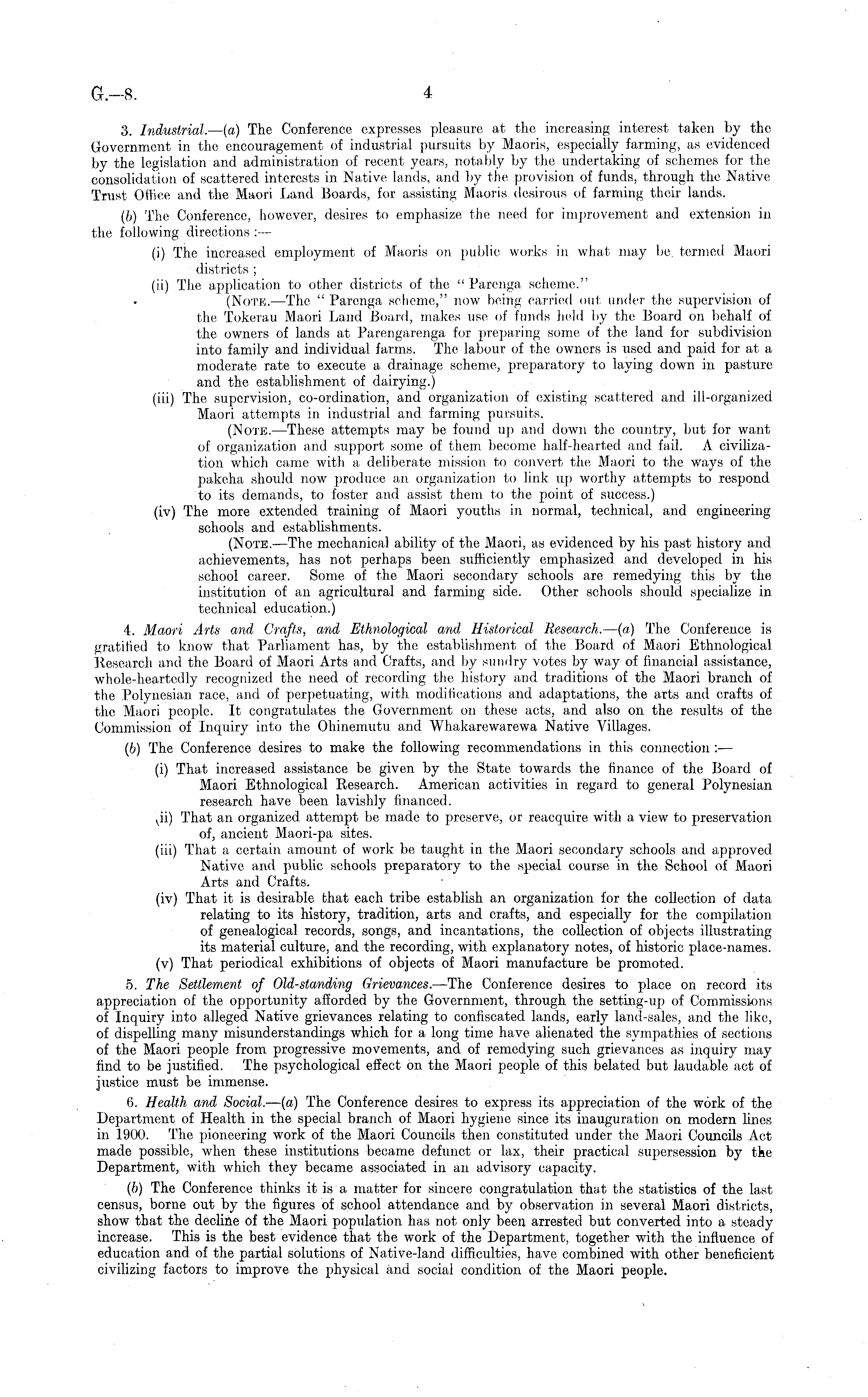 3. Industrial. — (a) The Conference expresses pleasure at the increasing interest taken by the Government in the encouragement of industrial pursuits by Maoris, especially farming, as evidenced by the legislation and administration of recent years, notably by the undertaking of schemes for the consolidation of scattered interests in Native lands, and by the provision of funds, through the Native Trust Office and the Maori Land Boards, for assisting Maoris desirous of farming their lands. (6) The Conference, however, desires to emphasize the need for improvement and extension in the following directions : — (i) The increased employment of Maoris on public works in what may be. termed Maori districts ; (ii) The application to other districts of the " Parenga scheme." (Note. —The " Parenga scheme," now being carried out under the supervision of the Tokerau Maori Land Board, makes use of funds held by the Board on behalf of the owners of lands at Parengarenga for preparing some of the land for subdivision into family and individual farms. The labour of the owners is used and paid for at a moderate rate to execute a drainage scheme, preparatory to laying down in pasture and the establishment of dairying.) (iii) The supervision, co-ordination, and organization of existing scattered and ill-organized Maori attempts in industrial and farming pursuits. (Note. —These attempts may be found up and down the country, but for want of organization and support some of them become half-hearted and fail. A civilization which came with a deliberate mission to convert the Maori to the ways of the pakeha should now produce an organization to link up worthy attempts to respond to its demands, to foster and assist them to the point of success.) (iv) The more extended training of Maori youths in normal, technical, and engineering schools and establishments. (Note. —The mechanical ability of the Maori, as evidenced by his past history and achievements, has not perhaps been sufficiently emphasized and. developed in his school career. Some of the Maori secondary schools are remedying this by the institution of an agricultural and farming side. Other schools should specialize in technical education.) 4. Maori Arts and Crafts, and Ethnological and Historical Research. — (a) The Conference is gratified to know that Parliament has, by the establishment of the Board of Maori Ethnological Research and the Board of Maori Arts and Crafts, and by sundry votes by way of financial assistance, whole-heartedly recognized the need of recording the history and traditions of the Maori branch of the Polynesian race, and of perpetuating, with modifications and adaptations, the arts and crafts of the Maori people. It congratulates the Government on these acts, and also on the results of the Commission of Inquiry into the Ohinemutu and Whakarewarewa Native Villages. (b) The Conference desires to make the following recommendations in this connection :— (i) That increased assistance be given by the State towards the finance of the Board of Maori Ethnological Research. American activities in regard to general Polynesian research have been lavishly financed. v ii) That an organized attempt be made to preserve, or reacquire with a view to preservation of, ancient Maori-pa sites. (iii) That a certain amount of work be taught in the Maori secondary schools and approved Native and public schools preparatory to the special course in the School of Maori Arts and Crafts. (iv) That it is desirable that each tribe establish an organization for the collection of data relating to its history, tradition, arts and crafts, and especially for the compilation of genealogical records, songs, and incantations, the collection of objects illustrating its material culture, and the recording, with explanatory notes, of historic place-names. (v) That periodical exhibitions of objects of Maori manufacture be promoted. 5. The Settlement of Old-standing Grievances. —The Conference desires to place on record its appreciation of the opportunity afforded by the Government, through the setting-up of Commissions of Inquiry into alleged Native grievances relating to confiscated lands, early land-sales, and the like, of dispelling many misunderstandings which for a long time have alienated the sympathies of sections of the Maori people from progressive movements, and of remedying such grievances as inquiry may find to be justified. The psychological effect on the Maori people of this belated but laudable act of justice must be immense. 6. Health and Social. — (a) The Conference desires to express its appreciation of the work of the Department of Health in the special branch of Maori hygiene since its inauguration on modern lines in 1900. The pioneering work of the Maori Councils then constituted under the Maori Councils Act made possible, when these institutions became defunct or lax, their practical supersession by the Department, with which they became associated in an advisory capacity. (b) The Conference thinks it is a matter for sincere congratulation that the statistics of the last census, borne out by the figures of school attendance and by observation in several Maori districts, show that the decline of the Maori population has not only been arrested but converted into a steady increase. This is the best evidence that the work of the Department, together with the influence of education and of the partial solutions of Native-land difficulties, have combined, with other beneficient civilizing factors to improve the physical and social condition of the Maori people.