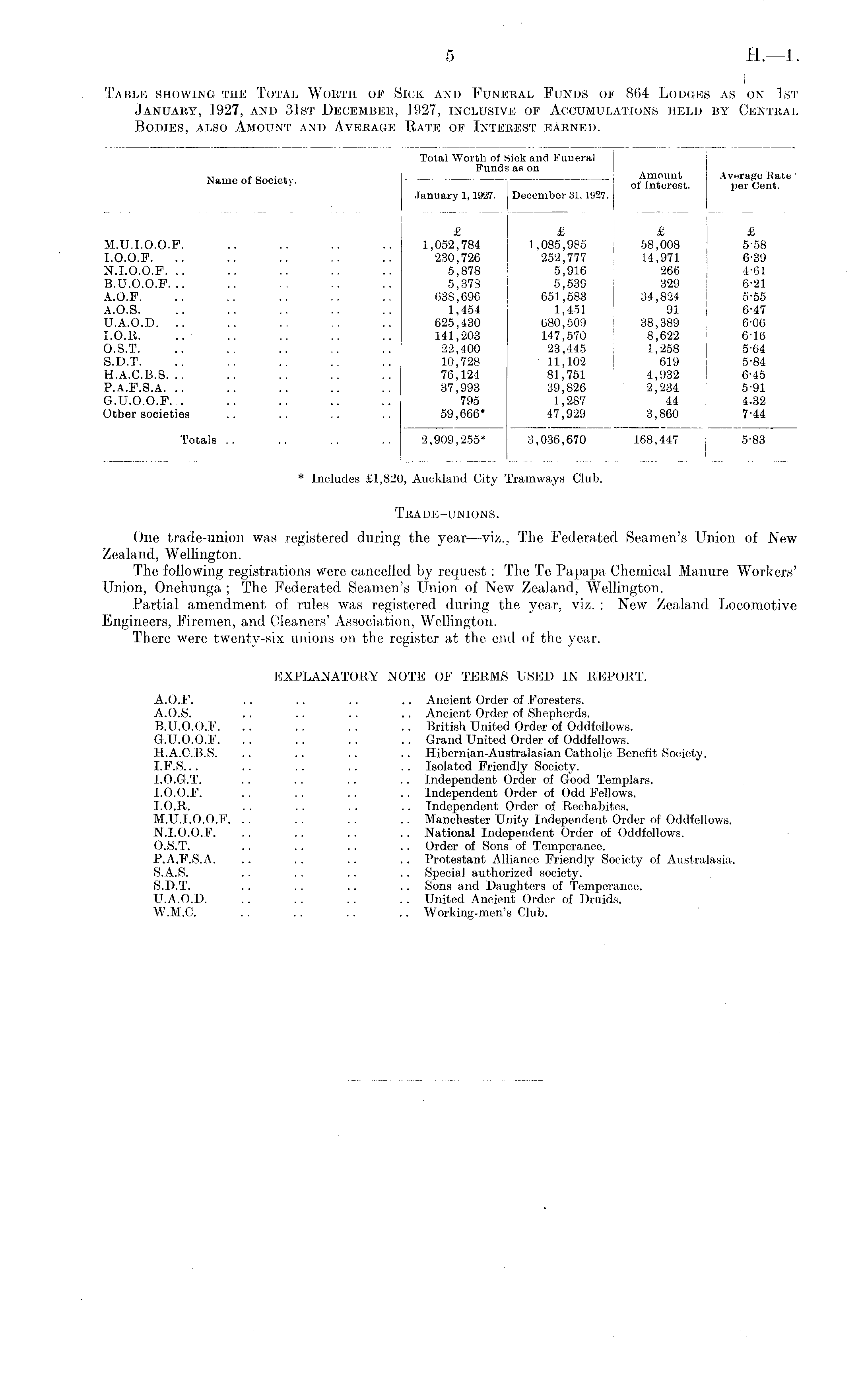 Trade-unions. One trade-union was registered during the year —viz., The Federated Seamen's Union of New Zealand, Wellington. The following registrations were cancelled by request: The Te Papapa Chemical Manure Workers' Union, Onehunga ; The Federated Seamen's Union of New Zealand, Wellington. Partial amendment of rules was registered during the year, viz. : New Zealand Locomotive Engineers, Firemen, and Cleaners' Association, Wellington. There were twenty-six unions on the register at the end of the year. EXPLANATORY NOTE OF TERMS USED IN REPORT. A.O.F. .. .. .. .. Ancient Order of Foresters. A.O.S. .. .. . . .. Ancient Order of Shepherds. 8.U.0.0.F. .. .. .. .. British United Order of Oddfellows. G.U.0.0.F. .. . . .. .. Grand United Order of Oddfellows. H.A.C.B.S. .. . . .. .. Hibernian-Australasian Catholic Benefit Society. 1.F.5... .. .. .. . . Isolated Friendly Society. 1.0. G.T. .. . . . . .. Independent Order of Good Templars. 1.0.0. F. .. . . .. .. Independent Order of Odd Fellows. 1.0. K. . . . . . . .. Independent Order of Rechabites. M.U.1.0.0.F. .. . . . . .. Manchester Unity Independent Order of Oddfellows. N.1.0.0.F. . . .. . . . . National Independent Order of Oddfellows. O.S.T. . . .. . . .. Order of Sons of Temperance. P.A.F.S.A. .. .. .. .. Protestant Alliance Friendly Society of Australasia. S.A.S. .. . . .. .. Special authorized society. S.D.T. . . . . .. .. Sons and Daughters of Temperance. U.A.O.D. .. .. . . .. United Ancient Order of Druids. W.M.G. .. .. .. .. Working-men's Club.