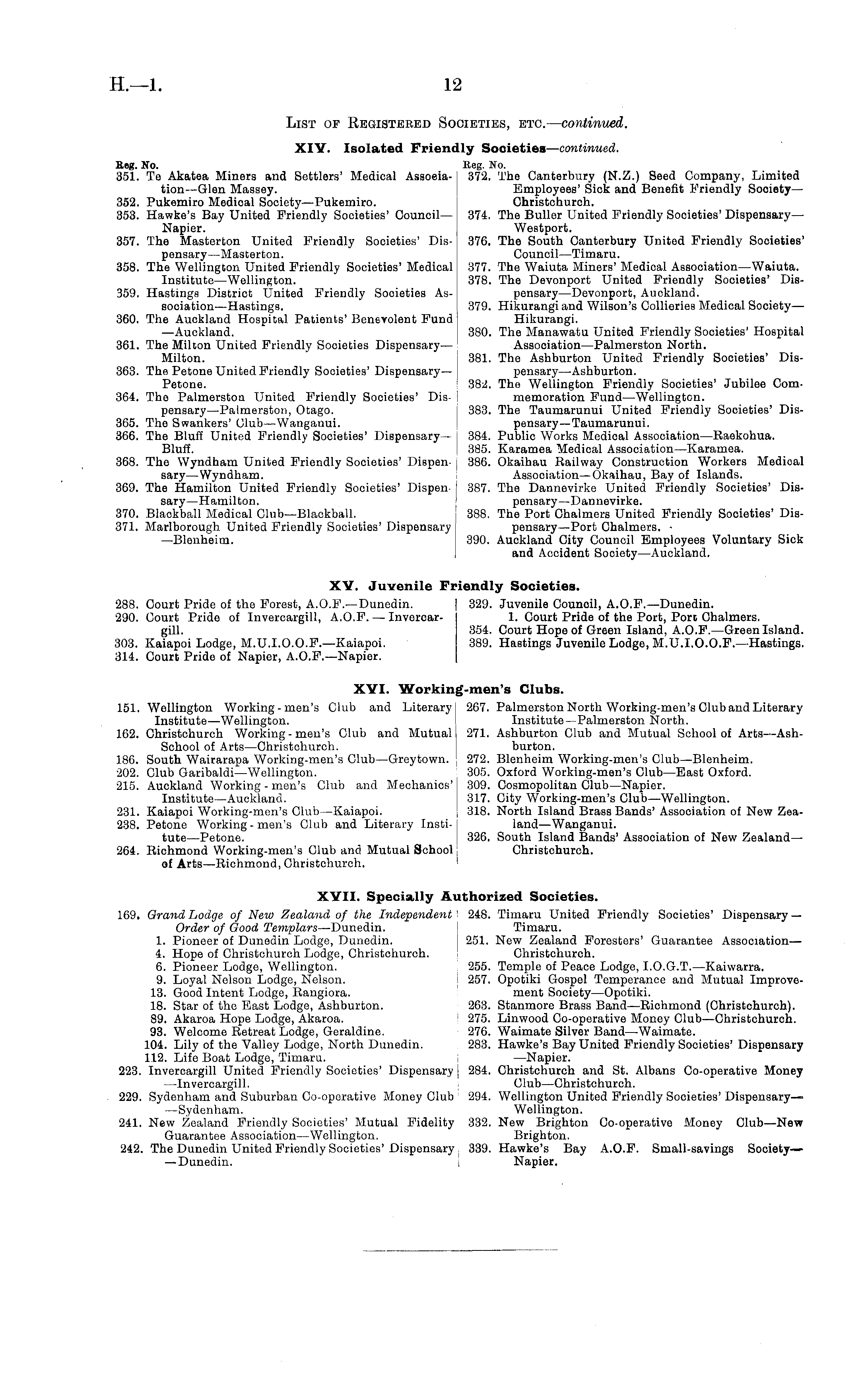 List of Registered Societies, etc. —continued. XIY. Isolated Friendly Societies —continued. Beg. No. Reg. No. 351. Te Akatea Miners and Settlers' Medical Assoeia- 372. The Canterbury (N.Z.) Seed Company, Limited tion—Glen Massey. Employees' Sick and Benefit Friendly Sooiety— 352. Pukemiro Medioal Society—Pukemiro. Christchurch. 353. Hawke's Bay United Friendly Societies' Council— 374. The Buller United Friendly Societies' DispensaryNapier. Westport. 357. The Masterton United Friendly Societies' Dis- 376. The South Canterbury United Friendly Societies' pensary—Masterton. Council—Timaru. 358. The Wellington United Friendly Societies' Medical 377. The Waiuta Miners' Medical Association—Waiuta. Institute—Wellington. 378. The Devonport United Friendly Societies' Dis--359. Hastings District United Friendly Societies As- pensary —Devonport, Auckland. sociation—Hastings. 379. Hikurangiand Wilson's Collierieß Medical Society— 360. The Auckland Hospital Patients' Benevolent Fund Hikurangi. —Auckland. 380. The Manawatu United Friendly Societies' Hospital 361. The Milton United Friendly Societies Dispensary— Association —Palmerston North. Milton. 381. The Ashburton United Friendly Societies' Dis--363. The Petone United Friendly Societies' Dispensary— pensary—Ashburton. Petone. 382. The Wellington Friendly Societies' Jubilee Com--364. The Palmerston United Friendly Societies' Dis- memoration Fund —Wellington. pensary—Palmerston, Otago. 383. The Taumarunui United Friendly Societies' Dis--365. The Swankers' Club—Wanganui. pensary—Taumarunui. 366. The Bluff United Friendly Societies' Dispensary— 384. Public Works Medioal Association —Baekohua. Bluff. 385. Karamea Medical Association—Karamea. 368. The Wyndham United Friendly Societies' Dißpen- 386. Okaihau Railway Construction Workers Medical sary—Wyndham. Association—Okaihau, Bay of Islands. 369. The Hamilton United Friendly Societies' Dispen- 387. The Dannevirke United Friendly Societies' Dissary—Hamilton. pensary—Dannevirke. 370. Blackball Medical Club—Blackball. 388. The Port Chalmers United Friendly Societies' Dis--371. Marlborough United Friendly Societies' Dispensary pensary—Port Chalmers. - —Blenheim. 390. Auckland City Council Employees Voluntary Sick and Accident Society—Auckland. XV. Juvenile Friendly Societies. 288. Court Pride of the Forest, A.O.F.—Dunedin. 329. Juvenile Counoil, A.O.F. —Dunodin. 290. Court Pride of Invercargill, A.O.F. — Invercar- 1. Court Pride of the Port, Port Chalmers. gill. 354. Court Hope of Green Island, A.O.F.—Green Island. 303. Kaiapoi Lodge, M.U.1.0.0.F. —Kaiapoi. 389. Hastings Juvenile Lodge, M.U.1.0.0.F. —Hastings. 314. Court Pride of Napier, A.O.F.—Napier. XVI. Working-men's Clubs. 151. Wellington Working-men's Club and Literary 267. Palmerston North Working-men's Club and Literary Institute —Wellington. Institute—Palmerston North. 162. Christchurch Working-men's Club and Mutual 271. Ashburton Club and Mutual School of Arts —AshSchool of Arts—Christchurch. burton. 186. South Wairarapa Working-men's Club—Greytown. 272. Blenheim Working-men's Club —Blenheim. 202. Club Garibaldi—Wellington. 305. Oxford Working-men's Club —East Oxford. 215. Auckland Working-men's Club and Mechanics' 309. Cosmopolitan Club —Napier. Institute—Auckland. 317. City Working-men's Club —Wellington. 231. Kaiapoi Working-men's Club —Kaiapoi. 318. North Island Brass Bands' Association of New Zea--238. Petone Working - men's Club and Literary Insti- land —Wanganui. tute —Petone. 326, South Island Bands' Association of New Zealand— 264. Richmond Working-men's Club and Mutual School Christchurch. of Arts—Richmond, Christchurch. 1 XVII. Specially Authorized Societies. 169. Grand Lodge of New Zealand of the Independent 248. Timaru United Friendly Societies' Dispensary — Order of Good Templars—Dunedin. Timaru. 1. Pioneer of Dunedin Lodge, Dunedin. 251. New Zealand Foresters' Guarantee Association— 4. Hope of Christchurch Lodge, Christchurch. Christchurch. 6. Pioneer Lodge, Wellington. 255. Temple of Peace Lodge, 1.0.G.T. —Kaiwarra. 9. Loyal Nelson Lodge, Nelson. 257. Opotiki Gospel Temperance and Mutual Improve--13. Good Intent Lodge, Rangiora. ment Society—Opotiki. 18. Star of the East Lodge, Ashburton. 263. Stanmore Brass Band —Richmond (Christchurch). 89. Akaroa Hope Lodge, Akaroa. 1 275. Linwood Co-operative Money Club —Christchurch. 93. Welcome Retreat Lodge, Geraldine. 276. Waimate Silver Band—Waimate. 104. Lily of the Valley Lodge, North Dunedin. 283. Hawke's Bay United Friendly Societies' Dispensary 112. Life Boat Lodge, Timaru. i —Napier. 223. Invercargill United Friendly Societies' Dispensary 1 284. Christchurch and St. Albans Co-operative Money —Invercargill. Club—Christchurch. 229. Sydenham and Suburban Co-operative Money Club 294. Wellington United Friendly Societies' Dispensary— —Sydenham. Wellington. 241. New Zealand Friendly Societies' Mutual Fidelity 332. New Brighton Co-operative Money Club—New Guarantee Association—Wellington. Brighton. 242. The Dunedin United Friendly Societies' Dispensary 339. Hawke's Bay A.O.F. Small-savings Society— — Dunedin. i Napier.