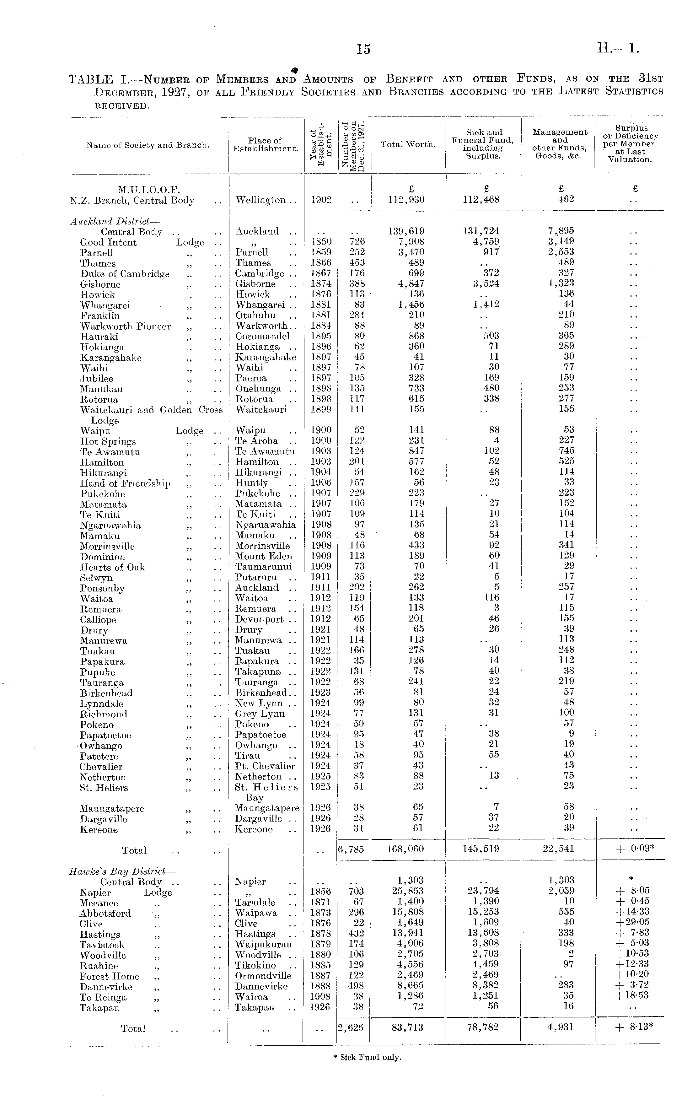 TABLE I.—Number of Members and Amounts of Benefit and other Funds, as on the 31st December, 1927, of all Friendly Societies and Branches according to the Latest Statistics received.