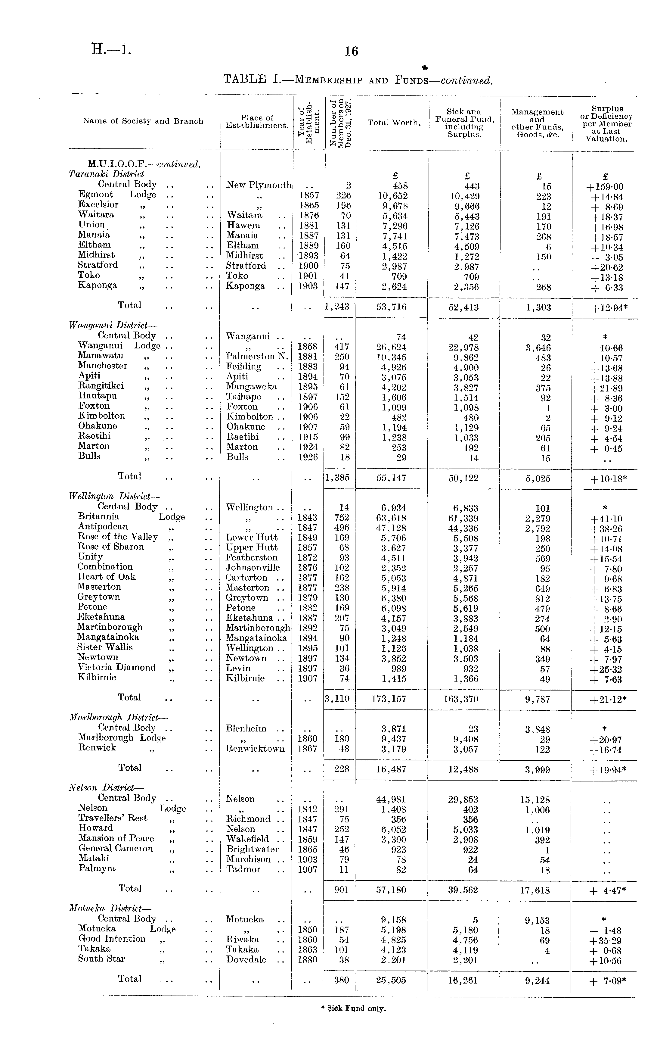 o % ! Sick and Management ® u £Pl us Name of Society and Branch. ., , *,! f. 0 ?, °* + £s3 S Total Worth ' Funeral Fund, and Membpr Establishment. «■« a worm. including other Funds, per Member !*-S a ggd Surplus. Goods, &c. „ a f Last H ® o Valuation. L_ "Se [_ M.U.I.O.O.F.—-continued. Taranaki District— £ £ £ £ Central Body .. .. New Plymouth .. 2 458 443 15 +159-00 Egmont Lodge .. .. „ 1857 226 10,652 10,429 223 +14-84 Excelsior „ .. „ 1865 196 9,678 9,666 12 + 8-69 Waitara „ .. .. Waitara .. 1876 70 5,634 5,443 191 +18-37 Union „ .. .. Hawera .. 1881 131 j 7,296 7,126 170 +16-98 Manaia „ .. .. Manaia .. 1887 131 j 7,741 7,473 268 +18-57 Eltham „ .. .. Eltham .. 1889 160 4,515 4,509 6 +10-34 Midhirst „ .. .. Midhirst .. '1893 64 1,422 1,272 150 — 3-05 Stratford „ .. .. Stratford .. 1900 75 2,987 2,987 .. +20-62 Toko „ .. .. Toko .. 190.1 1 41 709 709 .. +13-18 Kaponga „ .. .. Kaponga .. 1903 147 : 2,624 2,356 268 + 6-33 Total .. .. | 1,243 53,716 52,413 1,303 +12-94* Wanganui District— Central Bod}' .. .. Wanganui ...... 74 42 32 * Wanganui Lodge.. .. „ .. 1858 417 26,624 22,978 3,646 +10-66 Manawatu „ .. .. Palmerston N. 1881 250 10,345 9,862 483 +10-57 Manchester „ .. .. Feilding .. 1883 94 4,926 4,900 26 +13-68 Apiti „ .. .. Apiti .. 1894 70 3,075 3,053 22 +13-88 Rangitikei „ .. .. Mangaweka 1895 61 4,202 3,827 375 +21-89 Hautapu „ .. .. Taihape .. 1897 152 1,606 1,514 92 + 8-36 Foxton „ .. .. Foxton .. 1906 61 1,099 1,098 1 + 3-00 Kimbolton „ .. .. Kimbolton .. 1906 22 482 480 2 + 9-12 Ohakune „ .. .. Ohakune .. 1907 59 1,194 1,129 65 + 9-24 Raetihi „ .. .. Raetihi .. 1915 99 1,238 1,033 205 + 4-54 Marton „ .. .. Marton .. 1924 82 253 192 61 + 0-45 Bulls „ .. .. Bulls .. 1926 18 29 14 15 Total .. .. .. .. 1,385 55,147 50,122 5,025 +10-18* Wellington District— Central Body .. .. Wellington.. .. 14 6,934 6,833 101 * Britannia Lodge .. „ .. 1843 752 63,618 61,339 2,279 +41-10 Antipodean „ .. „ .. 1847 496 47,128 44,336 2,792 +38-26 Rose of the Valley „ .. Lower Hutt 1849 169 5,706 5,508 198 +10-71 Rose of Sharon „ .. Upper Hutt 1857 68 3,627 3,377 250 +14-08 Unity „ .. Featherston 1872 93 4,5.11 3,942 569 +15-54 Combination „ .. Johnsonville 1876 102 2,352 2,257 95 + 7-80 Heart of Oak .. Carterton .. 1877 162 5.053 4.871 182 + 9-68 Masterton „ .. Masterton .. 1877 238 5,914 5,265 649 f 6-83 Greytown „ .. Greytown .. 1879 130 6,380 5,568 812 +13-75 Petone „ .. Petone .. 1882 169 6,098 5,619 479 + 8-66 Eketahuna „ .. Eketahuna .. 1887 207 4,157 3,883 274 + 2-90 Martinborough „ .. Martinborough 1892 75 3,049 2,549 500 +12-15 Mangatainoka „ .. Mangatainoka 1894 90 1,248 1,184 64 + 5-63 Sister Wallis „ .. Wellington.. 1895 101 1,126 1,038 88 + 4-15 Newtown „ .. Newtown .. 1897 134 3,852 3,503 349 + 7-97 Victoria Diamond „ .. Levin .. 1897 36 989 932 57 +25-32 Kilbirnie „ .. Kilbirnie .. 1907 74 1,415 1,366 49 + 7-63 Total .. .. .. .. 3,110 173,157 163,370 9,787 +21-12* Marlborough District— Central Body .. .. Blenheim 3,871 23 3,848 * Marlborough Lodge .. „ .. I860 180 9,437 9,408 29 +20-97 Renwick „ .. Renwicktown 1867 48 3,179 3,057 122 +16-74 Total .. .. .. .. 228 16,487 12,488 3,999 +19-94* Nelson District— Central Body .. .. Nelson 44,981 29,853 15,128 Nelson Lodge .. „ .. 1842 291 1,408 402 1,006 Travellers' Rest „ .. Richmond .. 1847 75 356 356 Howard „ .. Nelson .. 1847 252 6,052 5,033 1,019 Mansion of Peace „ .. Wakefield .. 1859 147 3,300 2,908 392 General Cameron „ .. Brightwater 1865 46 923 922 1 Mataki „ .. Murchison .. 1903 79 78 24 54 Palmyra „ .. Tadmor .. 1907 11 82 64 18 Total .. .. .. .. 901 57,180 39,562 17,618 + 4-47* Motuelca District— Central Body .. .. Motueka .. .. .. 9,158 5 9,153 * Motueka Lodge .. „ .. 1850 187 5,198 5,180 18 — 1-48 Good Intention „ .. Riwaka .. 1860 54 4,825 4,756 69 +35-29 Takaka „ .. Takaka .. 1863 101 4,123 4,1.19 4 + 0-68 South Star „ .. Dovedale .. 1880 38 2,201 2,201 .. +10-56 Total .. .. j .. .. 380 25,505 16,261 9,244 + 7-09* * Sick Fund only.