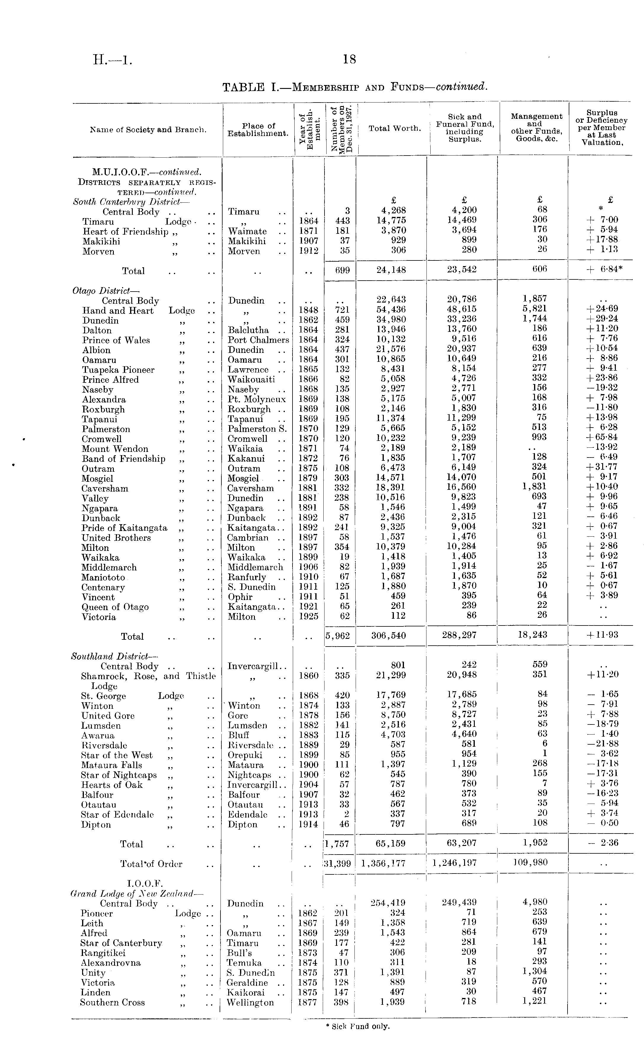 ofj °«S Sick and Management 01 . Deficiency Name of Society and Branch. Ea tabU s !n°ent. ill ||4 Total Worth - j 11 ' otowFunds, § | g Surplus. Goods, &c. valuation, H I 1 . M.U.I.O.O.F.—continued. Districts separately registered—continued. South Canterbury District — £ £ £ £ Central Body .. .. Timaru .. .. 3 4,268 4,200 68 Timaru Lodge- .. ,, .. 1864 443 14,775 14,469 306 + 7-00 Heart of Friendship ,, .. Waimate .. 1871 181 3,870 3,694 176 + 5-94 Makikihi „ .. Makikihi . . 1907 37 929 899 30 +17-88 Morven ,, .. Morven .. 1912 35 306 280 26 + 1 13 Total .. .. .. .. 699 24,148 23,542 606 + 6-84* (ttnnn Qfrift Central Body .. Dunedin 22,643 20,786 1,857 Hand and Heart Lodge .. „ .. 1848 721 54,436 48,615 5,821 +24-69 Dunedin ,, .. ,, .. 1862 459 34,980 33,236 1,744 +29*24 Dalton „ .. Balclutha .. 1864 281 13,946 13,760 186 +11-20 Prince of Wales ,, .. Port Chalmers 1864 324 10,132 9,516 616 + 7-76 Albion ,, .. Dunedin .. 1864 437 21,576 20,937 639 +10-54 Oamaru ,, .. Oamaru .. 1864 301 10,865 10,649 216 + 8-86 Tuapeka Pioneer ,, .. Lawrence .. 1865 .132 8,431 8,154 277 + 9-41 Prince Alfred ,, .. Waikouaiti 1866 82 5,058 4,726 332 +23*86 Naseby „ .. Naseby .. 1868 135 2,927 2,771 156 -19*32 Alexandra „ .. Pt. Molyneux 1869 138 5,175 5,007 168 + 7*98 Roxburgh ,, .. Roxburgh .. 1869 108 2,146 1,830 316 —11*80 Tapanui ,, .. Tapanui .. 1869 195 11,374 11,299 75 +13*98 Palmerston ,, .. Palmerston S. 1870 129 5,665 5,152 513 + 6*28 Cromwell ,, .. Cromwell .. 1870 120 10,232 9,239 993 +65*84 Mount Wendon ,, .. Waikaia .. 1871 74 2,189 2,189 .. —13*92 Band of Friendship ,, .. Kakanui .. 1872 76 1,835 1,707 128 — 6*49 Outram ,, .. Outram .. 1875 108 6,473 6,149 324 +31*77 Mosgiel „ .. Mosgiel .. 1879 303 14,571 14,070 501 + 9*17 Caversham „ .. Caversham 1881 332 .18,391 16,560 1,831 +10*40 Valley „ .. Dunedin .. 1881 238 10,516 9,823 693 + 9*96 Ngapara „ .. Ngapara .. 1891 58 1,546 1,499 47 + 9*65 Dunback ,, .. Dunback .. 1892 87 2,436 | 2,315 121 — 6*46 Pride of Kaitangata ,, .. Kaitangata.. 1892 241 9,325 9,004 321 + 0*67 United Brothers ,, .. Cambrian .. 1897 58 1,537 1,476 61 — 3*91 Milton „ .. Milton .. 1897 354 10,379 10,284 95 + 2*86 Waikaka ,, .. Waikaka .. 1899 19 1,418 1,405 13 + 6*92 Middlemarch ,, .. Middlemarch 1906 82 1,939 1,914 25 — 1*67 Maniototo ,, .. Ranfurly .. 1910 67 1,687 1,635 52 + 5*61 Centenary ,, .. S. Dunedin 1911 j 125 1,880 1,870 10 + 0*67 Vincent ,, . . Ophir .. 1911 i 51 459 395 64 + 3*89 Queen of Otago ,, .. Kaitangata.. 1921 j 65 261 239 22 Victoria ,, .. Milton .. 1925 ! 62 112 86 26 Total .. .. .. .. 5,962 306,540 288,297 18,243 +11*93 Southland District — I Central Body .. .. Invercargill.. .. I .. 801 242 559 Shamrock, Rose, and Thistle ,, .. 1860 335 21,299 20,948 351 +11*20 Lodge St. George Lodge .. „ .. 1868 420 17,769 17,685 84 — 1-65 Winton „ .. Winton .. 1874! 133 2,887 2,789 98 - 7*91 United Gore „ .. Gore .. 1878 1 156 8,750 8,727 23 + 7*88 Lumsden ,, .. Lumsden .. 1882 , 141 2,516 2,431 85 —18*79 Awarua „ .. Bluff .. 1883, 115 4,703 4,640 63 - 1*40 Riversdale ,, .. Riversdale .. 1889 j 29 587 581 6 —21*88 Star of the West ,, .. Orepuki . . 1899 | 85 955 954 1 — 3*62 Mataura Falls ,, .. Mataura .. 1900 j 111 1,397 1,129 268 —17*18 Star of Nightcaps ,, .. Nightcaps .. 1900 62 545 390 155 —17*31 Hearts of Oak „ .. Invercargill.. 1904 57 787 780 7 + 3*76 Balfour „ .. Balfour' .. 1907 1 32 462 373 89 -16*23 Otautau ,, .. Otautau .. 1913 | 33 567 532 35 — 5*94 Star of Edendale ,, .. Edendale .. 1913 < 2 337 317 20 + 3*74 Dipton ,, .. Dipton .. 1914 j 46 797 689 108 — 0*50 Total .. .. .. .. [l,757 65,159 63,207 1,952 - 2-36 | Total'of Order .. .. .. 31,399 1,356,177 1,246,197 109,980 I.O.O.F. Grand Lodge of New Zealand — Centrai Body .. .. Dunedin .. .. .. 254,419 249,439 4,980 Pioneer Lodge .. ,, .. 1862 201 324 71 253 Leith .. „ .. 1867 149 1,358 j 719 639 Alfred „ .. Oamaru .. 1869 239 1,543 864 679 Star of Canterbury ,, .. Timaru .. 1869 177 422 281 141 Rangitikei ,, .. Bull's .. 1873 47 306 209 97 Alexandrovna „ .. Temuka .. 1874 110 311 18 293 Unity „ .. S. Dunedin 1875 371 1,391 87 1,304 Victoria ,, .. Geraldine .. 1875 128 889 319 570 Linden ,, . . Kaikorai .. 1875 147 497 30 467 Southern Cross ,, .. j Wellington 1877 398 1,939 718 1,221 I I * Sick Fund only.