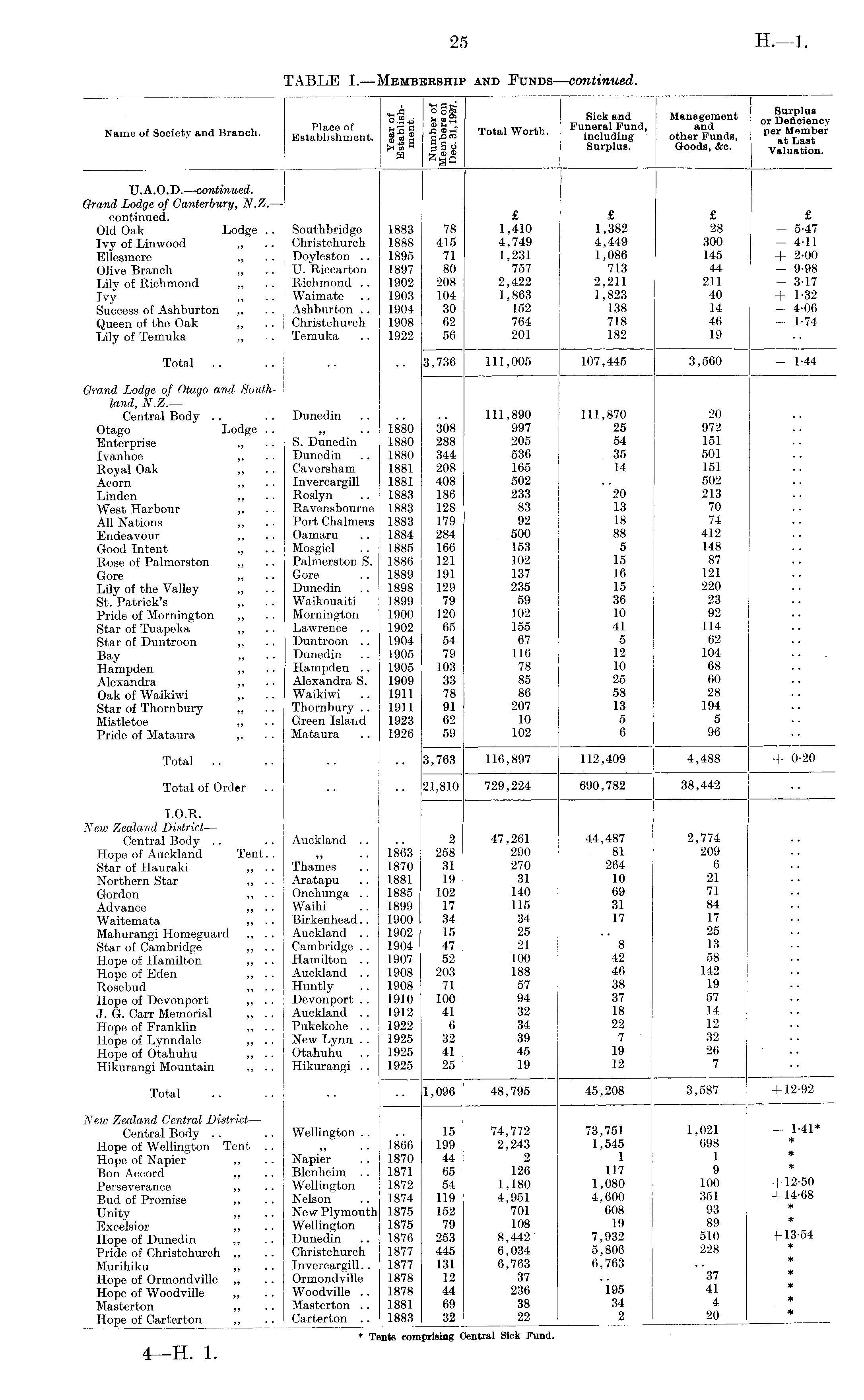 oiu I Sick and Management 0 r Deficiency Name of Society and Branch. Establishment, gig |Js Total Worth. 3 ' otheXnds, pe * t M £™? e ' tH|H ago Surplus. Goods, &c. Valuation. " z gQ U.A.O.D. —continued. Grand Lodge of Canterbury, N.Z. — continued. £ £ £ £ Old Oak Lodge .. Southbridge 1883 78 1,410 1,382 28 — 5-47 Tvy of Linwood ,, .. Christchurch 1888 415 4,749 4,449 300 — 4-11 Ellesmere ,, .. Doyleston .. 1895 71 1,231 1,086 145 + 2*00 Olive Branch ,, U. Biecarton 1897 80 757 713 44 — 9-98 Lily of Richmond „ .. Richmond.. 1902 208 2,422 2,211 211 - 3-17 Ivy „ .. Waimate .. 1903 104 1,863 1,823 40 + 1-32 Success of Ashburton „ .. Ashburton .. 1904 30 152 138 14 — 4-06 Queen of the Oak „ .. Christchurch 1908 62 764 718 46 — 1-74 Lily of Temuka „ . . Temuka .. 1922 56 201 182 19 Total .. .. .. .. 3,736 111,005 107,445 3,560 - 1-44 Grand Lodge of Otago and Southland, N.Z.' — Central Body .. .. Dunedin .. .. .. 111,890 111,870 20 Otago Lodge .. „ .. 1880 308 997 25 972 Enterprise ,, .. S. Dunedin 1880 288 205 54 151 . . Ivanhoe ,, .. Dunedin .. 1880 344 536 35 501 Royal Oak „ .. Caversham 1881 208 165 14 151 Acorn „ .. Invereargill 1881 408 502 .. 502 Linden „ .. Roslyn .. 1883 186 233 20 213 West Harbour ,, .. Ravensbourne 1883 128 83 13 70 All Nations „ .. Port Chalmers 1883 179 92 18 74 Endeavour ,, . . Oamaru .. 1884 284 500 88 412 Good Intent „ .. Mosgiel .. 1885 166 153 5 148 Rose of Palmerston ,, .. Palmerston S. 1886 121 102 15 87 Gore „ .. Gore .. 1889 191 137 16 121 Lily of the Valley ,, .. Dunedin .. 1898 129 235 15 220 St. Patrick's „ .. Waikouaiti 1899 79 59 36 23 Pride of Mornington „ .. Mornington 1900 120 102 10 92 Star of Tuapeka „ .. Lawrence .. 1902 65 155 41 114 Star of Duntroon „ .. Duntroon .. 1904 54 67 5 62 Bay ,, Dunedin .. 1905 79 116 12 104 Hampden ,, .. Hampden .. 1905 103 78 10 68 Alexandra „ .. Alexandra S. 1909 33 85 25 60 Oak of Waikiwi ,, .. Waikiwi .. 1911 78 86 58 28 Star of Thornbury „ . . Thornbury .. 1911 91 207 13 194 Mistletoe „ .. Green Island 1923 62 10 5 5 Pride of Mataura „ .. Mataura .. 1926 59 102 6 96 Total .. .. .. .. 3,763 116,897 112,409 4,488 + 0-20 Total of Order .. .. .. 21,810 729,224 690,782 38,442 I.O.R. New Zealand District — | Central Body .. .. Auckland .. .. 2 47,261 44,487 j 2,774 Hope of Auckland Tent.. ,, .. 1863 258 290 81 209 Star of Hauraki ,, .. Thames .. 1870 31 270 264 6 Northern Star ,, .. Aratapu .. 1881 19 31 10 21 Gordon ,, . • Onehunga .. 1885 102 140 69 71 Advance „ .. Waihi .. 1899 17 115 31 84 Waitemata ,, .. Birkenhead.. 1900 34 34 17 17 Mahurangi Homeguard ,, .. Auckland .. 1902 15 25 .. 25 Star of Cambridge „ .. Cambridge .. 1904 47 21 8 13 Hope of Hamilton ,, . . Hamilton .. 1907 52 100 42 58 Hope of Eden „ . . Auckland .. 1908 203 188 46 142 Rosebud ,, .. Huntly .. 1908 71 57 38 19 Hope of Devonport ,, .. Devonport .. 1910 100 94 37 57 J. G. Carr Memorial ,, .. Auckland .. 1912 41 32 18 14 Hope of Franklin „ . . Pukekohe .. 1922 6 34 22 12 Hope of Lynndale ,, .. New Lynn .. 1925 32 39 7 32 Hope of Otahuhu ,, .. Otahuhu .. 1925 41 45 19 26 Hikurangi Mountain ,, .. Hikurangi .. 1925 25 19 12 7 Total •• •• •• 1,096 48,795 45,208 3,587 +12-92 New Zealand Central District — Central Body .. .. Wellington.. .. 15 74,772 73,751 1,021 - 1-41* Hope of Wellington Tent .. ,, .. 1866 199 2,243 1,545 698 Hope of Napier ,, .. Napier .. 1870 44 2 1 1 * Bon Accord ,, .. Blenheim .. 1871 65 126 117 9 Perseverance „ .. Wellington 1872 54 1,180 1,080 100 +12-50 Bud of Promise „ .. Nelson .. 1874 119 4,951 4,600 351 +14-68 Unitv „ .. New Plymouth 1875 152 701 608 93 Excelsior „ .. Wellington 1875 79 108 19 89 * Hope of Dunedin ,, .. Dunedin .. 1876 253 8,442 7,932 510 Pride of Christchurch ,, .. Christchurch 1877 445 6,034 5,806 228 Murihiku „ .. Invereargill.. 1877 131 6,763 6,763 Hope of Ormondville ,, .. Ormondville 1878 12 37 .. 37 Hope of Woodville „ . . Woodville .. 1878 44 236 195 41 Masterton „ .. Masterton 1881 69 38 34 4 Hope of Carterton „ .. Carterton .. 1883 32 22 2 * Tents comprising Central Sick Fund.