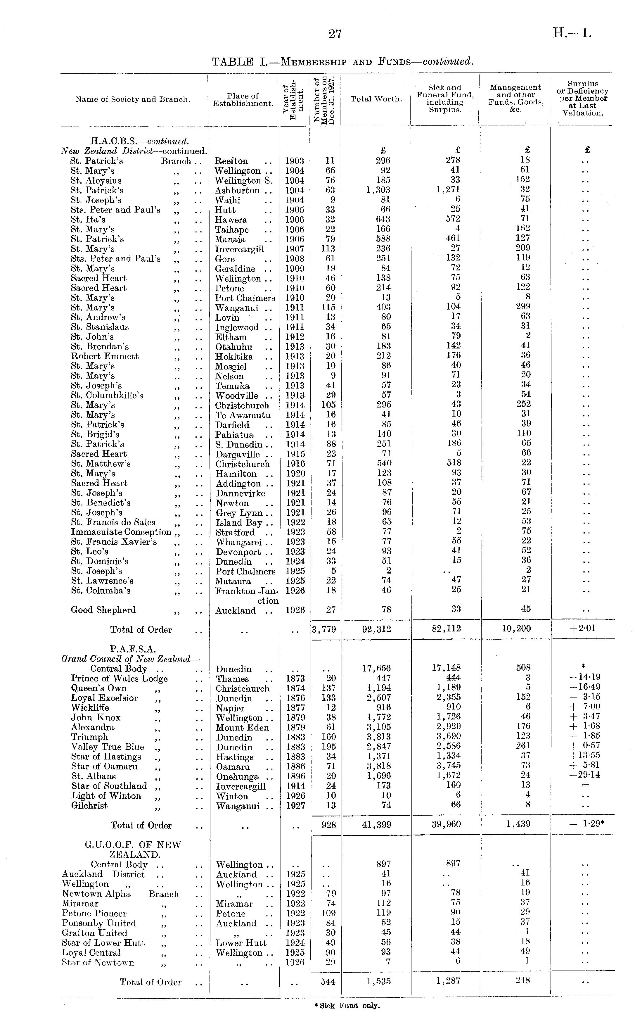£»§ Sick and Management Deficiency Name of Society and Branch. gig ||g Total Worth. pe^ e a^t ber |S|0 I|g Surplus. Ac. Valuation. i H a aa -■ . - ..v , ; H.A.C.B.S. —continued. New Zealand District—continued. £ £ £ £ St. Patrick's Branch.. Reefton .. 1903 11 296 278 18 St, Mary's ,, .. Wellington .. 1904 65 92 41 51 St. Aloysius ,, .. Wellington S. 1904 76 185 33 152 St. Patrick's ,, .. Ashburton .. 1904 63 1,303 1,271 32 St. Joseph's ,, .. Waihi .. 1904 9 81 6 75 Sts. Peter and Paul's ,, .. Hutt .. 1905 33 66 25 41 St. Ita's ,, .. Hawera .. 1906 32 643 572 71 St. Mary's ,, .. Taihape .. 1906 22 166 4 162 St. Patrick's ,, .. Manaia .. 1906 79 588 461 127 St. Mary's ,, .. Invercargill 1907 113 236 27 209 Sts. Peter and Paul's ,, .. Gore .. 1908 61 251 132 119 St. Mary's ,, .. Geraldine .. 1909 19 84 72 12 Sacred Heart ,, .. Wellington .. 1910 46 138 75 63 Sacred Heart ,, .. Petone .. 1910 60 214 92 122 St. Mary's ,, .. Port Chalmers 1910 20 13 5 8 St. Mary's ,, .. Wanganui .. 1911 115 403 104 299 St. Andrew's ,, .. Levin .. 1911 13 80 17 63 St. Stanislaus ,, .. Inglewood .. 1911 34 65 34 31 St. John's ,, .. Eltham .. 1912 16 81 79 2 St. Brendan's ,, .. Otahuhu .. 1913 30 183 142 41 Robert Emmett ,, .. Hokitika .. 1913 20 212 176 36 St. Mary's ,, .. Mosgiel .. 1913 10 86 40 46 St. Mary's „ .. Nelson .. 1913 9 91 71 20 St. Joseph's „ .. Temuka .. 1913 41 57 23 34 St. Columbkille's ,, .. Woodville .. 1913 29 57 3 54 St. Mary's „ .. Christchurch 1914 105 295 43 252 St. Mary's ,, .. Te Awamutu 1914 16 41 10 31 St. Patrick's „ .. Darfield .. 1914 16 85 46 39 St. Brigid's ,, .. Pahiatua .. 1914 13 140 30 110 St. Patrick's ,, .. S. Dunedin .. 1914 88 251 186 65 Sacred Heart ,, .. Dargaville .. 1915 23 71 5 66 St. Matthew's ,, .. Christchurch 1916 71 540 518 22 St. Mary's ,, .. Hamilton .. 1920 17 123 93 30 Sacred Heart ,, .. Addington .. 1921 37 108 37 71 St. Joseph's ,, .. Dannevirke 1921 24 87 20 67 St. Benedict's ,, . . Newton .. 1921 14 76 55 21 St. Joseph's ,, .. Grey Lynn.. 1921 26 96 71 25 St. Francis de Sales ,, .. Island Bay .. 1922 18 65 12 53 Immaculate Conception,, .. Stratford .. 1923 58 77 2 75 St. Francis Xavier's ,, .. Whangarei .. 1923 15 77 55 22 St. Leo's ,, .. Devonport .. 1923 24 93 41 52 St. Dominic's ,, .. Dunedin .. 1924 33 51 15 36 St. Joseph's ,, .. Port Chalmers 1925 5 2 .. 2 St. Lawrence's ,, .. Mataura .. 1925 22 74 47 27 St. Columba's ,, .. Frankton Jun- 1926 18 46 25 21 ction Good Shepherd ,, .. Auckland .. 1926 27 78 33 45 Total of Order .. .. .. 3,779 92,312 82,112 10,200 +2-01 P.A.F.S.A. Grand Council of New Zealand— Central Body .. .. Dunedin .. .. .. 17,656 17,148 508 * Prince of Wales Lodge .. Thames .. 1873 20 447 444 3 —14-19 Queen's Own ,, .. Christchurch 1874 137 1,194 1,189 5 -16-49 Loyal Excelsior ,, .. Dunedin .. 1876 133 2,507 2,355 152 — 3-15 Wickliffe „ .. Napier .. 1877 12 916 910 6 + 7-00 John Knox „ .. Wellington.. 1879 38 1,772 1,726 46 + 3-47 Alexandra ,, .. Mount Eden 1879 61 3,105 2,929 176 + 1-68 Triumph ,, .. Dunedin .. 1883 160 3,813 3,690 123 - 1-85 Valley True Blue „ .. Dunedin .. 1883 195 2,847 2,586 261 + 0-57 Star of Hastings ,, .. Hastings .. 1883 34 1,371 1,334 37 +13-55 Star of Oamaru ,, .. Oamaru .. 1886 71 3,818 3,745 73 + 5-81 St. Albans ,, .. Onehunga .. 1896 20 1,696 1,672 24 +29-14 Star of Southland ,, .. Invercargill 1914 24 173 160 13 Light of Winton ,, .. Winton .. 1926 10 10 6 4 Gilchrist ,, .. Wanganui .. 1927 13 74 66 8 Total of Order .. .. .. 928 41,399 39,960 1,439 - 1-29* G.U.O.O.F. OF NEW ZEALAND. Central Body .. .. Wellington .. .. .. 897 897 Auckland District .. .. Auckland . . 1925 .. 41 .. 41 Wellington „ .. .. Wellington .. 1925 .. 16 .. 16 Newtown Alpha Branch .. ,, .. 1922 79 97 78 19 Miramar „ .. Miramar .. 1922 74 112 75 37 Petone Pioneer „ .. Petone .. 1922 109 119 90 29 Ponsonby United „ .. Auckland .. 1923 84 52 15 37 Grafton United ,, .. ,, .. 1923 30 45 44 1 Star of Lower Hutt „ .. Lower Hutt 1924 49 56 38 18 Loyal Central ,, .. Wellington .. 1925 90 93 44 49 Star of Newtown „ . . . . 1926 29 7 6 1 Total of Order .. .. .. 544 1,535 1,287 248 *Sick li'und only.