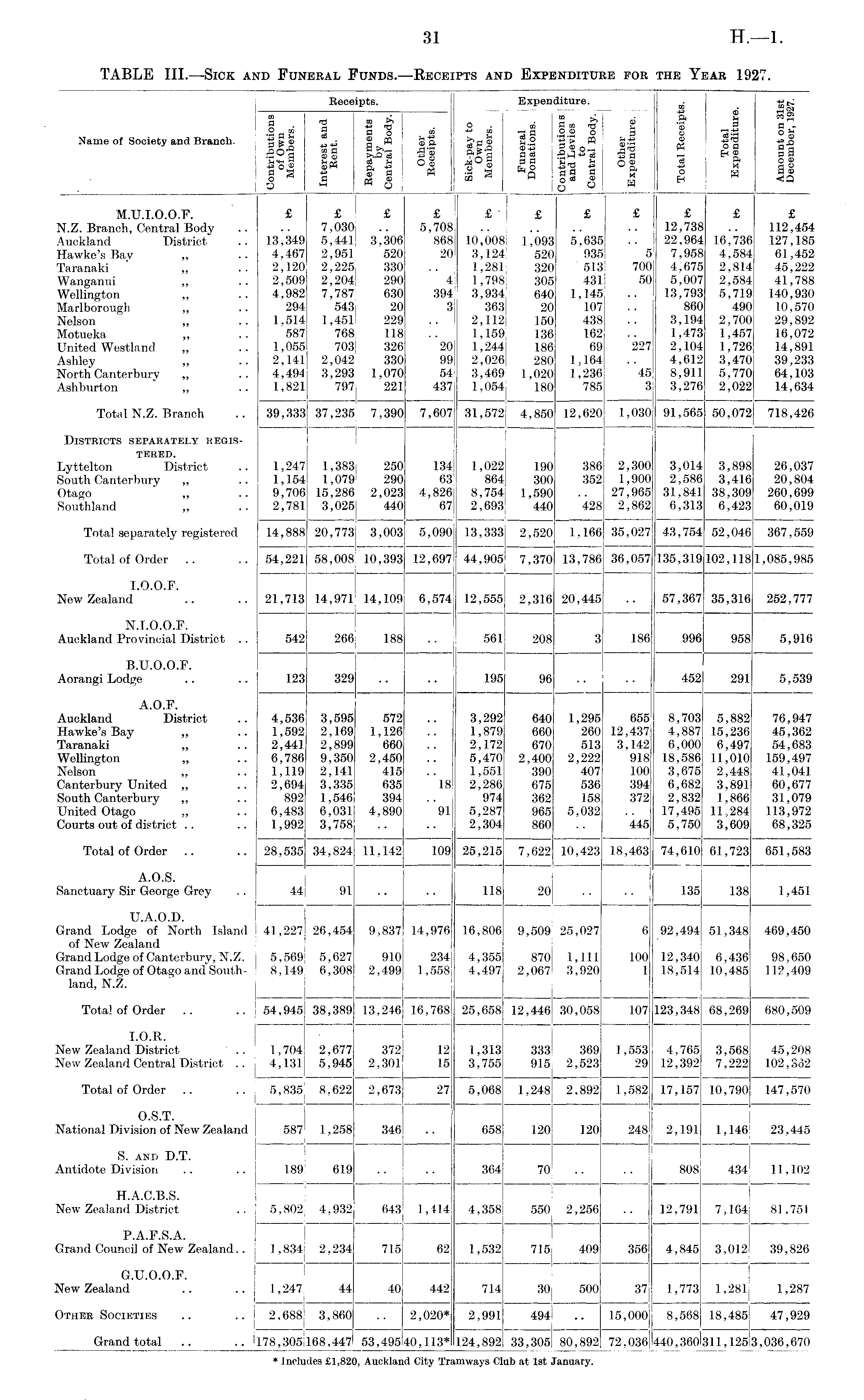 TABLE III.—Sick and Funeral Funds. —Receipts and Expenditure for the Year 1927.