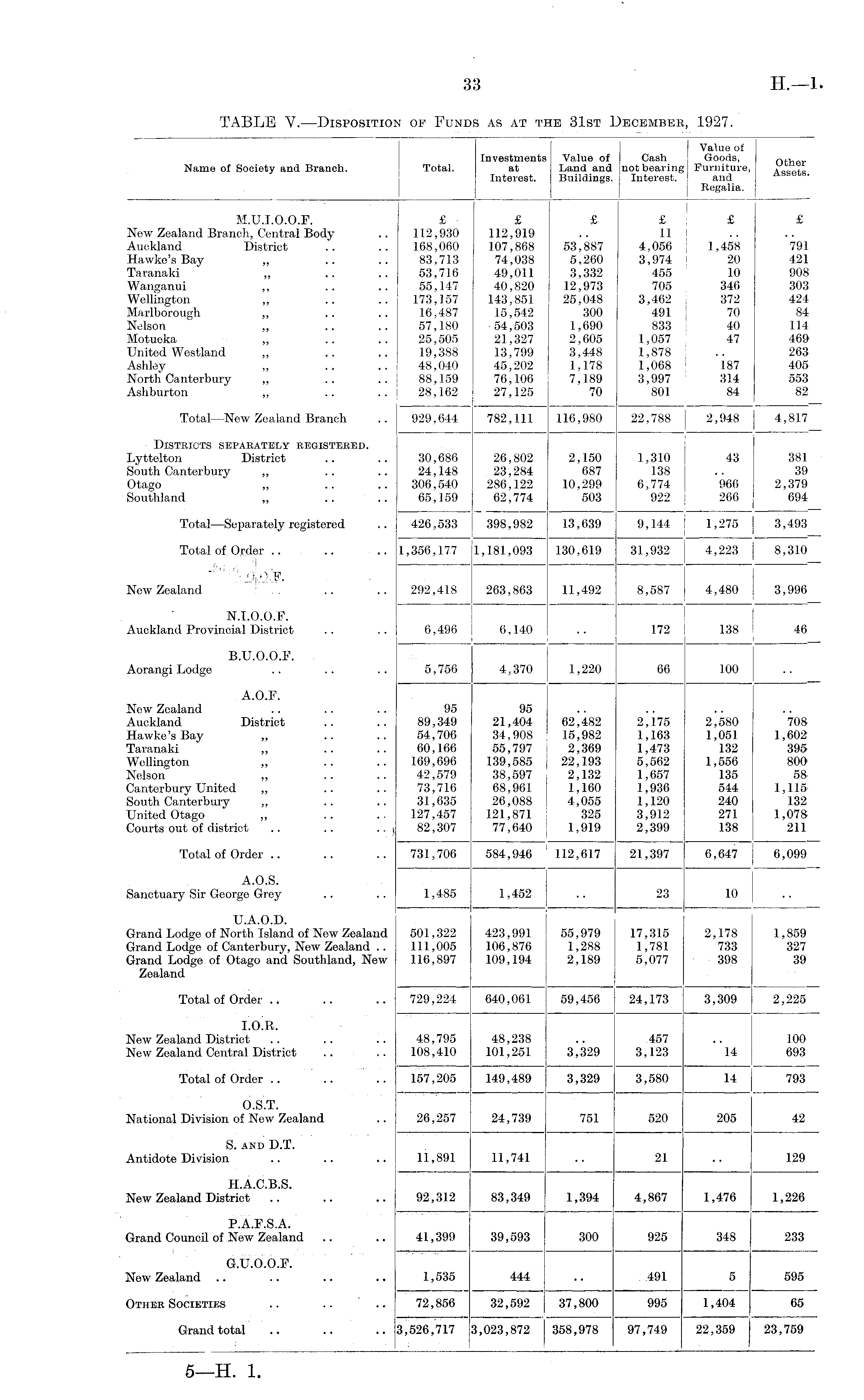 Value of Investments Value of I Cash Goods, Other Name of Society and Branch. Total. at Land and not bearing Furniture, Interest. Buildings. Interest. and Regalia. I ! M.UJ.O.O.F. £ £ £ £ £ £ New Zealand Branch, Central Body .. 112,930 112,919 .. 11 Auckland District .. .. 168,060 107,868 53,887 4,056 1,458 791 Hawke'sBay „ .. .. 83,713 74,038 5,260 3,974 ! 20 421 Taranaki „ .. .. 53,716 49,011 3,332 455 10 908 Wanganui „ .. .. 55,147 40,820 12,973 705 346 303 Wellington „ .. .. 173,157 143,851 25,048 3,462 , 372 424 Marlborough „ .. .. 16,487 15,542 300 491 70 84 Nelson „ .. .. 57,180 54,503 1,690 833 40 114 Motueka „ .. .. 25,505 21,327 2,605 1,057 47 469 United Westland „ .. .. 19,388 13,799 3,448 1,878 .. 263 Ashley „ .. .. 48,040 45,202 1.178 1,068 187 405 North Canterbury „ .. .. 88,159 76,106 7,189 3,997 314 553 Ashburton „ .. .. 28,162 27,125 70 801 j 84 82 Total—New Zealand Branch .. 929,644 782,111 116,980 22,788 j 2,948 I 4,817 Districts separately registered. Lyttelton District .. .. 30,686 26,802 2,150 1,310 43 381 South Canterbury ,, .. .. 24,148 23,284 687 138 .. 39 Otago „ .. .. 306,540 2S6,122 10,299 6,774 966 2,379 Southland „ .. .. 65,159 62,774 503 922 266 694 Total —Separately registered .. 426,533 398,982 13,639 9,144 1,275 J 3,493 Total of Order .. .. .. 1,356,177 1,181,093 130,619 31,932 4,223 j 8,310 " s " . . New Zealand .. .. 292,418 263,863 11,492 8,587 4,480 J 3,996 N.I.O.O.F. Auckland Provincial District .. .. 6,496 6,140 .. 172 j 138 ! 46 B.U.O.O.F. Aorangi Lodge .. .. .. 5,756 4,370 1,220 66 100 A.O.F. New Zealand .. .. .. 95 95 Auckland District .. .. 89,349 21,404 62,482 2,175 2,580 708 Hawke'sBay „ .. .. 54,706 34,908 15,982 1,163 1,051 1.602 Taranaki „ .. .. 60,166 55,797 2,369 1,473 132 395 Wellington „ .. .. 169,696 139,585 22,193 5,562 1,556 800 Nelson „ .. .. 42,579 38,597 2,132 1,657 135 58 Canterbury United „ .. .. 73,716 68,961 1,160 1,936 544 1,115 South Canterbury ,, .. .. 31,635 26,088 4,055 1,120 240 132 United Otago „ .. ... 127,457 121,871 325 3,912 271 1,078 Courts out of district .. .. . . , 82,307 77,640 1,919 2,399 138 211 Total of Order .. .. .. 731,706 584,946 ' 112,617 21,397 6,647 6,099 A.O.S. Sanctuary Sir George Grey .. .. 1,485 1,452 .. 23 10 U.A.O.D. Grand Lodge of North Island of New Zealand 501,322 423,991 55,979 17,315 2,178 1,859 Grand Lodge of Canterbury, New Zealand .. 111,005 106,876 1,288 1,781 733 327 Grand Lodge of Otago and Southland, New 116,897 109,194 2,189 5,077 398 39 Zealand Total of Order .. .. .. 729,224 640,061 59,456 24,173 3,309 2,225 IOR. New Zealand District .. .. .. 48,795 48,238 .. 457 .. 100 New Zealand Central District .. .. 108,410 101,251 3,329 3,123 14 693 Total of Order .. .. .. 157,205 149,489 3,329 3,580 14 793 O.S.T. National Division of New Zealand .. 26,257 24,739 751 520 205 42 S. and D.T. Antidote Division .. .. .. 11,891 11,741 .. 21 .. 129 H A C B S New Zealand District' .. ' .. .. 92,312 83,349 1,394 4,867 1,476 1,226 P.A.F.S.A. Grand Council of New Zealand .. .. 41,399 39,593 300 925 348 233 G.U.O.O.F. New Zealand .. .. .. .. 1,535 444 .. 491 5 595 OTHER Societies .. .. .. 72,856 32,592 37,800 995 1,404 65 Grand total .. .. .. 3,526,717 3,023,872 358,978 97,749 22,359 23,759