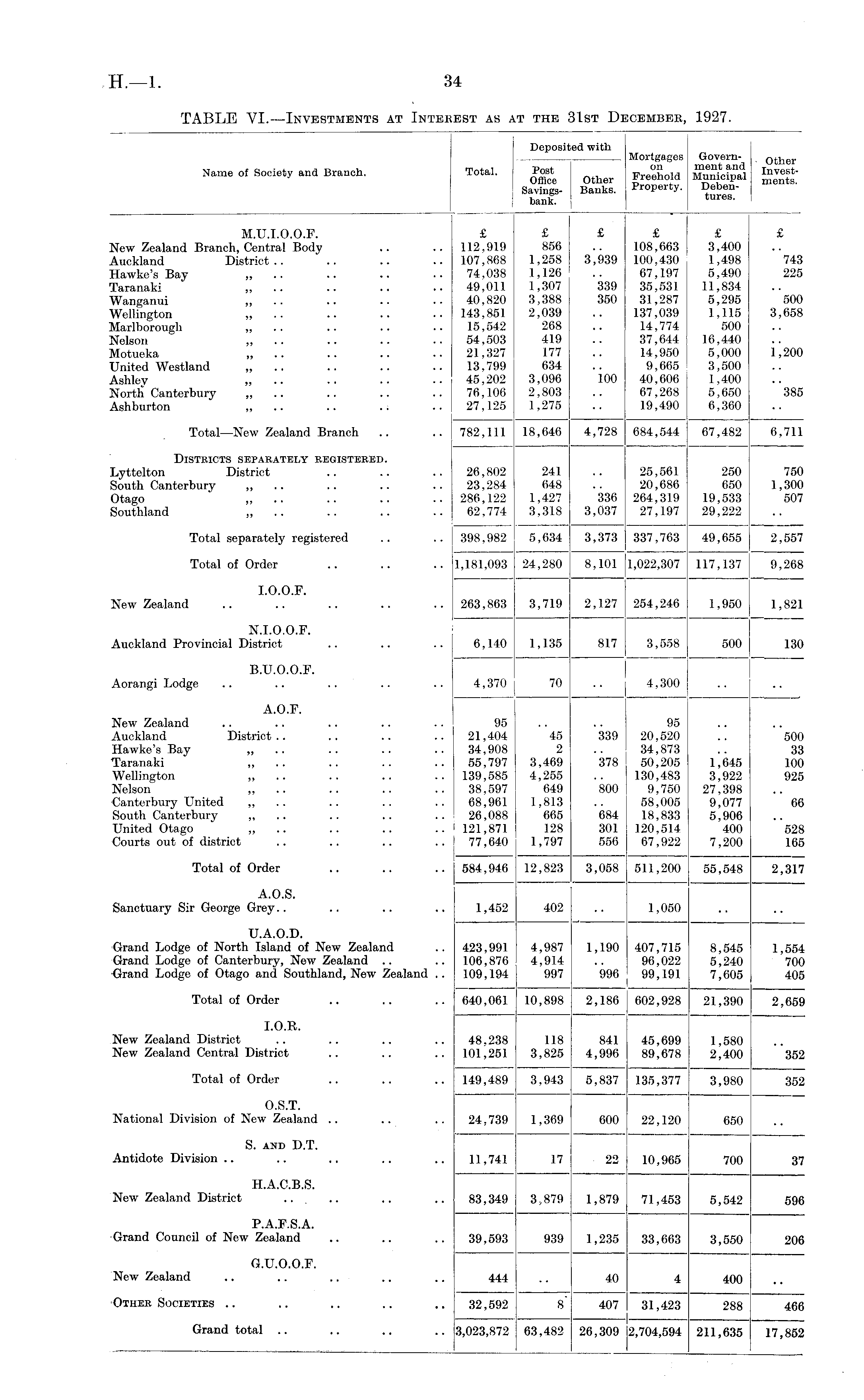 Deposited with Mortgages Govern- _ other Name of Society and Branch. Total. Post Freehold InvestOfflce Other freehold Municipal ments Savings- Banks. Property. Debenbank. tures - M.U.I.O.O.F. £ £ £ £ £ £ New Zealand Branch, Central Body .. .. 112,919 856 .. 108,663 3,400 Auckland District.. .. .. ..107,868 1,258 3,939 100,430 1,498 743 Hawke's Bay „ .. .. .. .. 74,038 1,126 .. 67,197 5,490 225 Taranaki „ .. .. .. 49,011 1,307 339 35,531 11,834 Wanganui „ .. .. .. .. 40,820 3,388 350 31,287 5,295 500 Wellington „ .. .. .. .. 143,851 2,039 .. 137,039 1,115 3,658 Marlborough „ .. .. .. .. 15,542 268 .. 14,774 500 Nelson „ .. .. .. 54,503 419 .. 37,644 16,440 Motueka „ .. .. .. .. 21,327 177 .. 14,950 5,000 1,200 United Westland „ .. .. .. .. 13,799 634 .. 9,665 3,500 Ashlev „ 45,202 3,096 100 40.606 1,400 North Canterbury „ .. .. .. .. 76,106 2,803 .. 67,268 5,650 385 Ashburton „ .. .. .. .. 27,125 1,275 .. 19,490 6,360 Total—New Zealand Branch .. .. 782,111 18,646 4,728 684,544 67,482 6,711 Districts separately registered. Lyttelton District .. .. .. 26,802 241 .. 25,561 250 750 South Canterbury ,, .. .. .. 23,284 648 .. 20,686 650 1,300 Otago „ .. .. .. .. 286,122 1,427 336 264,319 19,533 507 Southland „ .. .. .. 62,774 3,318 3,037 27,197 29,222 Total separately registered .. .. 398,982 5,634 3,373 337,763 49,655 2,557 Total of Order .. .. .. 1,181,093 24,280 8,101 1,022,307 117,137 9,268 I.O.O.F. New Zealand .. .. .. .. .. 263,863 3,719 2,127 254,246 1,950 1,821 N.I.O.O.F. Auckland Provincial District .. .. .. 6,140 1,135 817 3,558 500 130 B.U.O.O.F. Aorangi Lodge .. .. .. .. .. 4,370 70 .. 4,300 A.O.F. New Zealand .. .. .. .. .. 95 .. .. 95 Auckland District.. .. .. .. 21,404 45 339 20,520 .. 500 Hawke's Bay . .. .. .. 34,908 2 .. 34,873 .. 33 Taranaki „ .. .. .. .. 55,797 3,469 378 50,205 1,645 100 Wellington „ .. .. .. 139,585 4,255 .. 130,483 3,922 925 Nelson „ .. .. .. 38,597 649 800 9,750 27,398 Canterbury United „ .. .. .. 68,961 1,813 .. 58,005 9,077 66 South Canterbury „ .. .. .. 26,088 665 684 18,833 5,906 United Otago „ .. .. .. i 121,871 128 301 120,514 400 528 Courts out of district .. .. .. .. 77,640 1,797 556 67,922 7,200 165 Total of Order .. .. .. 584,946 12,823 3,058 511,200 55,548 2,317 A.O.S. Sanctuary Sir George Grey.. .. .. .. 1,452 402 .. 1,050 U.A.O.D. Grand Lodge of North Island of New Zealand .. 423,991 4,987 1,190 407,715 8,545 1,554 Grand Lodge of Canterbury, New Zealand .. .. 106,876 4,914 .. 96,022 5,240 700 Grand Lodge of Otago and Southland, New Zealand .. 109,194 997 996 99,191 7,605 405 Total of Order .. .. .. 640,061 10,898 2,186 602,928 21,390 2,659 I.O.R. New Zealand District .. .. .. .. 48,238 118 841 45,699 1,580 New Zealand Central District .. .. .. 101,251 3,825 4,996 89,678 2,400 352 Total of Order .. .. .. 149,489 3,943 5,837 135,377 3,980 352 O.S.T. National Division of New Zealand .. .. .. 24,739 1,369 600 22,120 650 S. and D.T. Antidote Division .. .. .. .. .. 11,741 17 22 10,965 700 37 H.A.C.B.S. New Zealand District .. .. .. .. 83,349 3,879 1,879 71,453 5,542 596 P.A.F.S.A. Grand Council of New Zealand .. .. .. 39,593 939 1,235 33,663 3,550 206 G.U.O.O.F. New Zealand .. .. .. .. .. 444 . ; 40 4 400 OTHER Societies .. .. .. .. .. 32,592 8' 407 31,423 288 466 Grand total .. .. .. .. 3,023,872 63,482 26,309 2,704,594 211,635 17,852