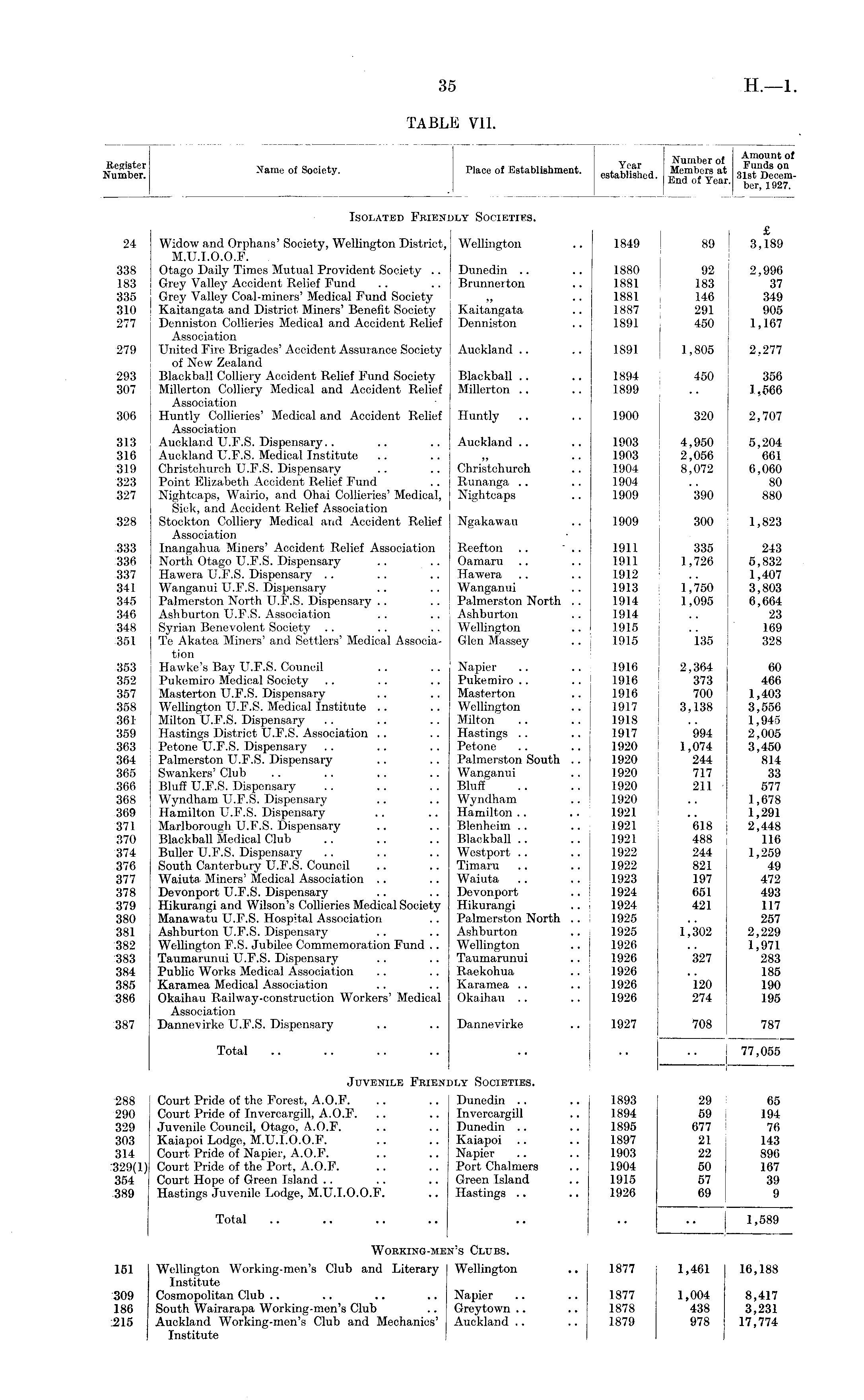 Number of Amouut of Number" Name of Society. Place of Establishment. est JS e d. fr SUtD^cemJina or Year. berj 102 7 Isolated Friendly Societies. £ 24 Widow and Orphans'Society, Wellington District, Wellington .. 1849 89 ! 3,189 M.U.I.O.O.F. 338 Otago Daily Times Mutual Provident Society .. Dunedin .. .. 1880 92 2,996 183 Grey Valley Accident Relief Fund .. .. Brunnerton .. 1881 183 37 335 Grey Valley Coal-miners' Medical Fund Society „ .. 1881 146 349 310 Kaitangata and District Miners' Benefit Society Kaitangata .. 1887 291 905 277 Denniston Collieries Medical and Accident Relief Denniston .. 1891 450 1,167 Association 279 United Fire Brigades'Accident Assurance Society Auckland.. .. 1891 1,805 2,277 of New Zealand 293 Blackball Colliery Accident Relief Fund Society Blackball .. .. 1894 450 356 307 Millerton Colliery Medical and Accident Relief Millerton .. .. 1899 .. 1,566 Association 306 Huntly Collieries' Medical and Accident Relief Huntly .. .. 1900 320 2,707 Association 313 Auckland U.F.S. Dispensary.. .. .. Auckland .. .. 1903 4,950 5,204 316 Auckland U.F.S. Medical Institute .. .. ,, .. 1903 2,056 661 319 Christchurch U.F.S. Dispensary .. .. Christchurch .. 1904 8,072 6,060 323 Point Elizabeth Accident Relief Fund .. Runanga .. .. 1904 .. 80 .327 Nightcaps, Wairio, and Ohai Collieries' Medical, Nightcaps .. 1909 390 880 Sick, and Accident Relief Association 328 Stockton Colliery Medical and Accident Relief Ngakawau .. 1909 300 1,823 Association 333 Inangaliua Miners' Accident Relief Association Reefton .. ' 1911 335 243 336 North Otago U.F.S. Dispensary .. .. Oamaru .. .. 1911 1,726 5,832 337 Hawera U.F.S. Dispensary .. .. .. Hawera .. .. 1912 .. 1,407 341 Wanganui U.F.S. Dispensary .. .. Wanganui .. 1913 1,750 3,803 345 Palmerston North U.F.S. Dispensary .. .. Palmerston North .. 1914 1,095 6,664 346 Ashburton U.F.S. Association .. .. Ashburton .. 1914 .. 23 348 Syrian Benevolent Society .. .. .. Wellington .. 1915 .. 169 351 Te Akatea Miners' and Settlers' Medical Associa- Glen Massey .. j 1915 135 328 tion 353 Hawke's Bay U.F.S. Council .. .. Napier .. .. 1916 2,364 60 352 Pukemiro Medical Society .. .. .. Pukemiro .. .. 1916 373 466 357 Masterton U.F.S. Dispensary .. .. Masterton .. 1916 700 1,403 358 Wellington U.F.S. Medical Institute .. .. Wellington .. 1917 3,138 3,556 361- Milton U.F.S. Dispensary .. .. .. Milton .. .. 1918 .. 1,945 359 Hastings District U.F.S. Association .. .. Hastings .. .. 1917 994 2,005 363 Petone U.F.S. Dispensary .. .. .. Petone .. .. 1920 1,074 3,450 364 Palmerston U.F.S. Dispensary .. .. Palmerston South .. 1920 244 814 365 Swankers'Club .. .. .. .. Wanganui .. 1920 717 33 366 Bluff U.F.S. Dispensary .. .. .. Bluff' .. .. 1920 211 577 368 Wyndham U.F.S. Dispensary .. .. Wyndham .. 1920 .. 1,678 369 Hamilton U.F.S. Dispensary .. .. Hamilton.. .. 1921 .. 1,291 371 Marlborough U.F.S. Dispensary .. .. Blenheim .. .. 1921 618 2,448 370 Blackball Medical Club .. .. .. Blackball .. .. 1921 488 116 374 Buller U.F.S. Dispensary .. .. .. Westport .. .. 1922 244 1,259 376 South Canterbury U.F.S. Council .. .. Timaru .. .. 1922 821 49 377 Waiuta Miners' Medical Association .. .. Waiuta .. .. 1923 197 472 378 Devonport U.F.S. Dispensary .. .. Devonport .. 1924 651 493 379 Hikurangi and Wilson's Collieries Medical Society Hikurangi .. 1924 421 117 380 Manawatu U.F.S. Hospital Association .. Palmerston North .. 1925 .. 257 381 Ashburton U.F.S. Dispensary .. .. Ashburton .. 1925 1,302 2,229 382 Wellington F.S. Jubilee Commemoration Fund .. Wellington .. 1926 .. 1,971 383 Taumarunui U.F.S. Dispensary .. .. Taumarunui .. 1926 327 283 384 Public Works Medical Association .. .. Raekohua .. 1926 .. 185 385 Karamea Medical Association .. .. Karamea .. .. 1926 120 190 386 Okaihau Railway-construction Workers' Medical Okaihau .. .. 1926 274 195 Association 387 Dannevirke U.F.S. Dispensary .. .. Dannevirke .. 1927 708 787 Total .. .. .. .. .. .. | 77,055 Juvenile Friendly Societies. 288 Court Pride of the Forest, A.O.F. .. .. Dunedin .. .. 1893 29 65 290 Court Pride of Inveroargill, A.O.F. .. .. Invercargill .. 1894 59 194 329 Juvenile Council, Otago, A.O.F. .. .. Dunedin .. .. 1895 677 76 303 Kaiapoi Lodge, M.U.I.O.O.F. .. .. Kaiapoi .. .. 1897 21 143 314 Court Pride of Napier, A.O.F. .. .. Napier .. .. 1903 22 896 :329(1) Court Pride of the Port, A.O.F. .. .. Port Chalmers .. 1904 50 167 354 Court Hope of Green Island .. .. .. Green Island .. 1915 57 39 389 Hastings Juvenile Lodge, M.U.I.O.O.F. .. Hastings .. .. 1926 69 9 Total .. .. .. .. .. .. j 1,589 Working-men's Clubs. 151 Wellington Working-men's Club and Literary Wellington .. 1877 1,461 16,188 Institute 309 Cosmopolitan Club .. .. .. .. Napier .. .. 1877 1,004 8,417 186 South Wairarapa Working-men's Club .. Greytown .. .. 1878 438 3,231 215 Auckland Working-men's Club and Mechanics' Auckland .. .. 1879 978 17,774 Institute