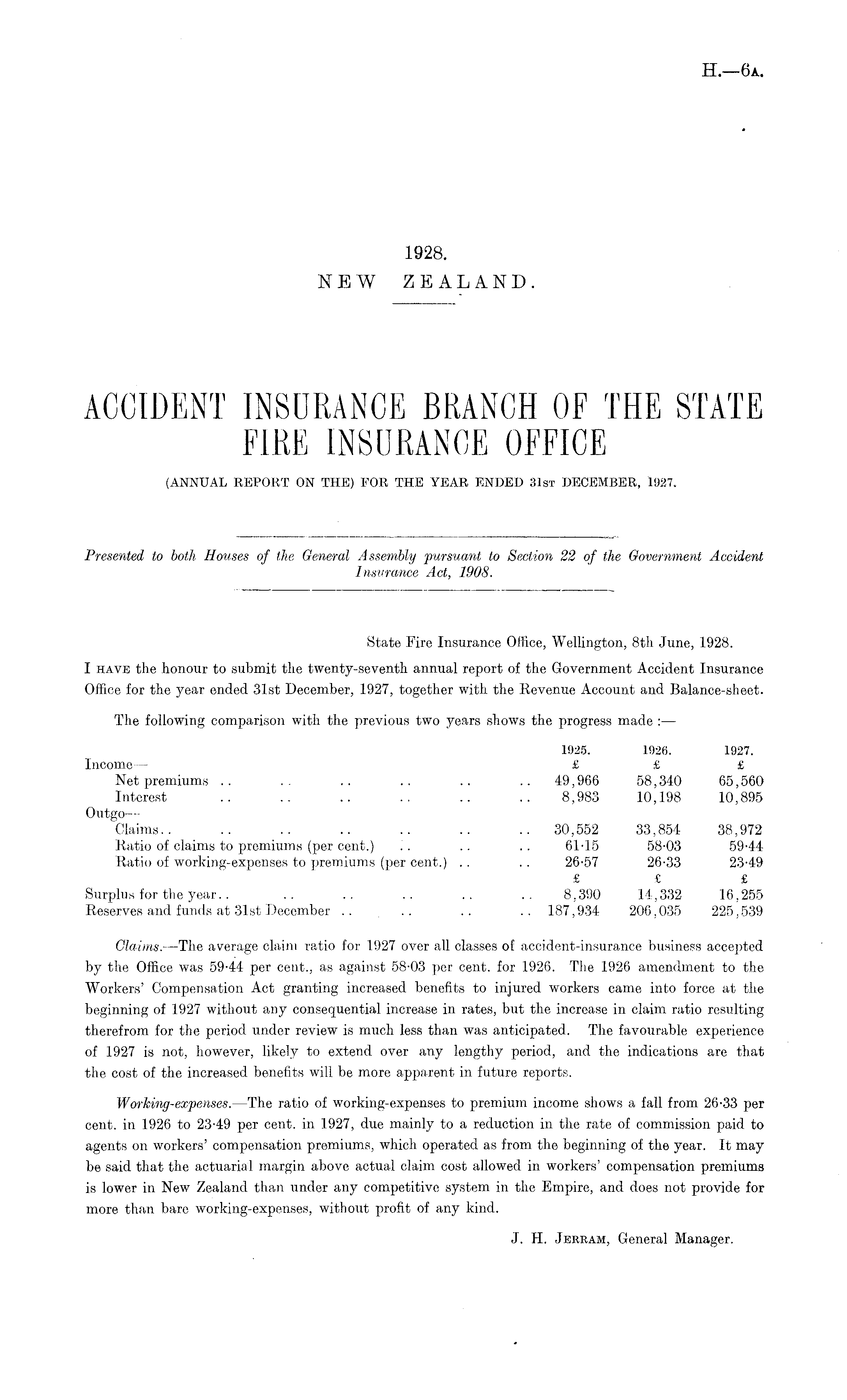 State Fire Insurance Office, Wellington, Bth June, 1928. I have the honour to submit the twenty-seventh annual report of the Government Accident Insurance Office for the year ended 31st December, 1927, together with the Revenue Account and Balance-sheet. The following comparison with the previous two years shows the progress made : — 1925. 1926. 1927. Income— £ £ £ Net premiums .. . . .. .. .. .. 49,966 58,340 65,560 Interest .. .. .. .. .. .. 8,983 10,198 10,895 Outgo — Claims.. .. .. .. .. .. .. 30,552 33,854 38,972 Ratio of claims to premiums (per cent.) .. .. .. 61-15 58-03 59-44 Ratio of working-expenses to premiums (per cent.) .. .. 26-57 26-33 23-49 £ £ £ Surplus for the year.. .. .. .. .. .. 8,390 14,332 16,255 Reserves and funds at 31st December .. .. .. .. 187,934 206,035 225,539 Claims. —The average claim ratio for 1927 over all classes of accident-insurance business accepted by the Office was 59-44 per cent., as against 58-03 per cent, for 1926. The 1926 amendment to the Workers' Compensation Act granting increased benefits to injured workers came into force at the beginning of 1927 without any consequential increase in rates, but the increase in claim ratio resulting therefrom for the period under review is much less than was anticipated. The favourable experience of 1927 is not, however, likely to extend over any lengthy period, and the indications are that the cost of the increased benefits will be more apparent in future reports. Working-expenses. —The ratio of working-expenses to premium income shows a fall from 26-33 per cent, in 1926 to 23-49 per cent, in 1927, due mainly to a reduction in the rate of commission paid to agents on workers' compensation premiums, which operated as from the beginning of the year. It may be said that the actuarial margin above actual claim cost allowed in workers' compensation premiums is lower in New Zealand than under any competitive system in the Empire, and does not provide for more than bare working-expenses, without profit of any kind. J. H. Jerram, General Manager.