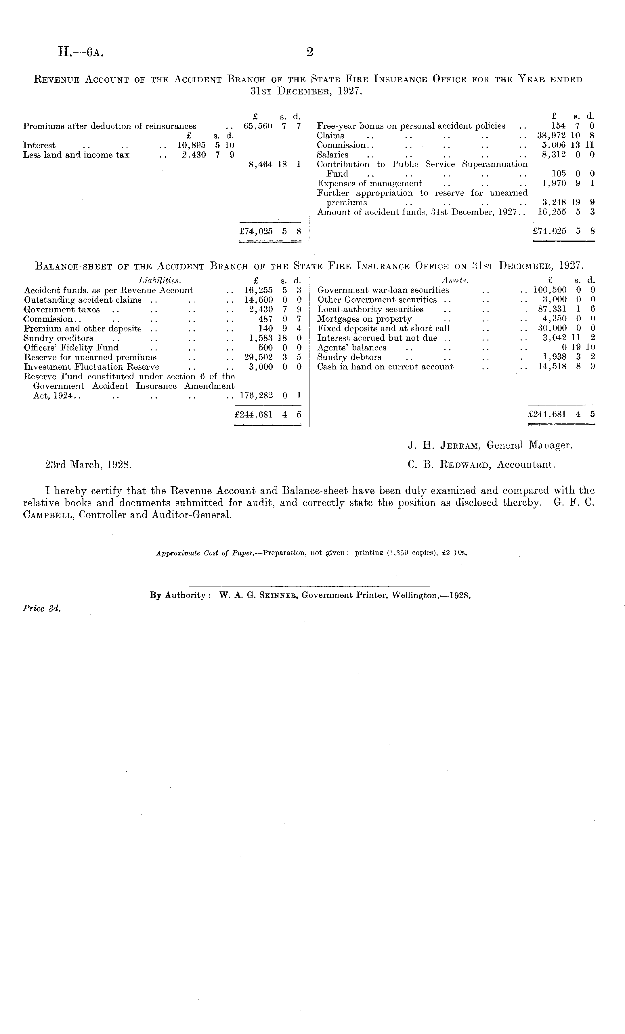 Revenue Account of the Accident Branch of the State Fire Insurance Office for the Year ended 31st December, 1927. £ s. d. £ s. d. Premiums after deduction of reinsurances .. 65,560 7 7 Free-year bonus on personal accident policies .. 154 7 0 £ s. d. Claims .. .. .. .. .. 38,972 10 8 Interest .. .. .. 10,895 510 Commission.. .. .. .. .. 5,006 13 11 Less land and income tax .. 2,430 7 9 Salaries .. .. .. .. .. 8,312 0 0 8,464 18 1 Contribution to Public Service Superannuation Fund .. .. .. .. .. 105 0 0 Expenses of management .. .. .. 1,970 9 1 Further appropriation to reserve for unearned premiums .. .. .. .. 3,248 19 9 Amount of accident funds, 31st December, 1927.. 16,255 5 3 £74,025 5 8 £74,025 5 8 Balance-sheet of the Accident Branch of the State Fire Insurance Office on 31st December, 1927. Liabilities. £ s. d. Assets. £ s. d. Accident funds, as per Revenue Account .. 16,255 5 3 Government war-loan securities .. .. 100,500 0 0 Outstanding accident claims .. .. .. 14,600 0 0 Other Government securities .. .. .. 3,000 0 0 Government taxes .. .. .. .. 2,430 7 9 Local-authority securities .. .. . 87,331 1 6 Commission.. .. .. .. .. 487 0 7 Mortgages on property . . .. .. 4,350 0 0 Premium and other deposits .. .. .. 140 9 4 Fixed deposits and at short call .. .. 30,000 0 0 Sundry creditors .. .. .. .. 1,583 18 0 Interest accrued but not due .. .. .. 3,042 11 2 Officers' Fidelity Fund .. .. .. 500 0 0 Agents'balances .. .. .. .. 01910 Reserve for unearned premiums .. .. 29,502 3 5 Sundry debtors .. . . .. .. 1,938 3 2 Investment Fluctuation Reserve .. .. 3,000 0 0 Cash in hand on current account .. .. 14,518 8 9 Reserve Fund constituted under section 6 of the Government Accident Insurance Amendment Act, 1924.. .. .. .. .. 176,282 0 1 £244,681 4 5 £244,681 4 5 J. H. Jekram, General Manager. 23rd March, 1928. 0. B. Bedwakd, Accountant. I hereby certify that the Revenue Account and Balance-sheet have been duly examined and compared with the relative books and documents submitted for audit, and correctly state the position as disclosed thereby. —G. F. C. Campbell, Controller and Auditor-General.