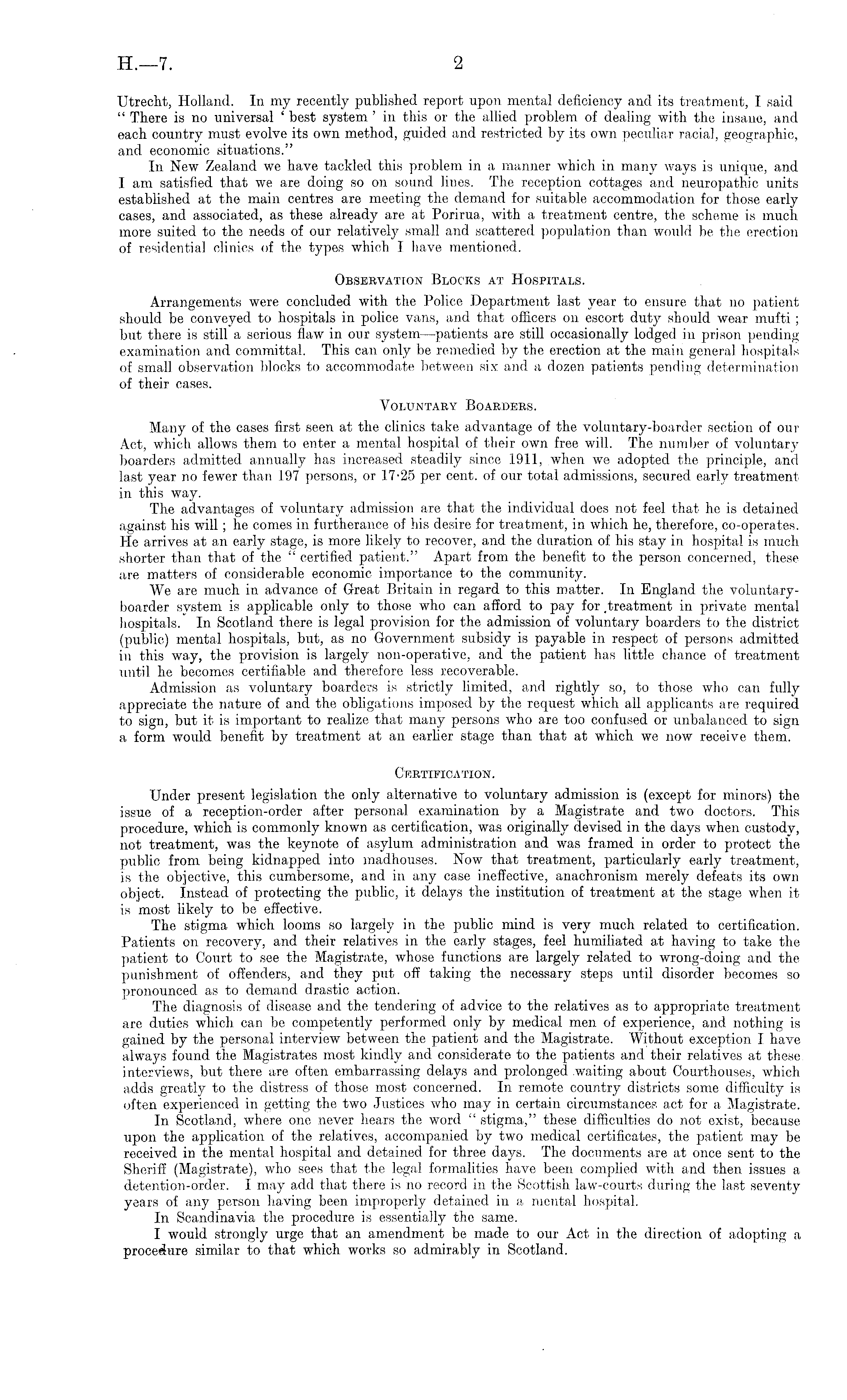 Utrecht, Holland. In my recently published report upon mental deficiency and its treatment, I said " There is no universal ' best system ' in this or the allied problem of dealing with the insane, and each country must evolve its own method, guided and restricted by its own peculiar racial, geographic, and economic situations." In New Zealand we have tackled this problem in a manner which in many ways is unique, and I am satisfied that we are doing so on sound lines. The reception cottages and neuropathic units established at the main centres are meeting the demand for suitable accommodation for those early cases, and associated, as these already are at Porirua, with a treatment centre, the scheme is much more suited to the needs of our relatively small and scattered population than would be the erection of residential clinics of the types which I have mentioned. Observation Blocks at Hospitals. Arrangements were concluded with the Police Department last year to ensure that no patient should be conveyed to hospitals in police vans, and that officers on escort duty should wear mufti ; but there is still a serious flaw in our system —patients are still occasionally lodged in prison pending examination and committal. This can only be remedied by the erection at the main general hospitals of small observation blocks to accommodate between six and a dozen patients pending determination of their cases. Voluntary Boarders. Many of the cases first seen at the clinics take advantage of the voluntary-boarder section of our Act, which allows them to enter a mental hospital of their own free will. The number of voluntary boarders admitted annually has increased steadily since 1911, when we adopted the principle, and last year no fewer than 197 persons, or 17-25 per cent, of our total admissions, secured early treatment in this way. The advantages of voluntary admission are that the individual does not feel that he is detained against his will; he comes in furtherance of his desire for treatment, in which he, therefore, co-operates. He arrives at an early stage, is more likely to recover, and the duration of his stay in hospital is much shorter than that of the " certified patient." Apart from the benefit to the person concerned, these are matters of considerable economic importance to the community. We are much in advance of Great Britain in regard to this matter. In England the voluntaryboarder svstem is applicable only to those who can afford to pay for .treatment in private mental hospitals. In Scotland there is legal provision for the admission of voluntary boarders to the district (public) mental hospitals, but, as no Government subsidy is payable in respect of persons admitted in this way, the provision is largely non-operative, and the patient has little chance of treatment until he becomes certifiable and therefore less recoverable. Admission as voluntary boarders is strictly limited, and rightly so, to those who can fully appreciate the nature of and the obligations imposed by the request which all applicants are required to sign, but it is important to realize that many persons who are too confused or unbalanced to sign a form would benefit by treatment at an earlier stage than that at which we now receive them. Certification. Under present legislation the only alternative to voluntary admission is (except for minors) the issue of a reception-order after personal examination by a Magistrate and two doctors. This procedure, which is commonly known as certification, was originally devised in the days when custody, not treatment, was the keynote of asylum administration and was framed in order to protect the public from being kidnapped into madhouses. Now that treatment, particularly early treatment, is the objective, this cumbersome, and in any case ineffective, anachronism merely defeats its own object. Instead of protecting the public, it delays the institution of treatment at the stage when it is most likely to be effective. The stigma which looms so largely in the public mind is very much related to certification. Patients on recovery, and their relatives in the early stages, feel humiliated at having to take the patient to Court to see the Magistrate, whose functions are largely related to wrong-doing and the punishment of offenders, and they put off taking the necessary steps until disorder becomes so pronounced as to demand drastic action. The diagnosis of disease and the tendering of advice to the relatives as to appropriate treatment are duties which can be competently performed only by medical men of experience, and nothing is gained by the personal interview between the patient and the Magistrate. Without exception I have always found the Magistrates most kindly and considerate to the patients and their relatives at these interviews, but there are often embarrassing delays and prolonged waiting about Courthouses, which adds greatly to the distress of those most concerned. In remote country districts some difficulty is often experienced in getting the two Justices who may in certain circumstances act for a Magistrate. In Scotland, where one never hears the word " stigma," these difficulties do not exist, because upon the application of the relatives, accompanied by two medical certificates, the patient may be received in the mental hospital and detained for three days. The documents are at once sent to the Sheriff (Magistrate), who sees that the legal formalities have been complied with and then issues a detention-order. I may add that there is no record in the Scottish law-courts during the last seventy years of any person having been improperly detained in a mental hospital. In Scandinavia the procedure is essentially the same. I would strongly urge that an amendment be made to our Act in the direction of adopting a procedure similar to that which works so admirably in Scotland.
