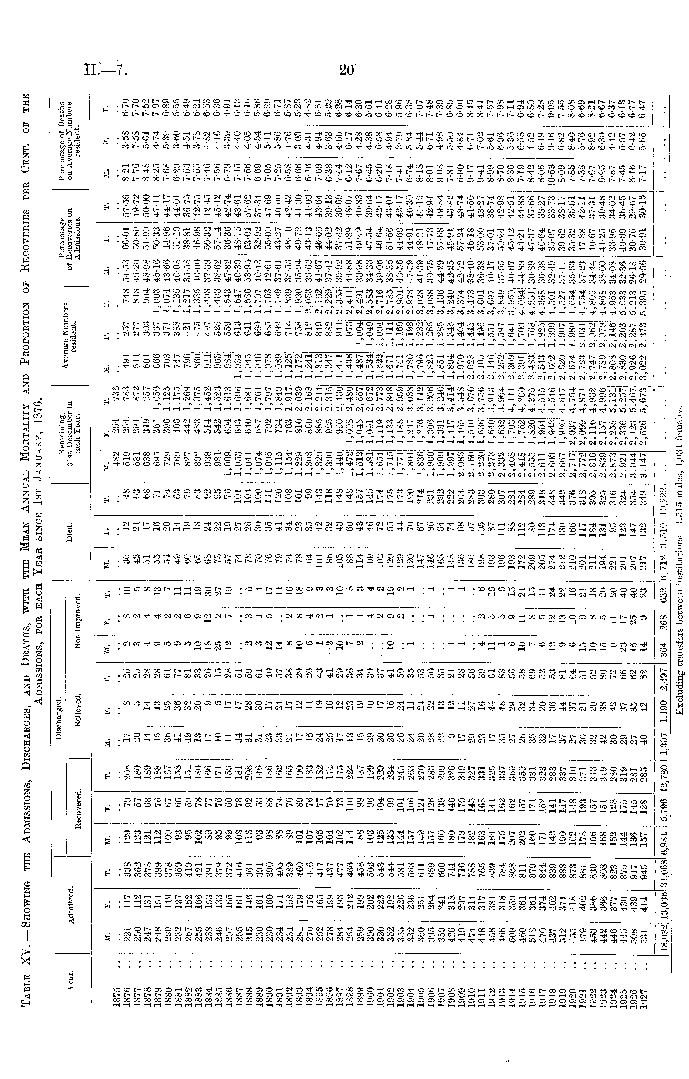 Table XV.—Showing the Admissions, Discharges, and Deaths, with the Mean Annual Mortality and Proportion of Recoveries per Cent. of the Admissions, for each Year since 1st January, 1876.