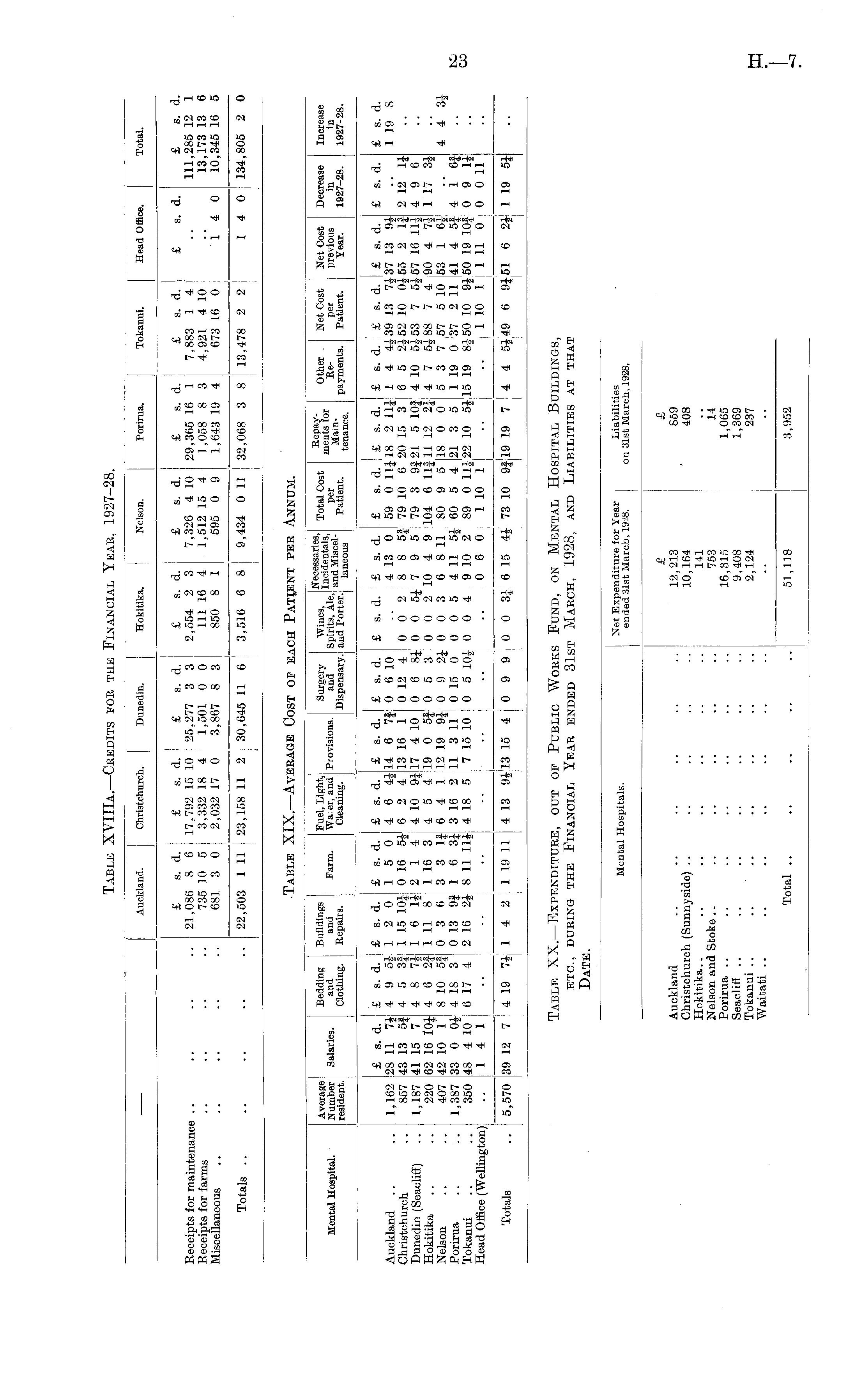 XJ AXJJ1. Mpntnl Hnsnitals 1 Net Expenditure for Year Liabilities Mental Hospitals. ended 31st March, 19J8. i on 31st March, 1928. | I £ £ Auckland .. .. .. .. .. .. 12,213 859 Christchureh (Sunnyside) .. .. .. .. 10,164 ' 408 Hokitika.. .. .. .. .. .. .. 141 Nelson and Stoke.. .. .. .. .. .. 753 14 Porirua .. .. .. .. .. .. .. 16,315 1,065 Seaclifi .. .. .. .. .. .. 9,408 1,369 Tokanui .. .. .. .. .. .. .. 2,124 237 Waitati Total .. .. .. .. .. 51,118 3,952